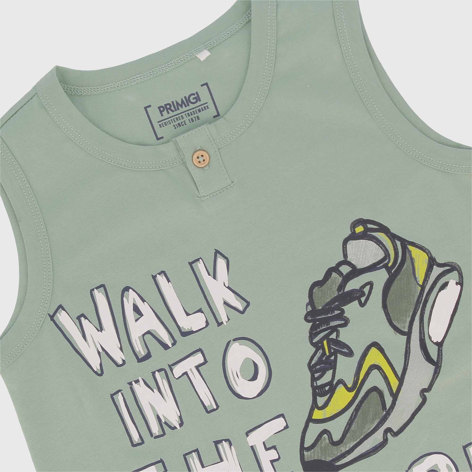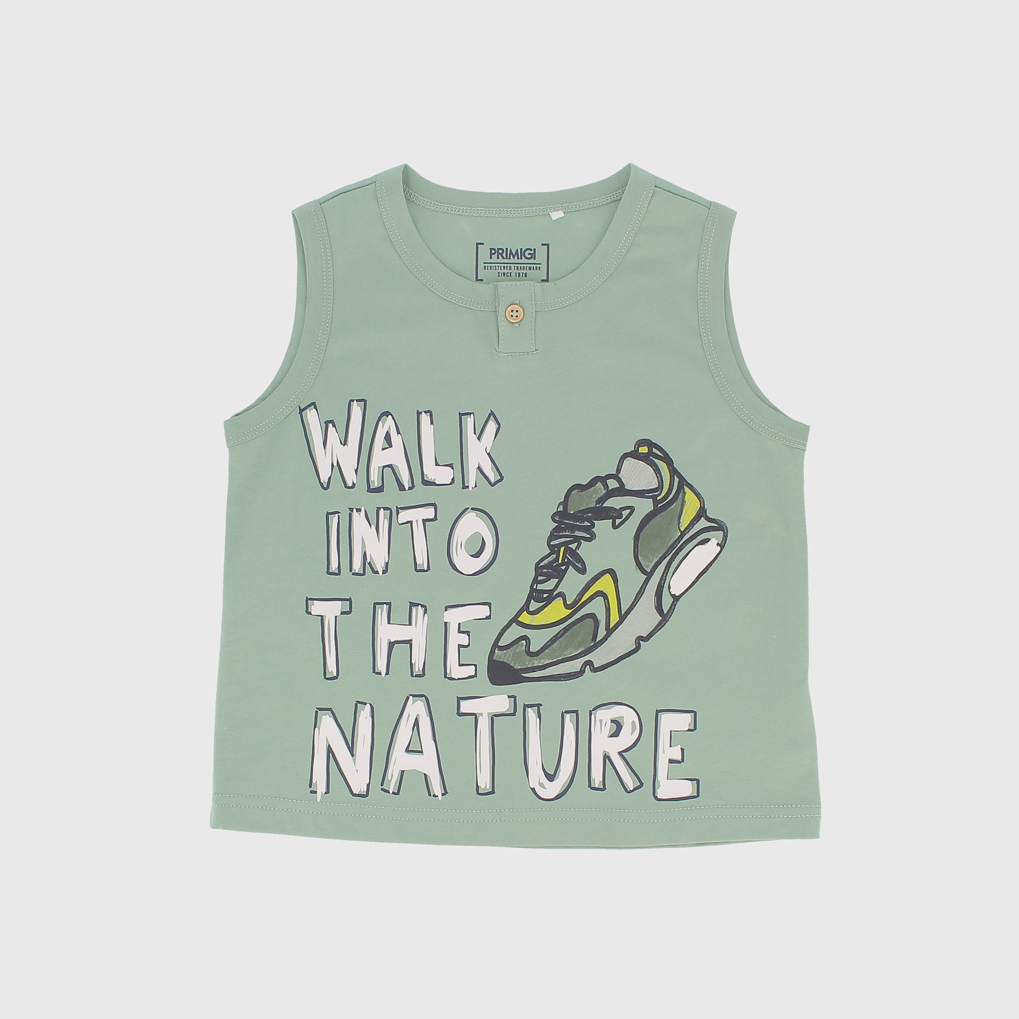 Canotta in jersey girocollo. Chiusura frontale con bottoncino in legno sullo scollo. Stampa sul davanti.