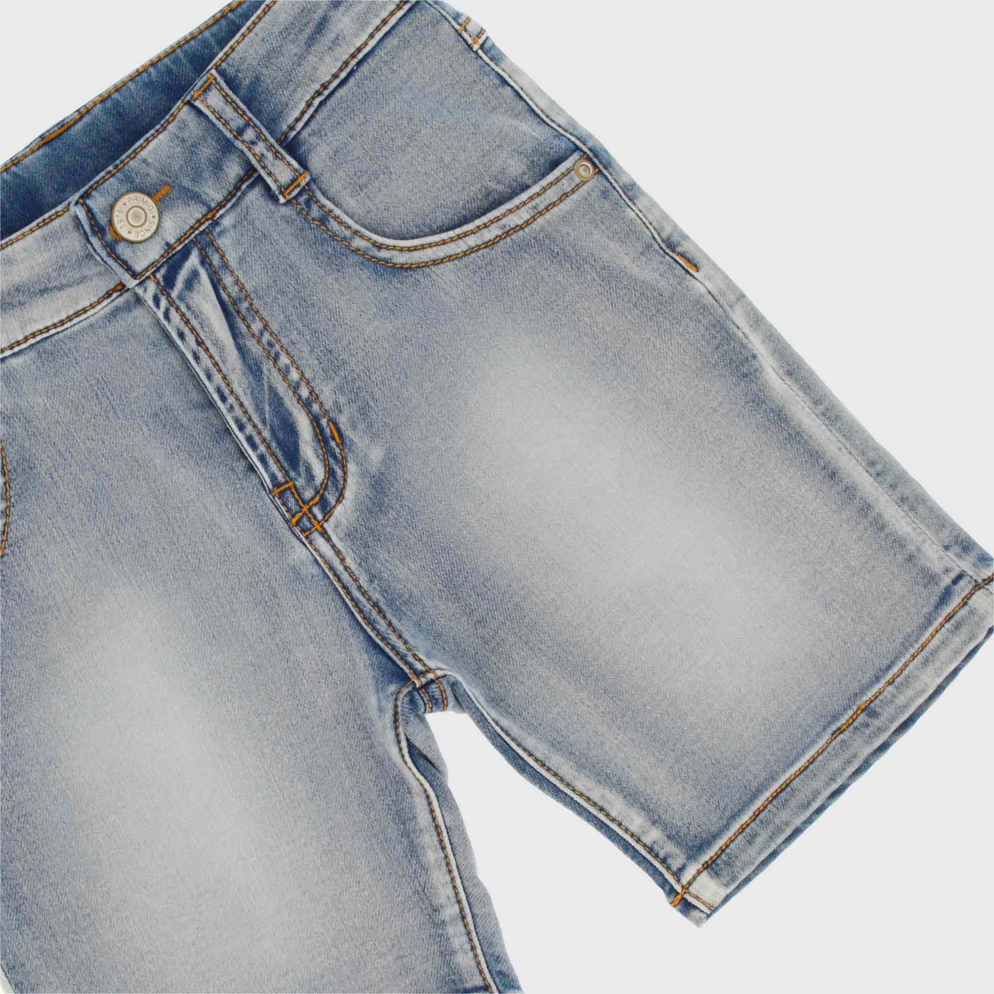 Shorts in jeans a maglia con vita regolabile all'interno. Cinque tasche.