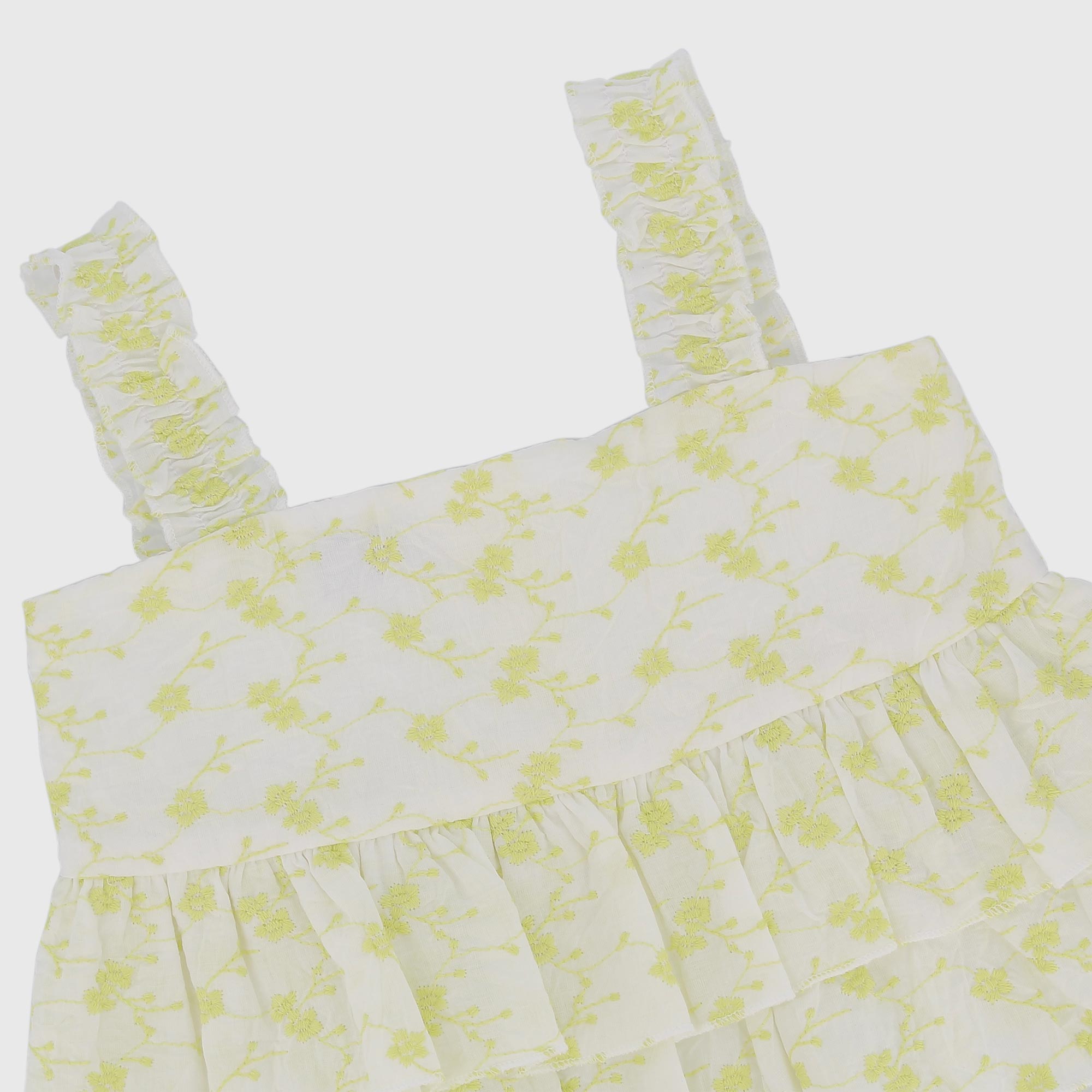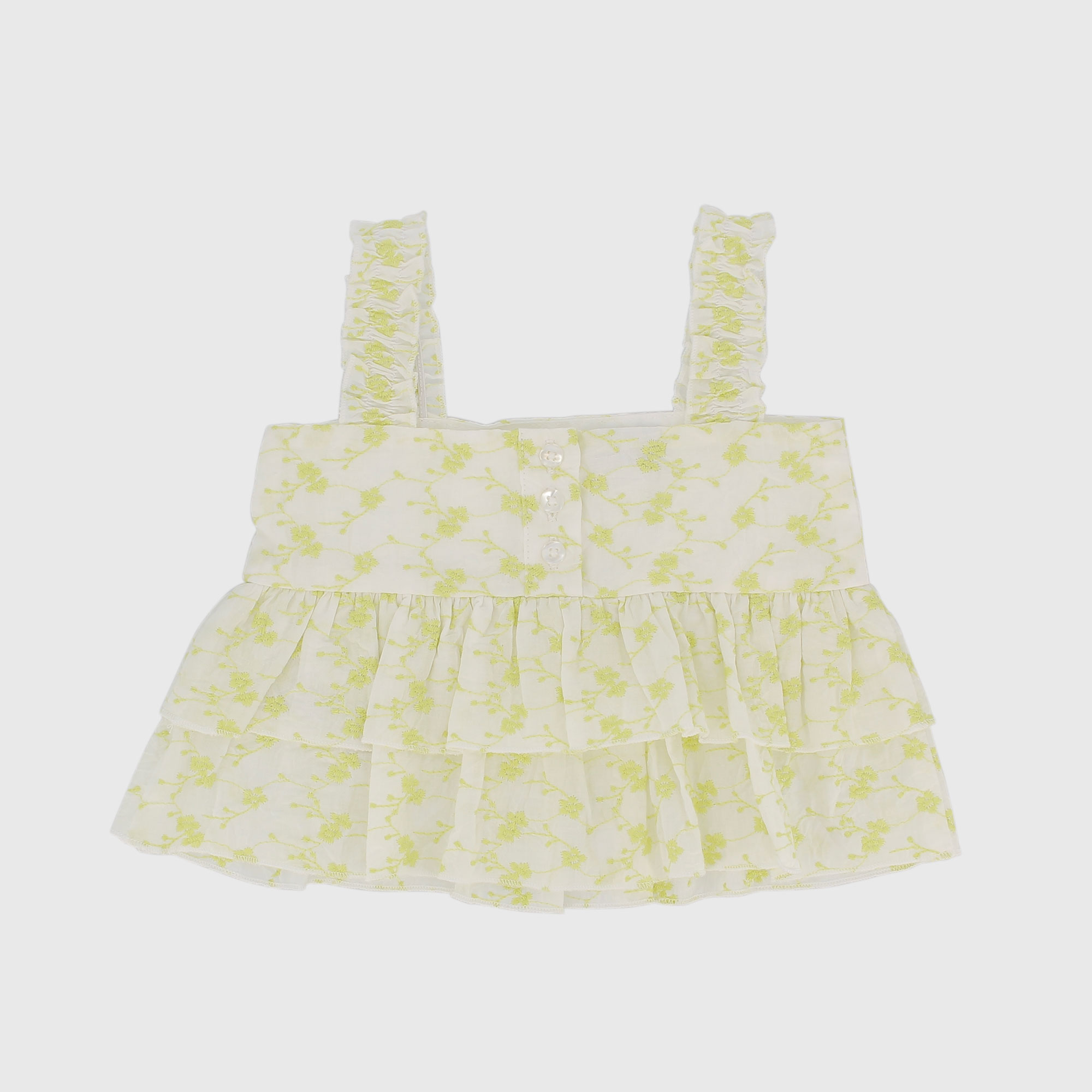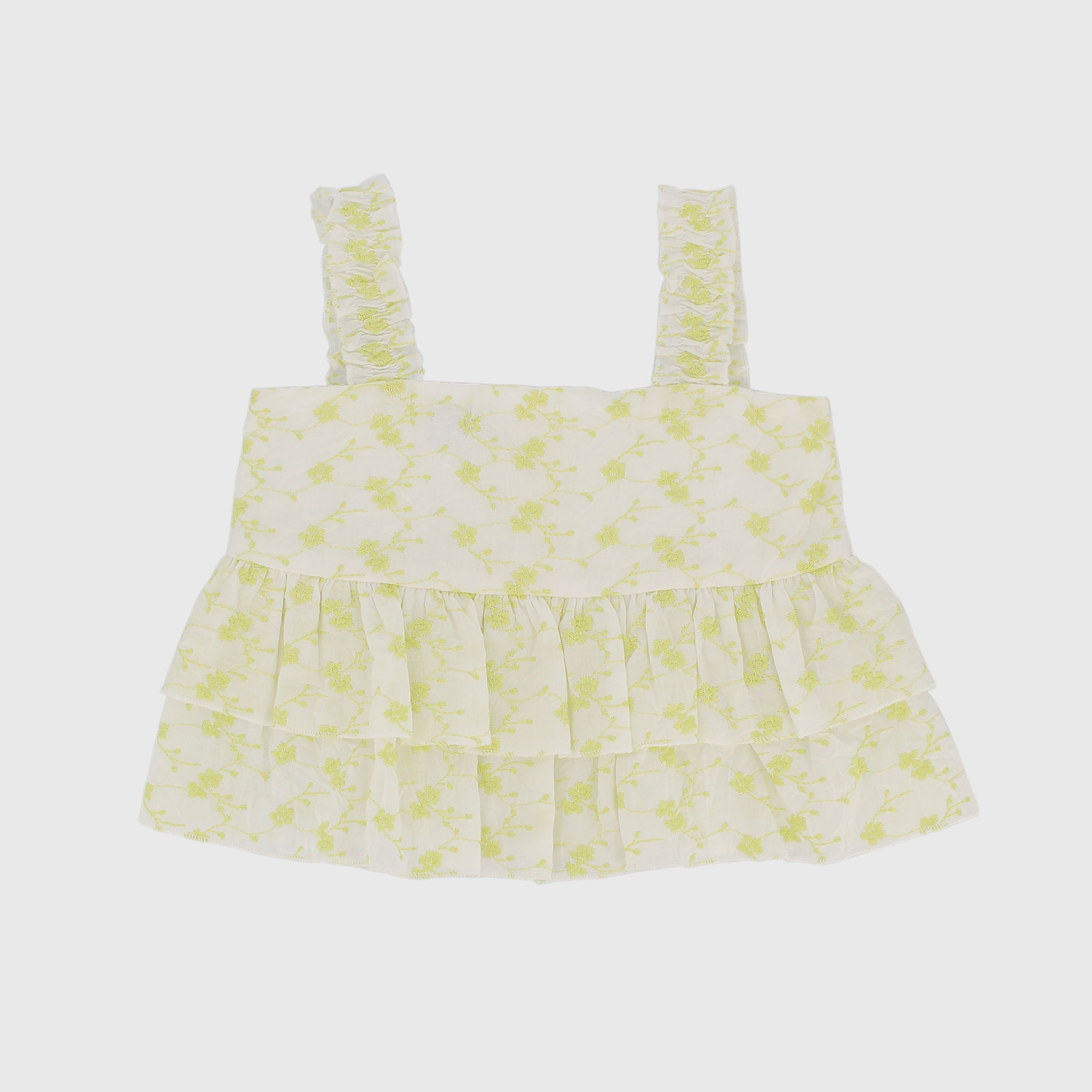 Top in cotone ricamato con bretelle e volants. Chiusura posteriore con bottoni.