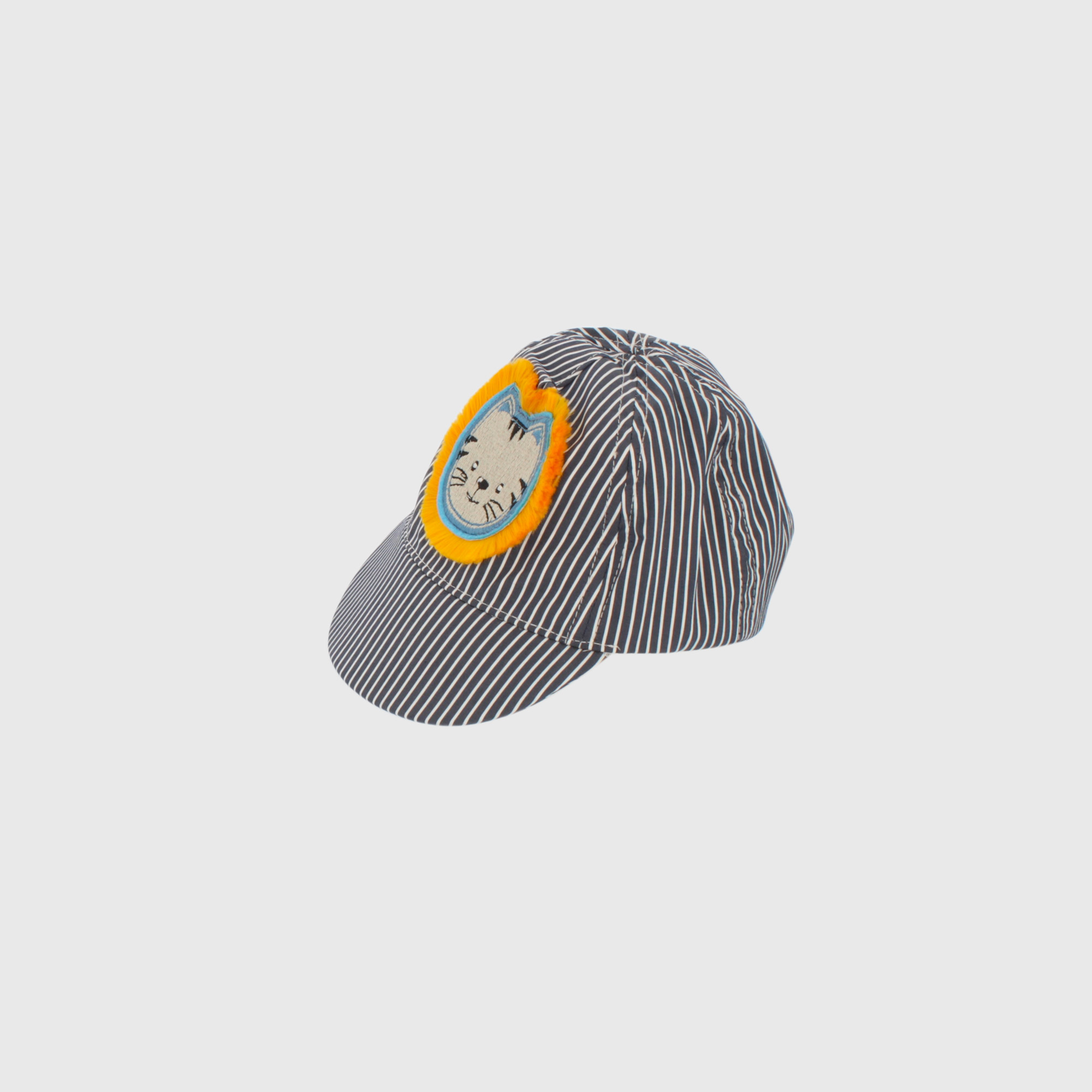 Cappellino baseball a righe con gattino ricamato. Nastro in velcro regolabile sul retro.