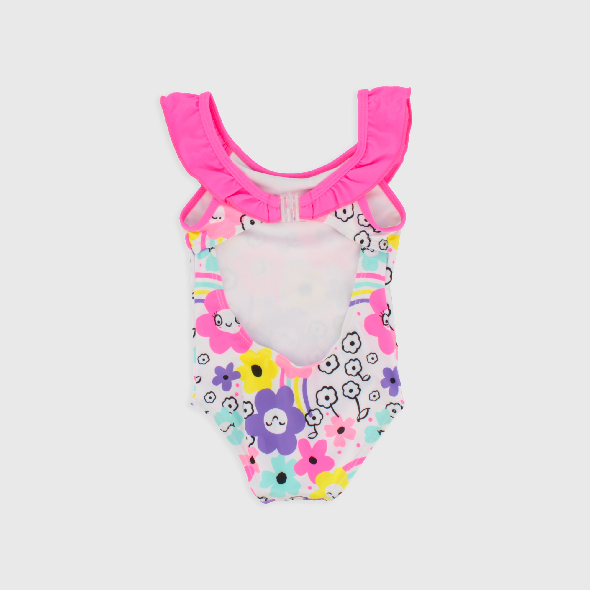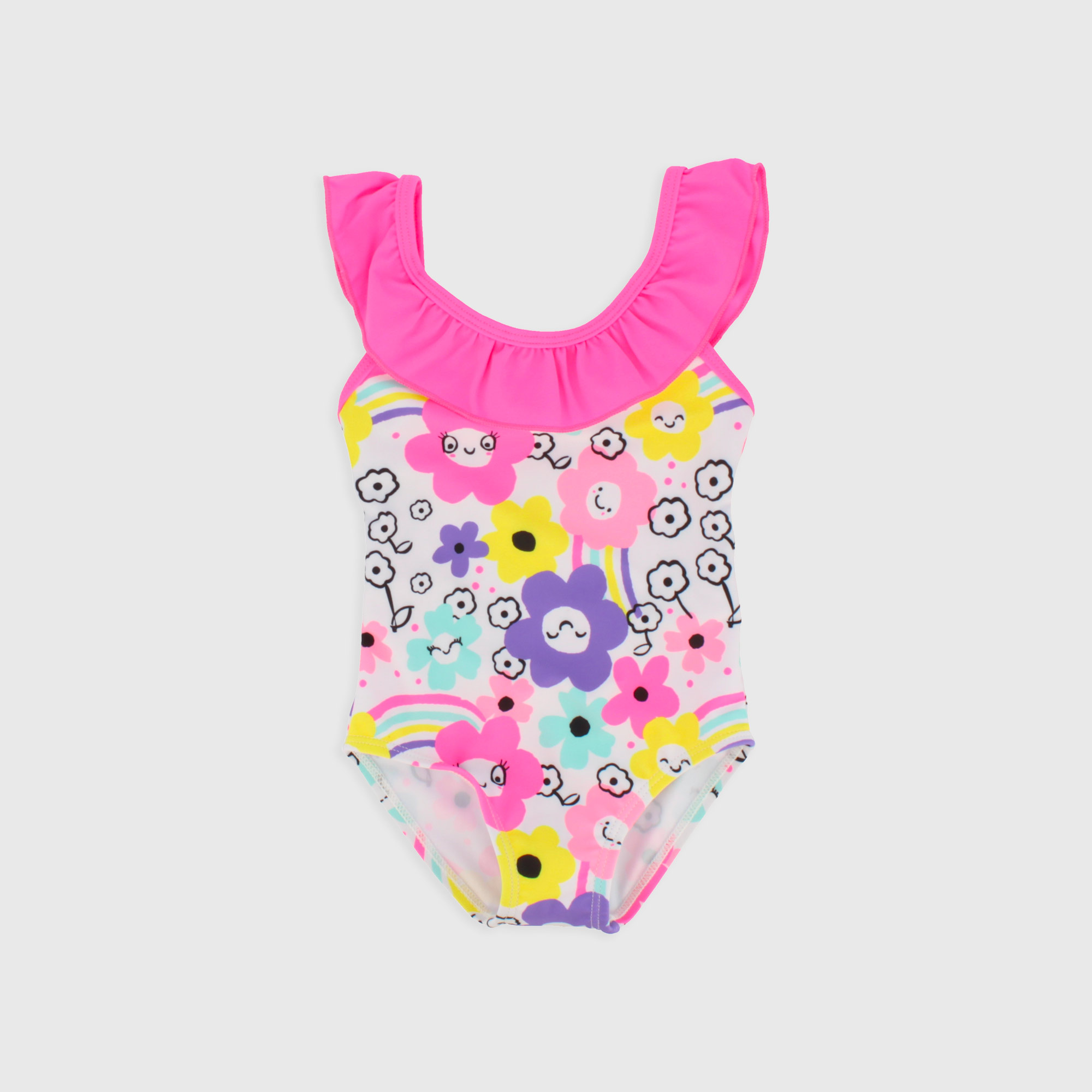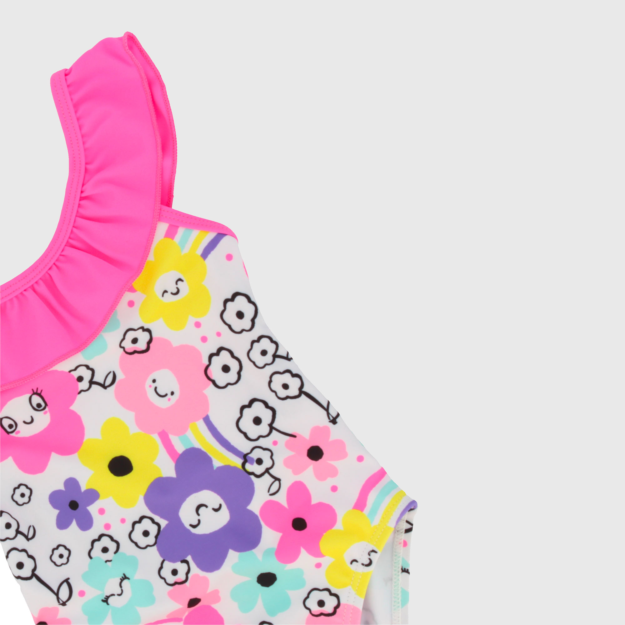 Costume intero con volants sulle bretelline e sullo scollo. Stampa fiori e arcobaleni.