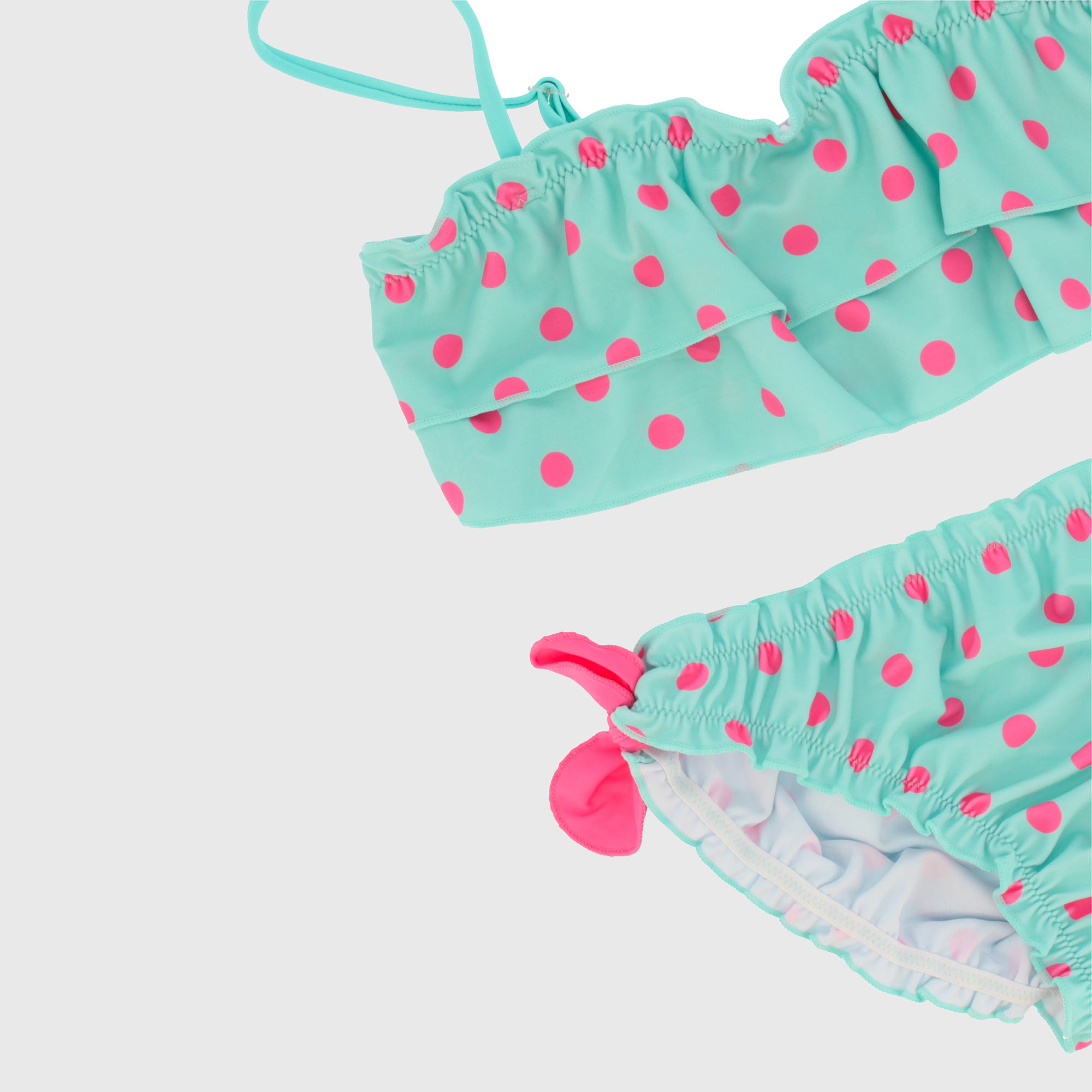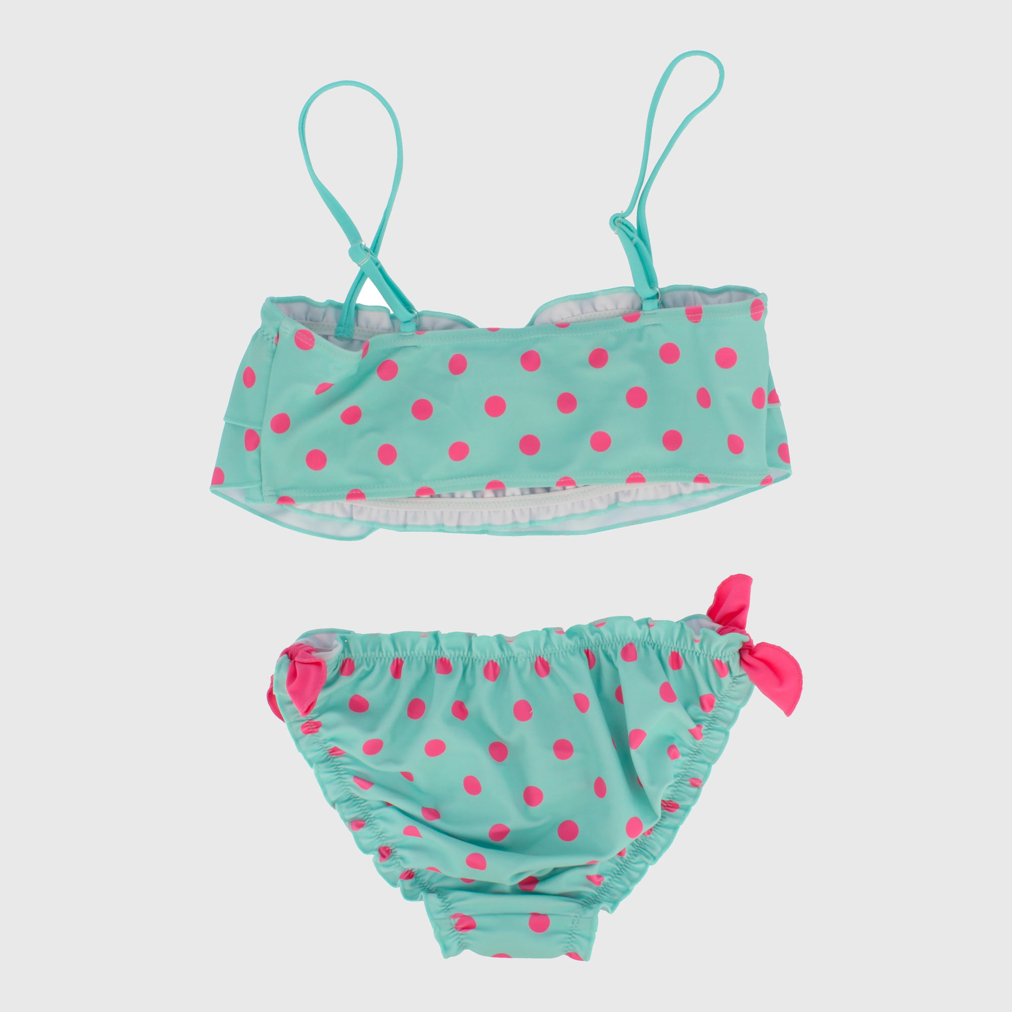Bikini stampato con top e slip coordinati. Top con spalline sottili e volants sul davanti. Slip con fiocchi in vita.