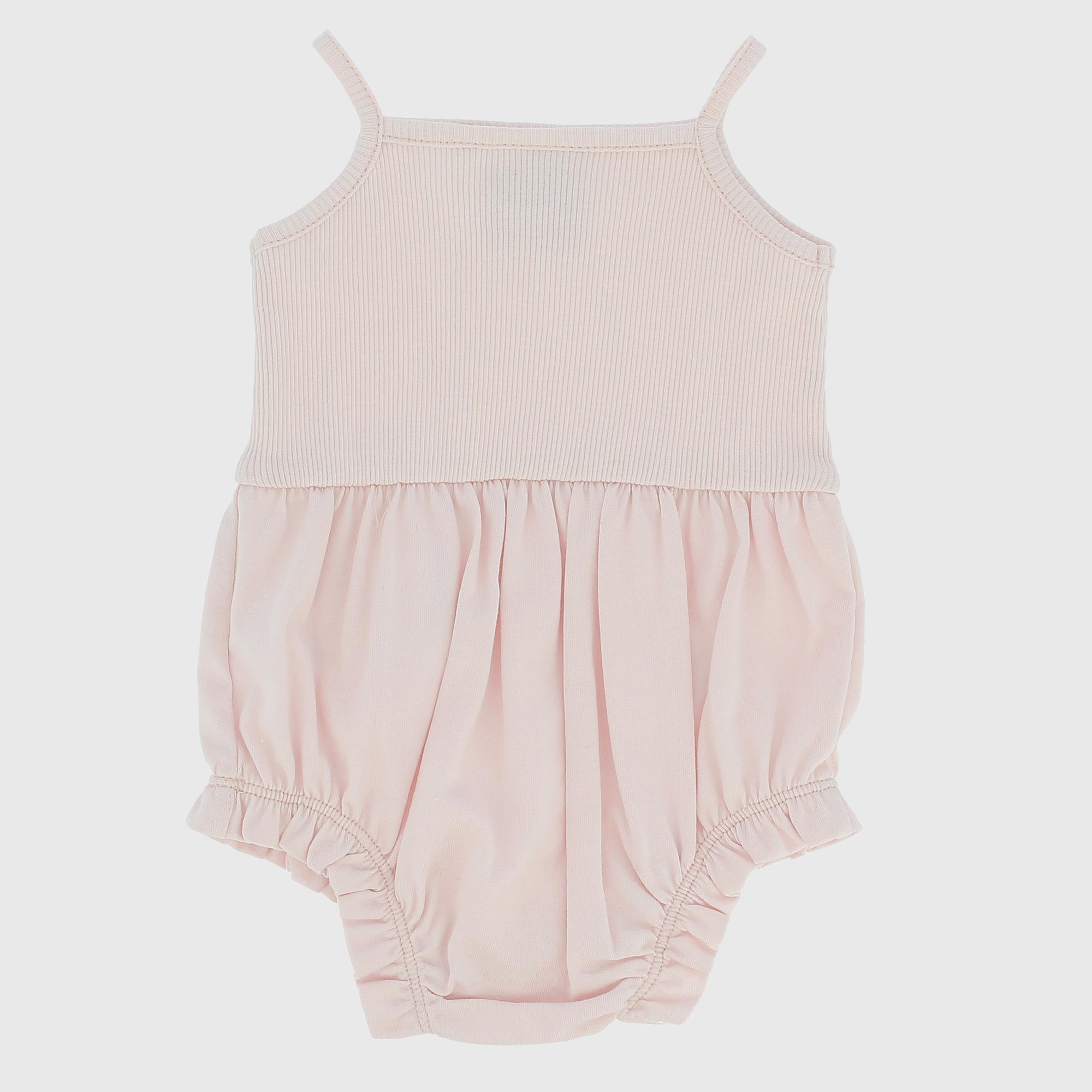 Pagliaccetto con bretelle sottili. La parte superiore è in costina, e quella sotto è in jersey. Chiusura con bottoni automatici sul cavallo. Questo capo è ecosostenibile perché realizzato prevalentemente in cotone organico.