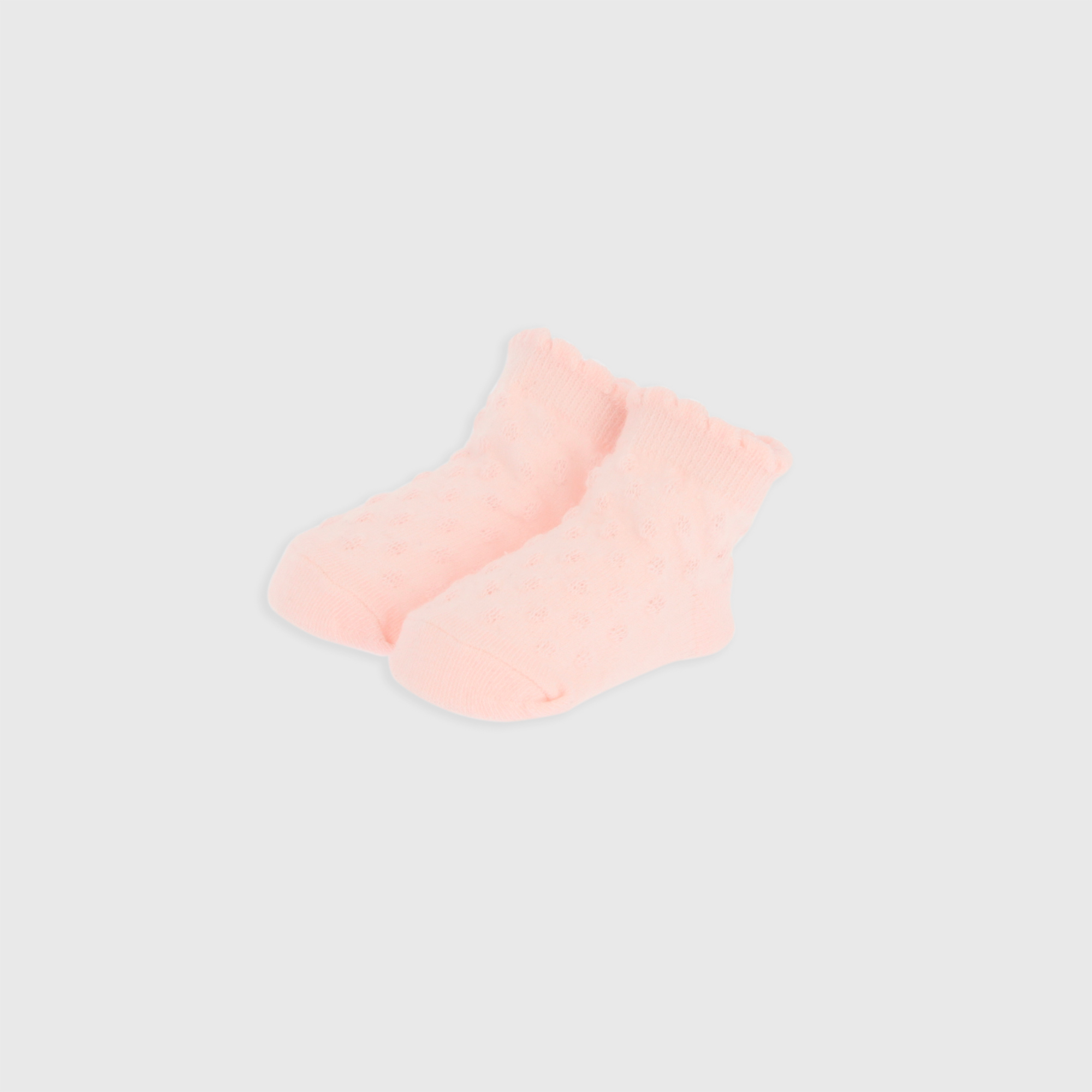 Calzino newborn con pois traforati e orlo smerlato. Bordo elasticizzato.