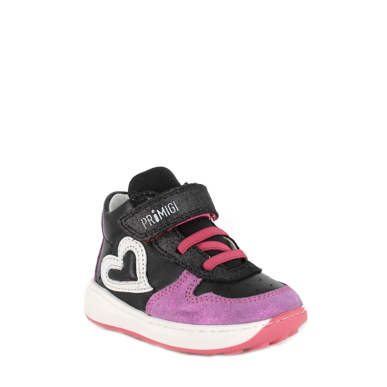 Scarpe primi passi in pelle da bambina nero-lavanda glitter
