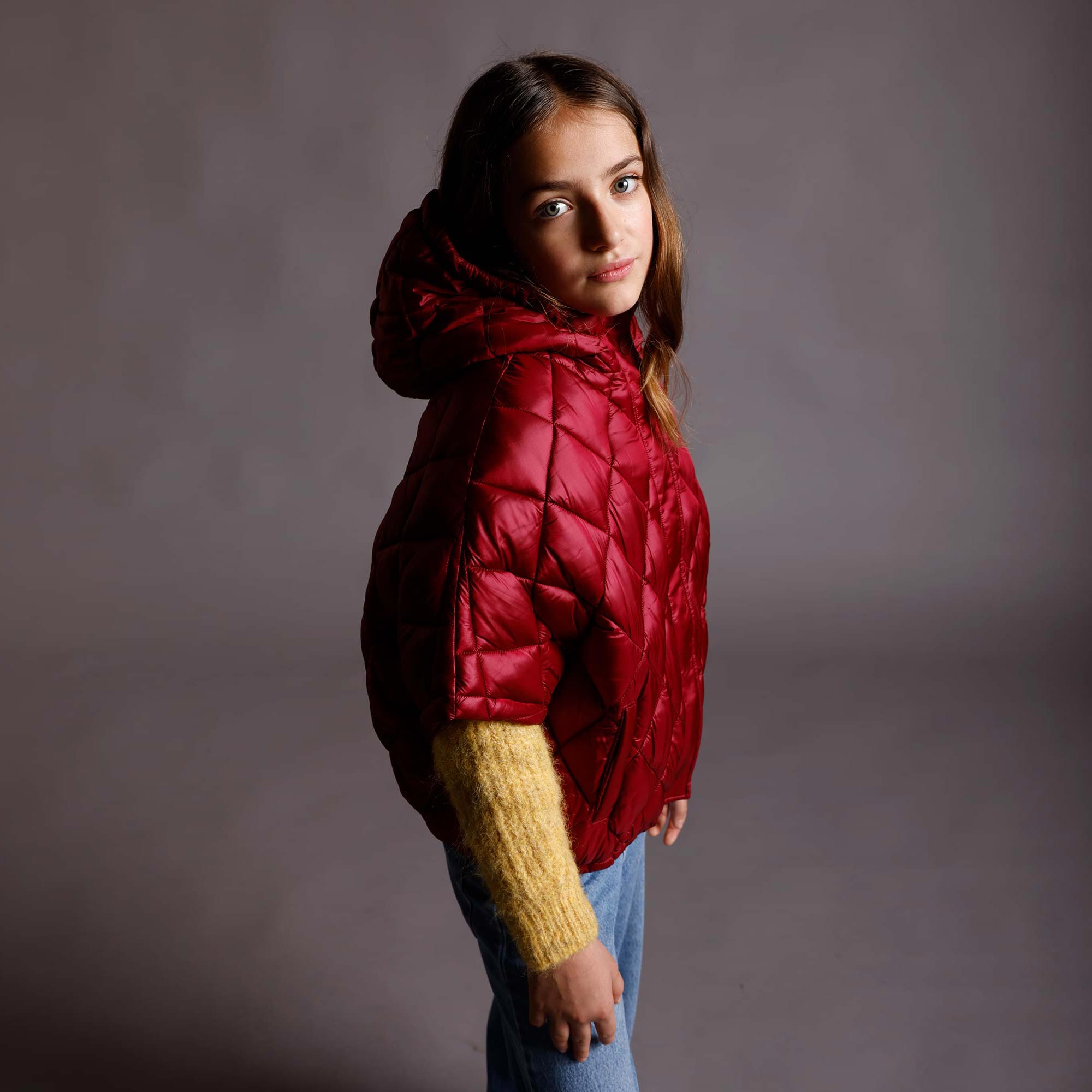 Gilet in nylon trapuntato con cappuccio. Chiusura con zip e bottoni automatici sul davanti. Tasche laterali.