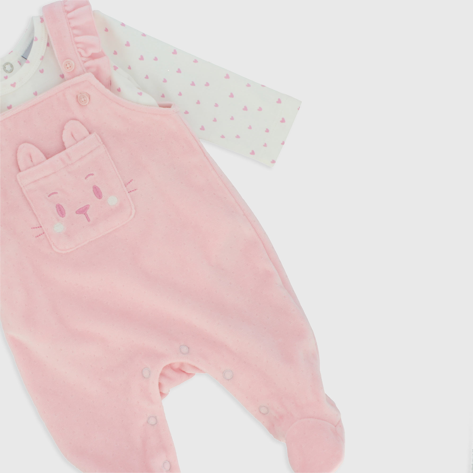 Completo composto da due pezzi. Body girocollo, con stampa all-over di cuori, a maniche lunghe. Chiusura con bottoncini automatici sul retro. Salopette in ciniglia con volants sulle bretelle. Chiusura con bottoncini sul davanti, sul lato e sul cavallo. Taschina con orecchie applicate sul davanti.