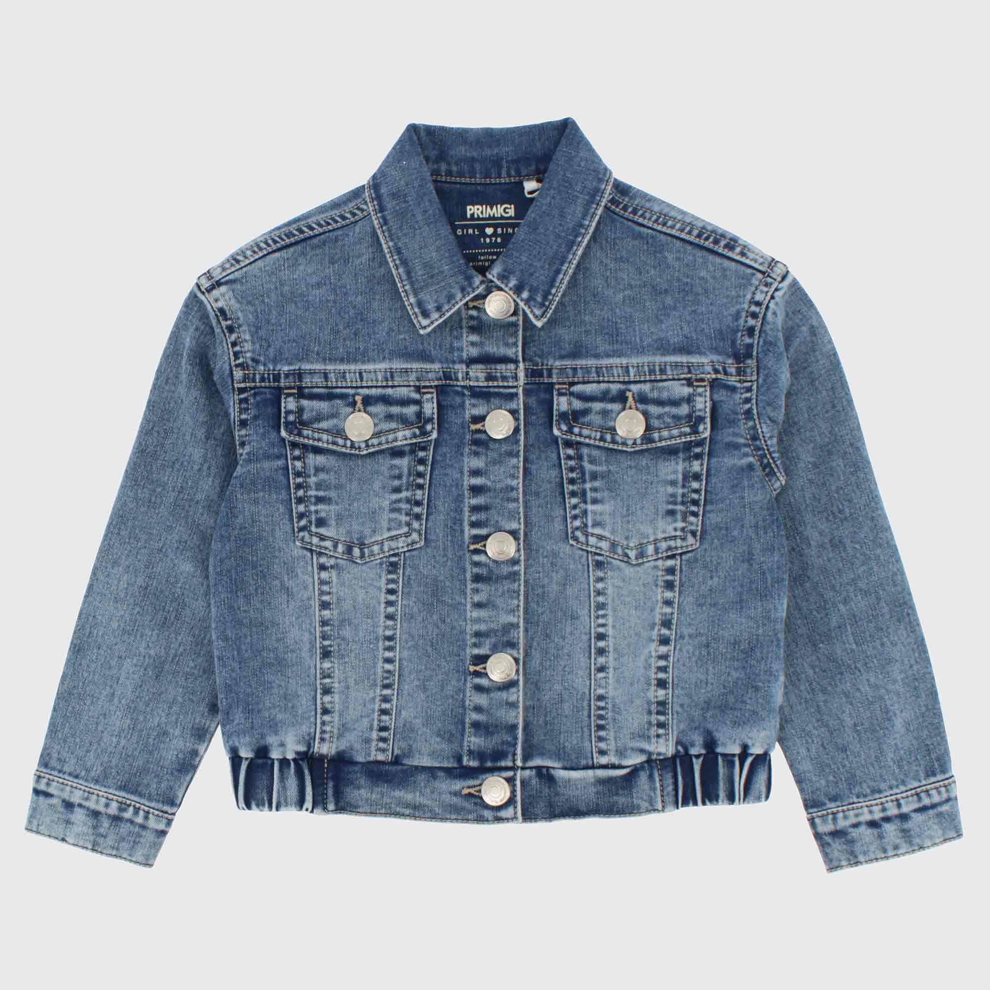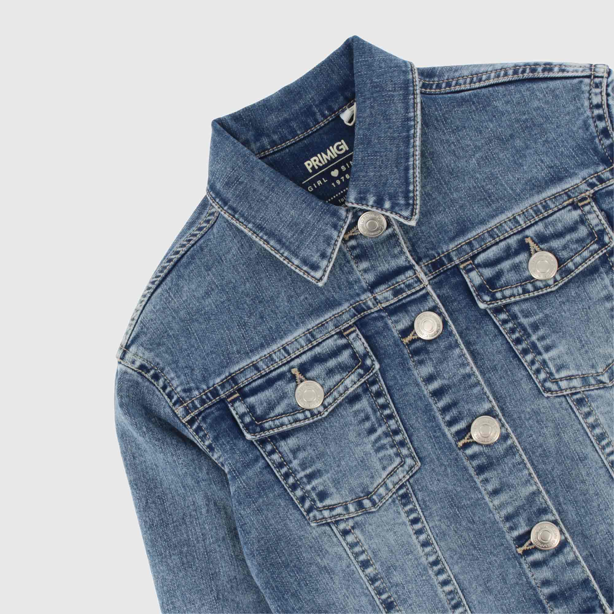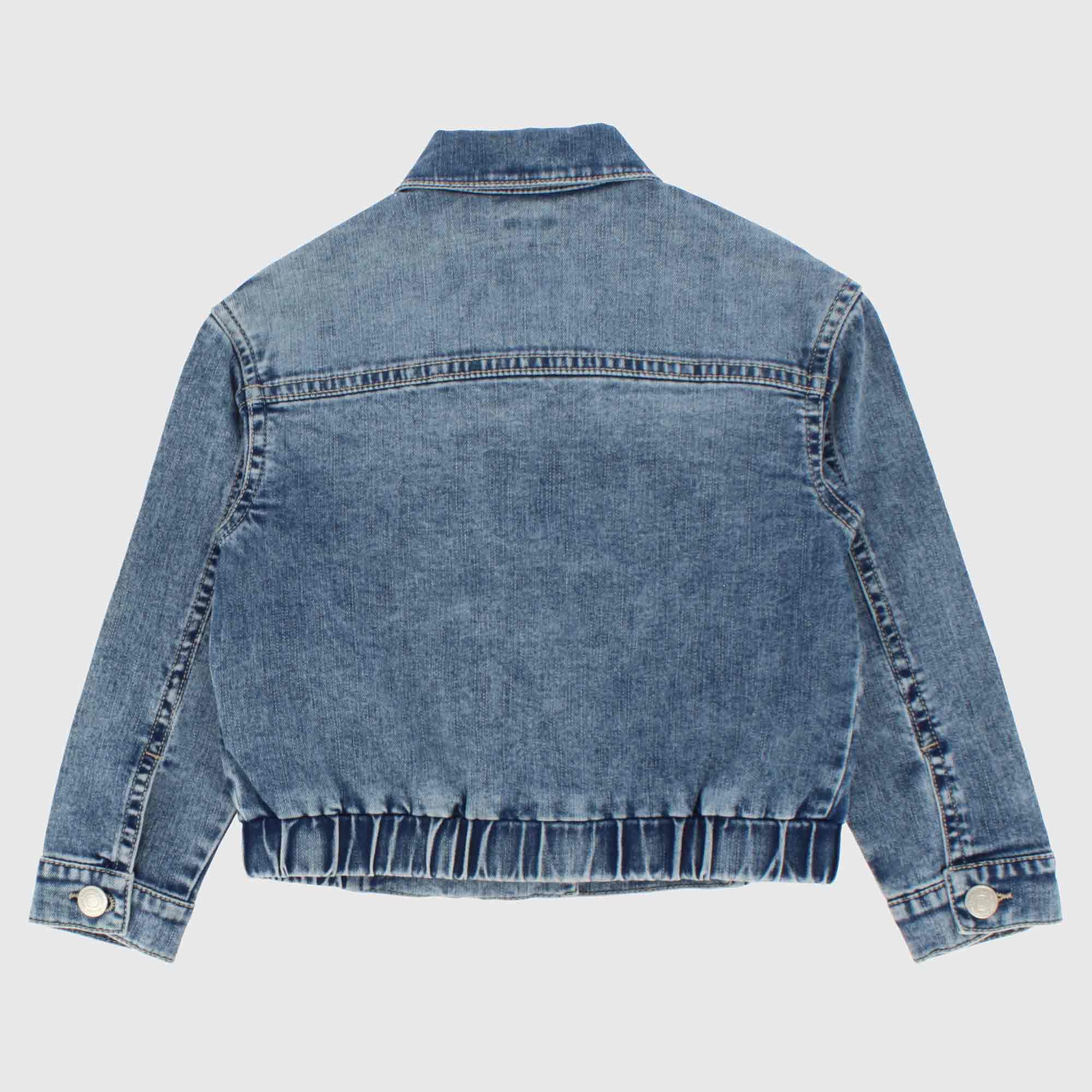 Giubbino in jeans con colletto, a maniche lunghe. Chiusura frontale con bottoni. Tasche a toppa con pattina e bottoni. Elastico sul fondo.