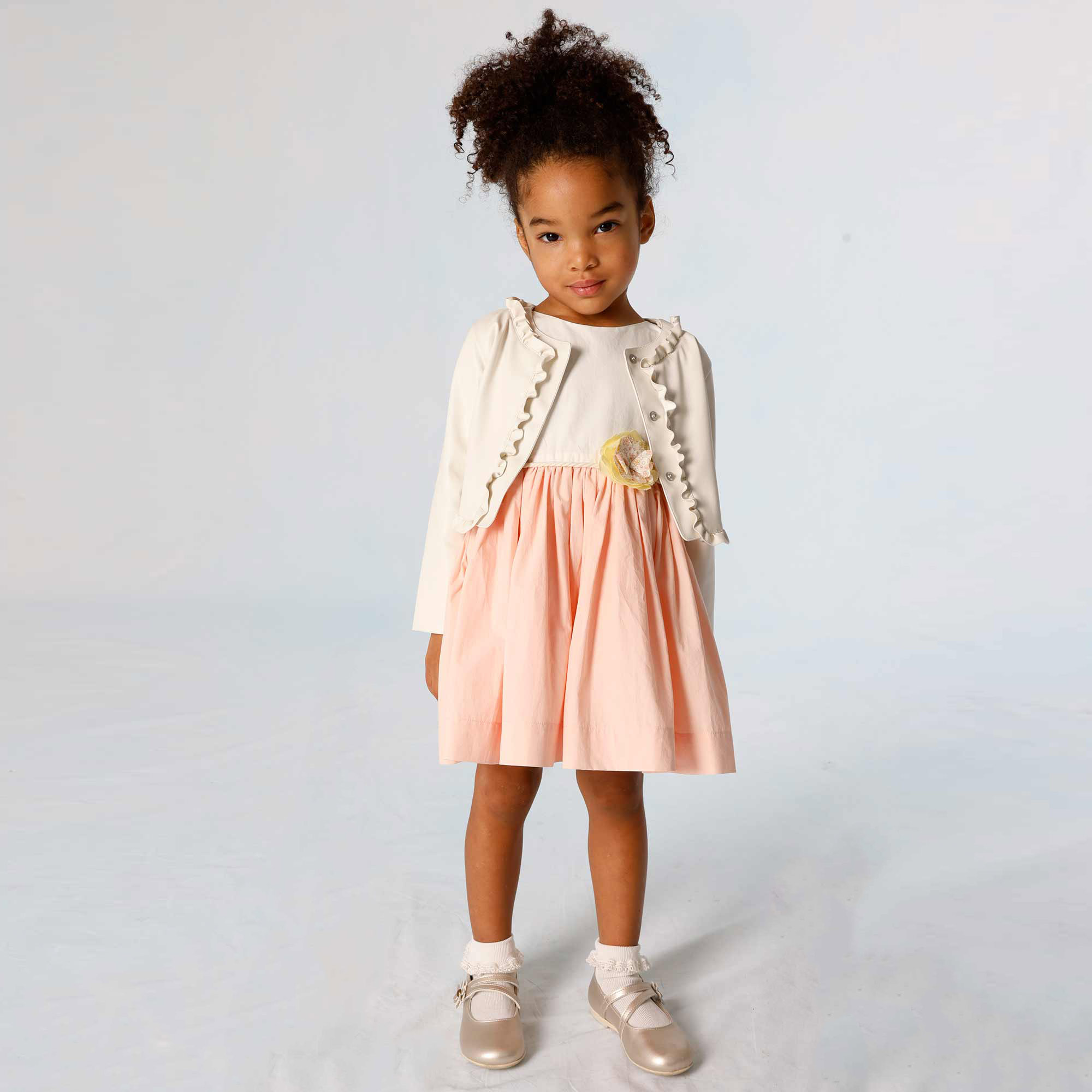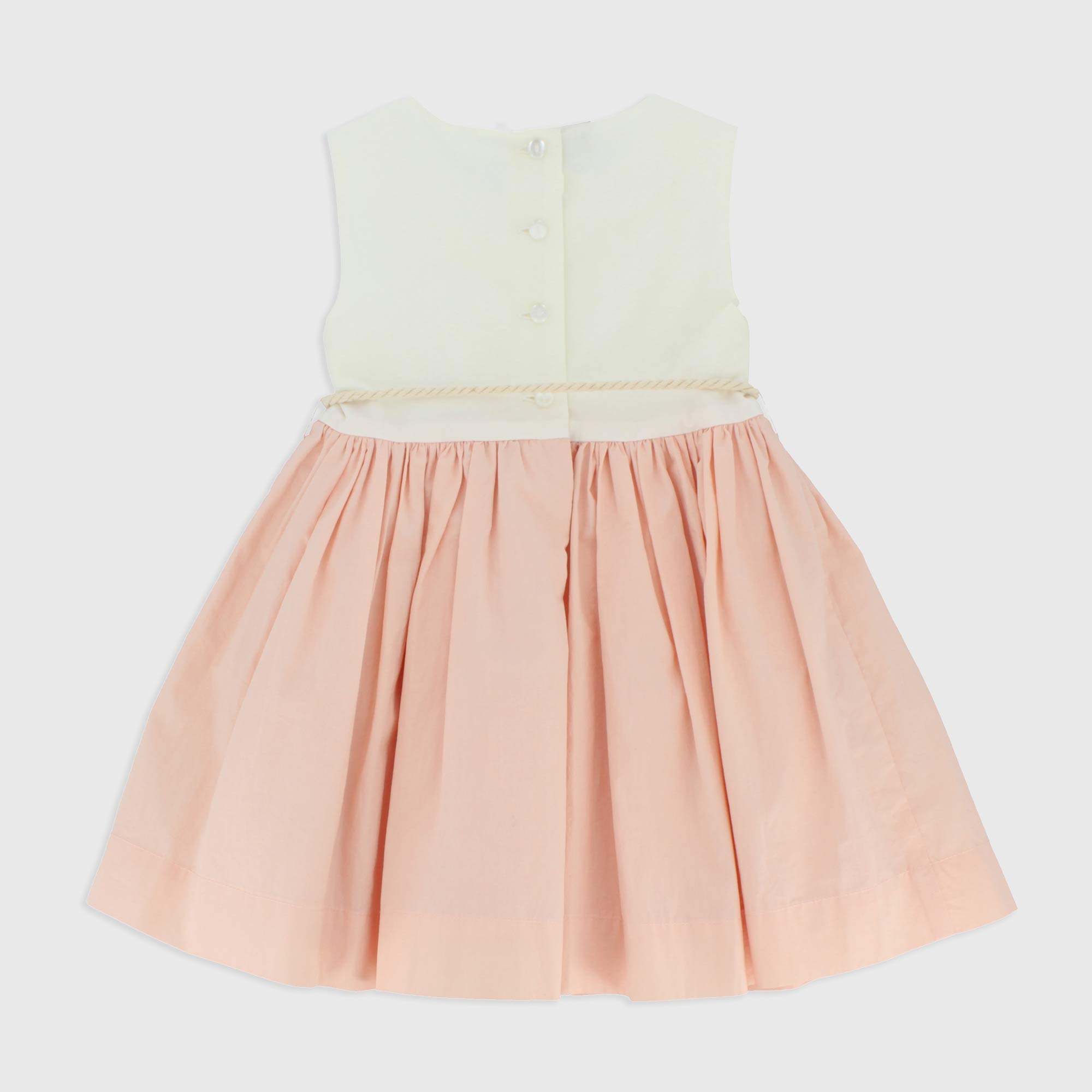 Vestito in popeline bicolore, scollo rotondo, giromanica. Chiusura con bottoncini sul retro. Taglio sulla vita. Gonna ampia con fodera e sottogonna in tulle. Cinta staccabile con fiore applicato.