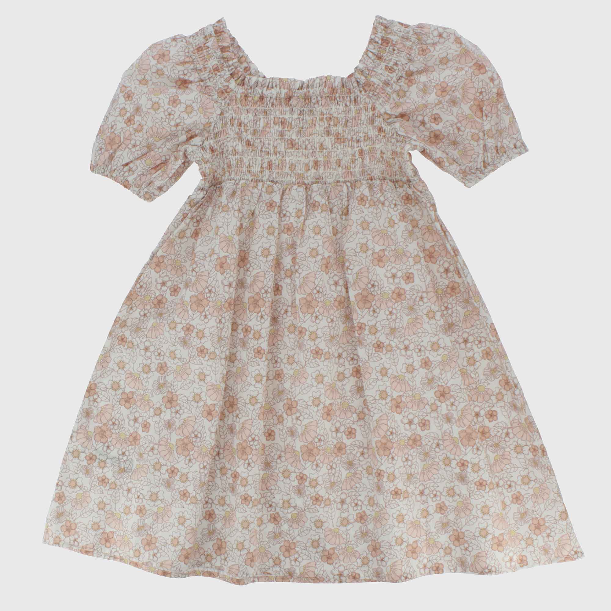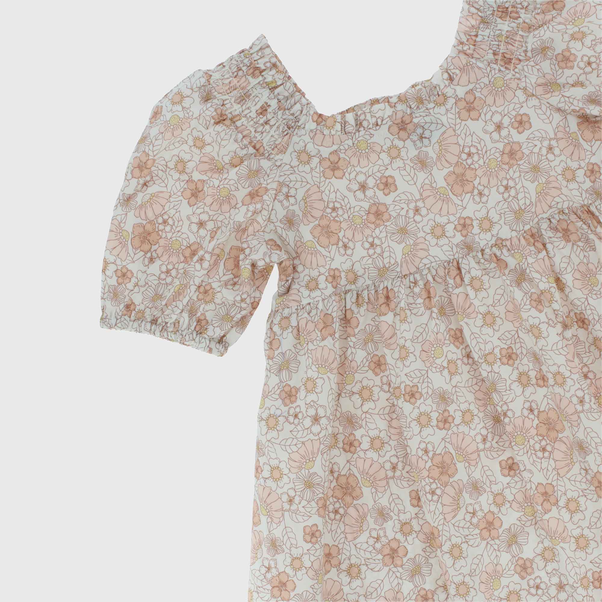 Vestito in cotone stampato, scollo quadrato, con maniche corte a palloncino. Arricciatura elasticata su spalle e retro.