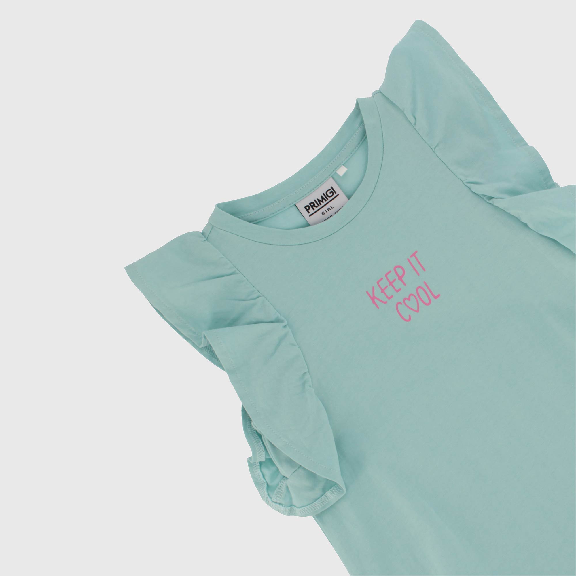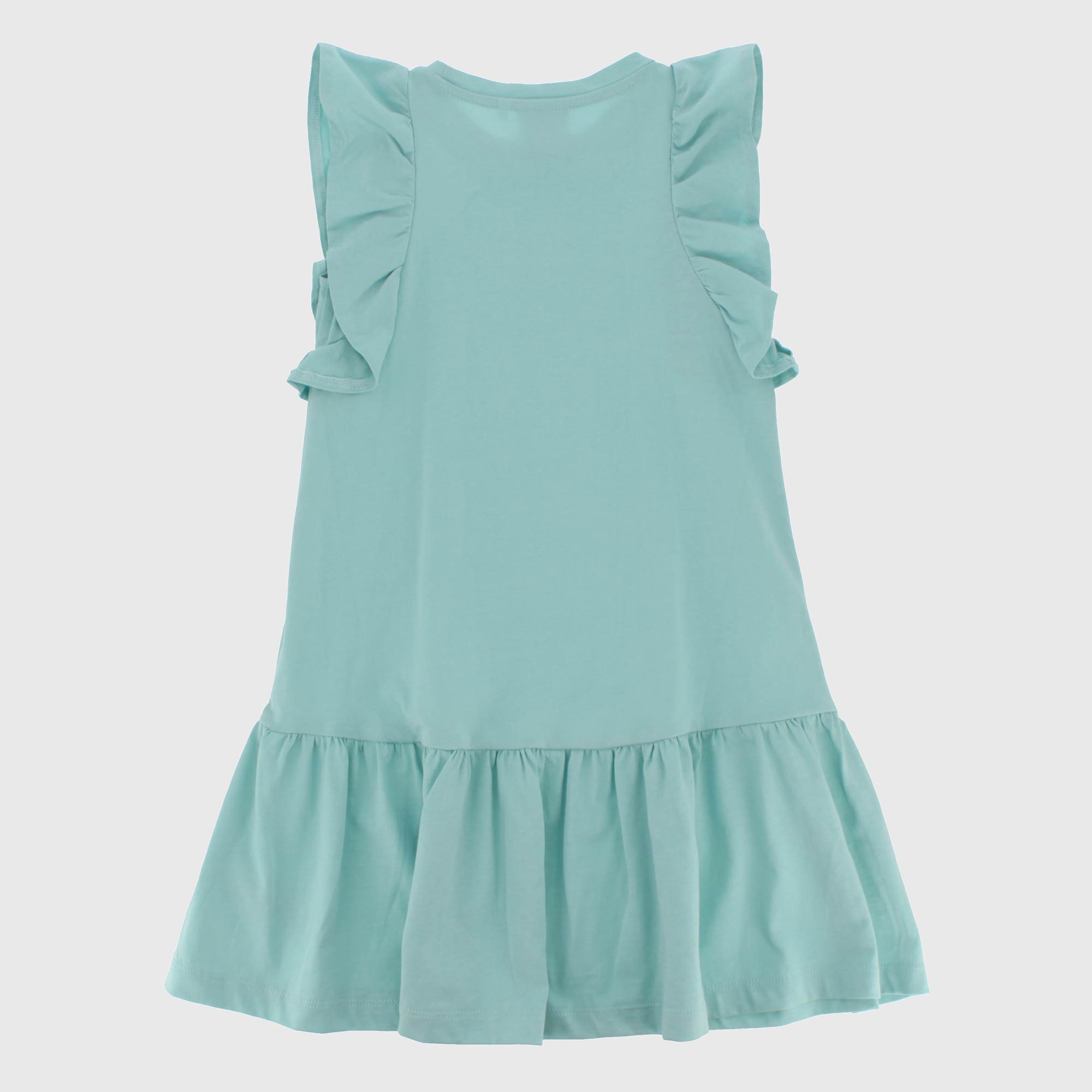 Vestito in jersey, girocollo. Volants applicati sul giromanica. Stampa frontale. Gonna con balza.