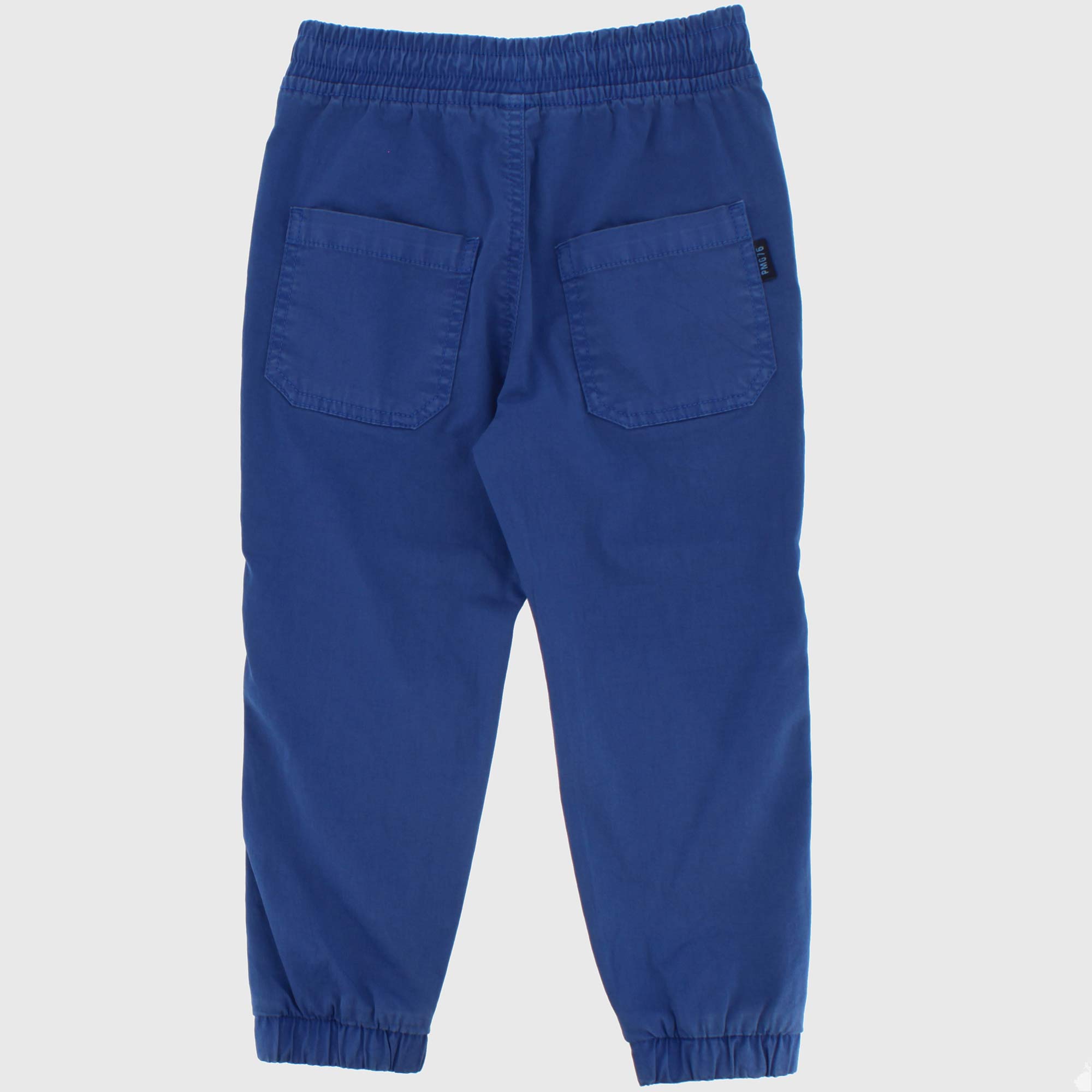Pantalone in gabardina con vita elasticizzata e lacci frontali. Tasche a scomparsa sul davanti e a toppa sul retro. Fondo con elastico.