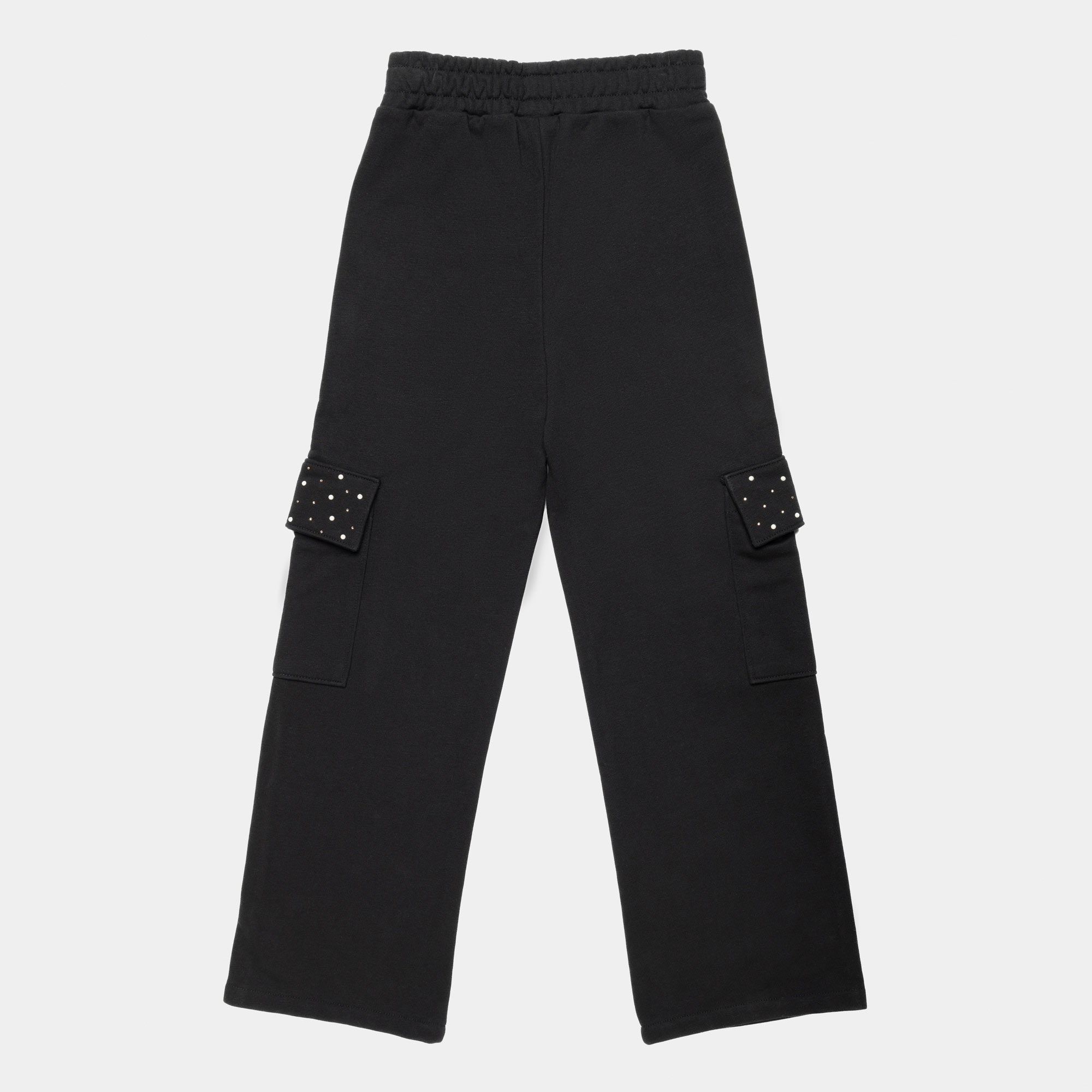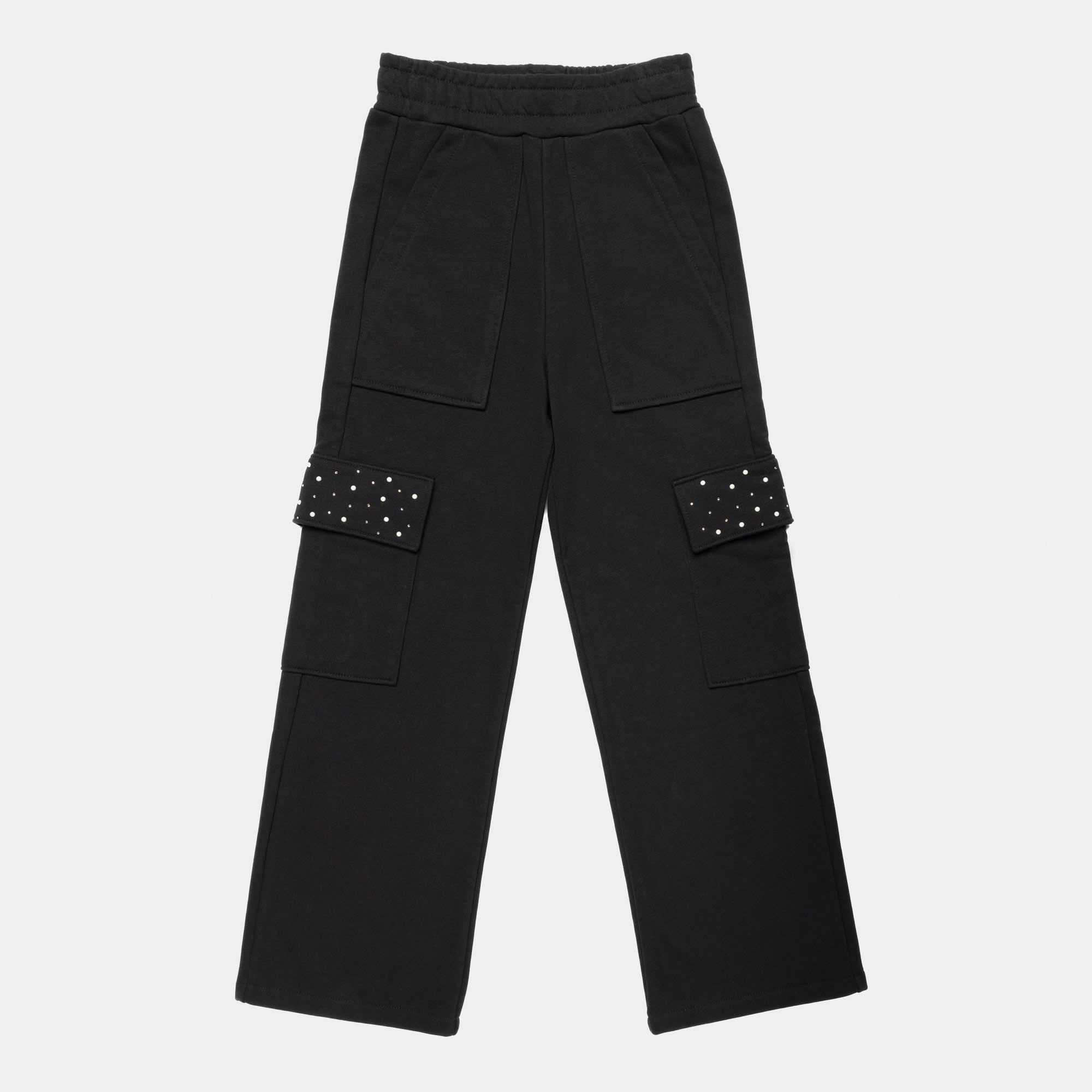 Pantalone wide leg in felpa con vita elasticizzata. Tasche sul davanti e tasconi laterali con pattina e applicazioni di strass e perle.