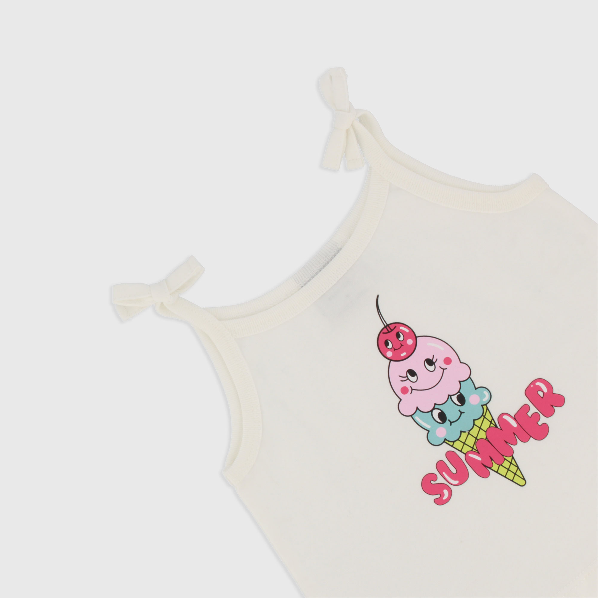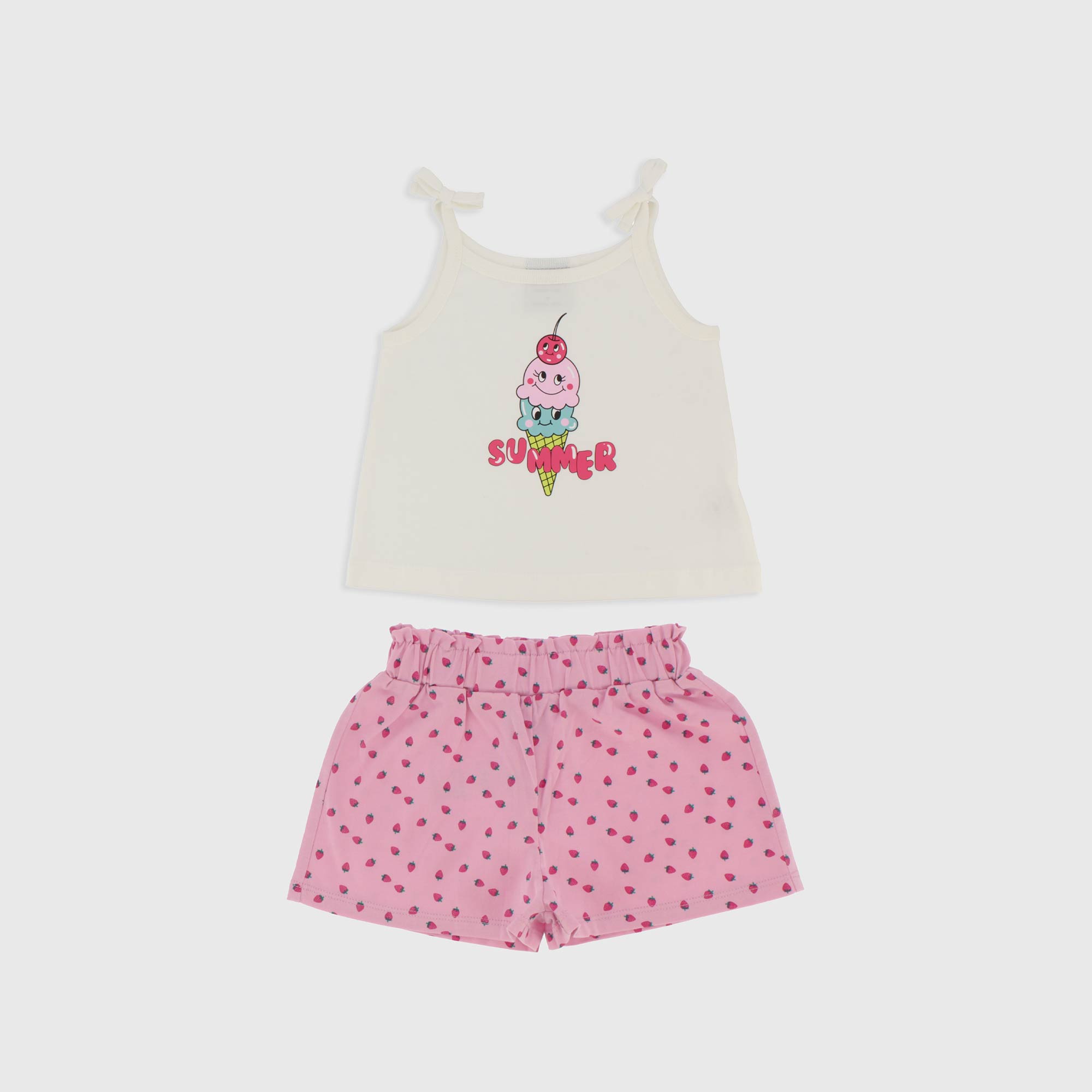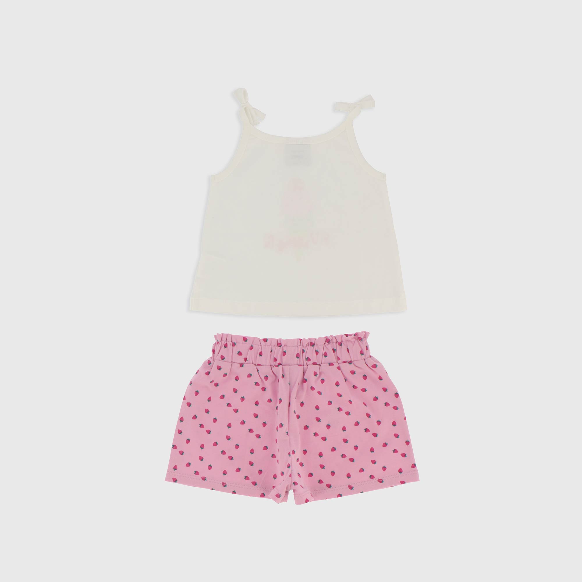 Completo composto da due pezzi. Canotta in jersey con bretelle sottili, con fiocchetto applicato. Stampa frontale. Shorts in jersey con vita elasticizzata, stampa all over.