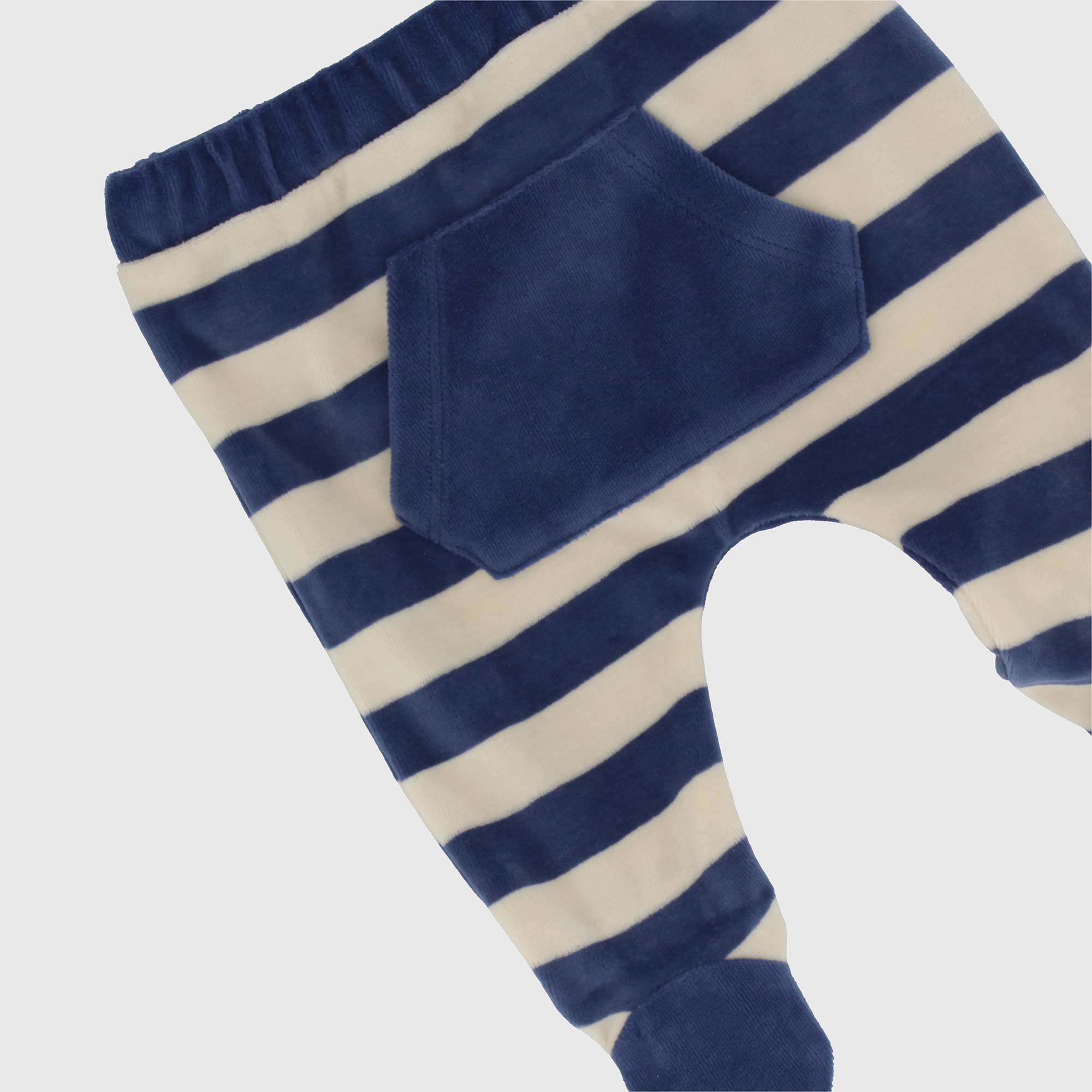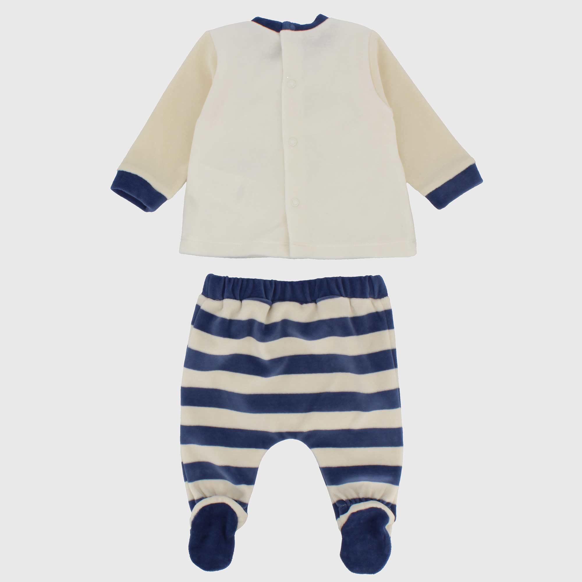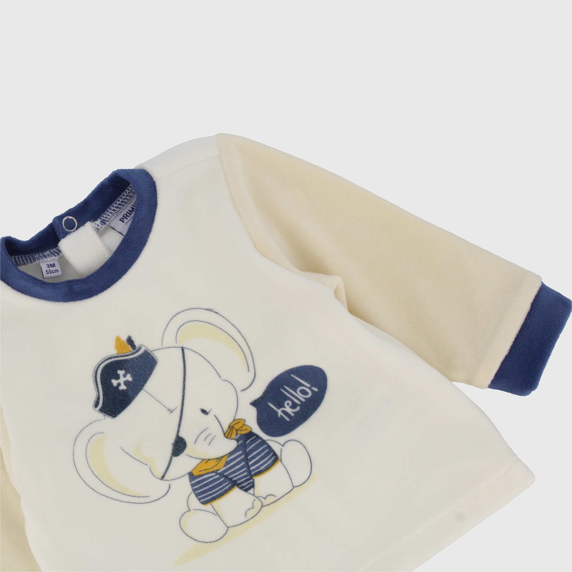 Completo composto da due pezzi. Maglietta in ciniglia girocollo, a maniche lunghe. Chiusura posteriore con bottoni automatici. Stampa sul davanti e profili a contrasto. Ghettina in ciniglia a righe con vita elasticizzata e piedini. Tasca a marsupio.