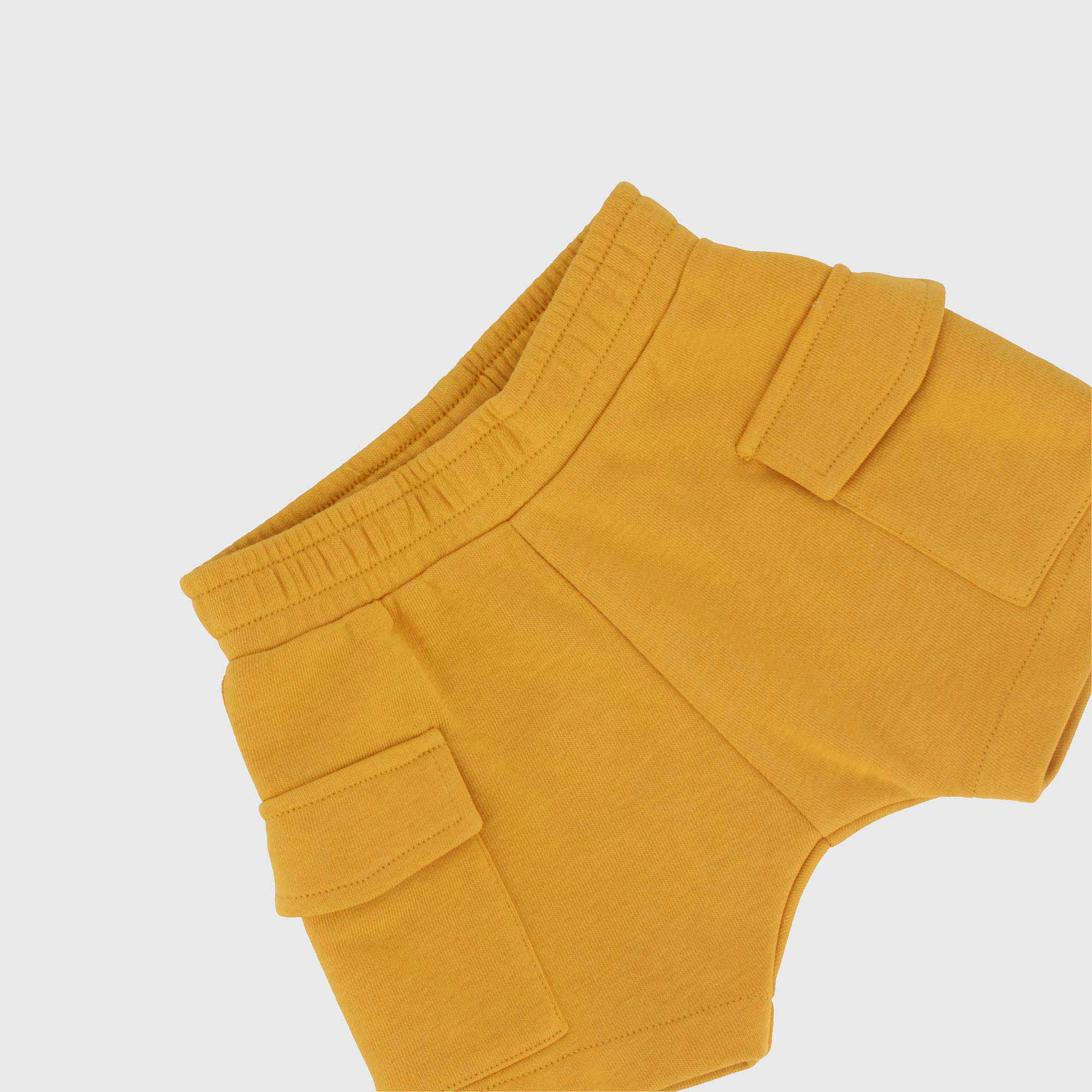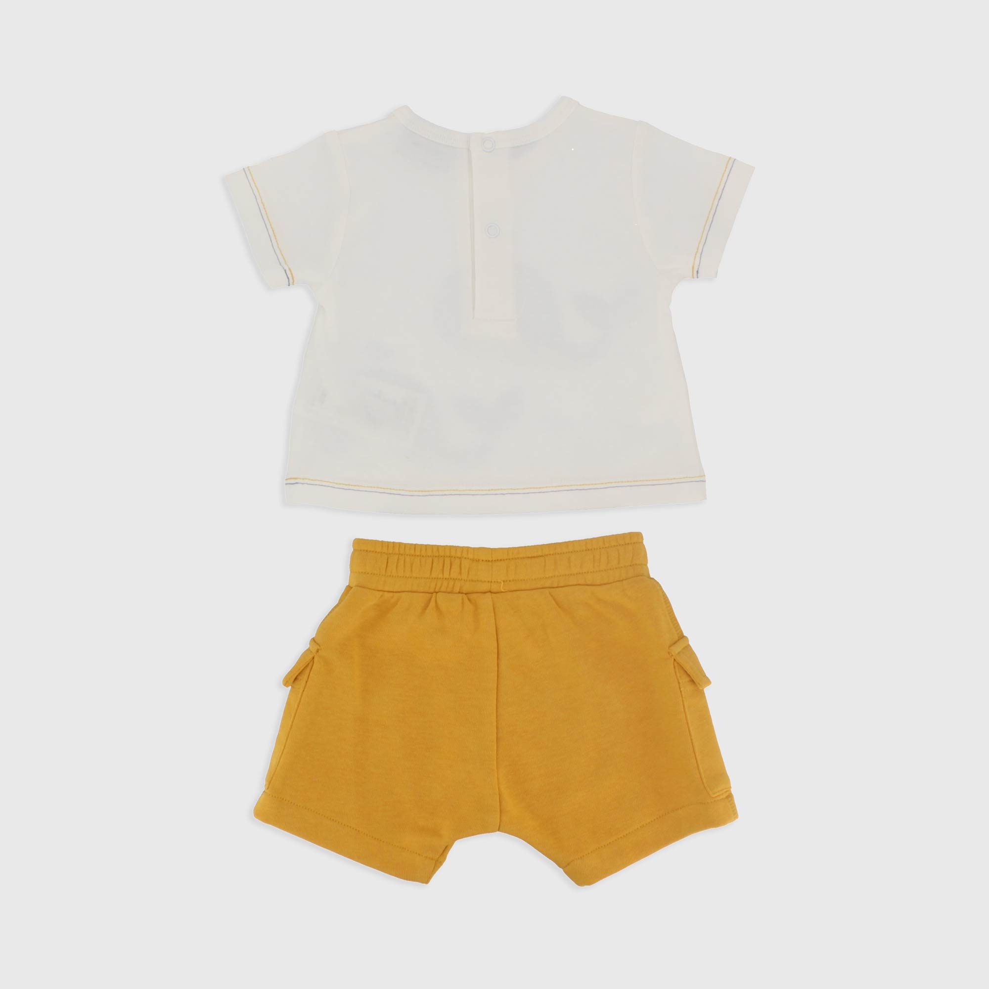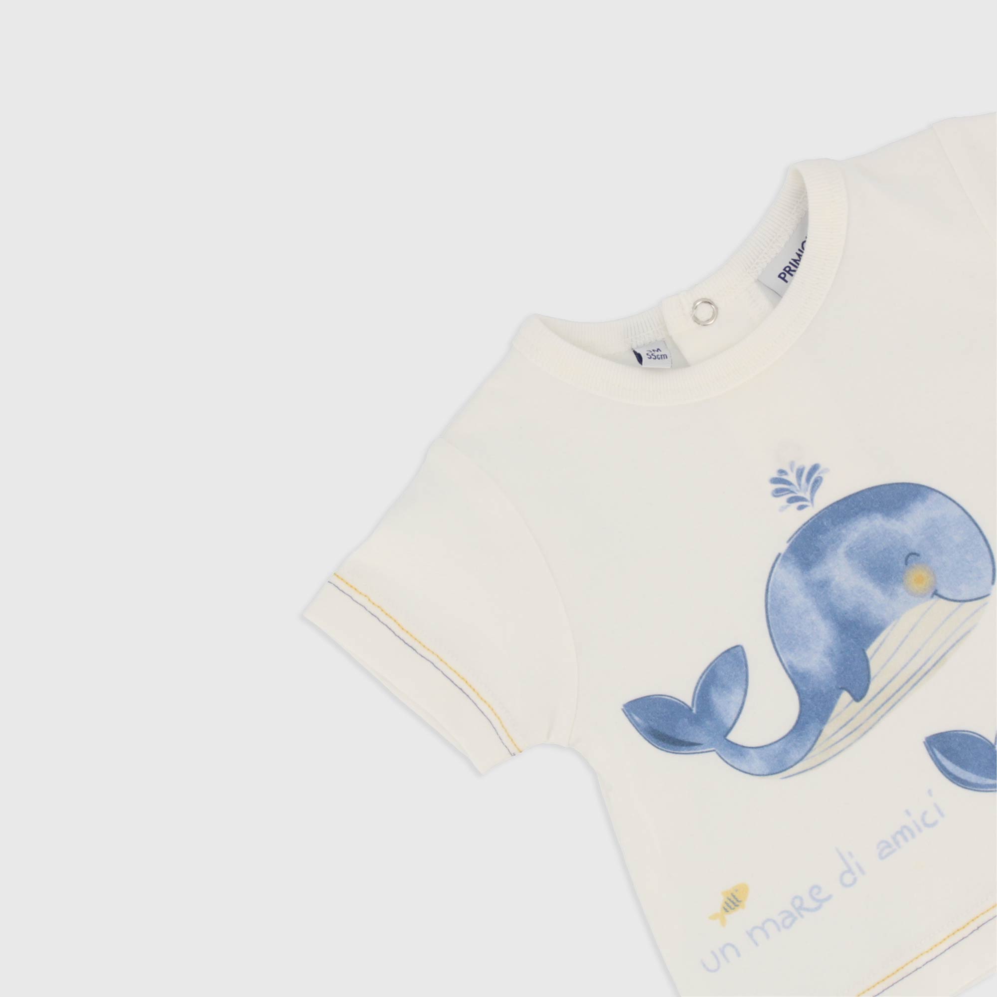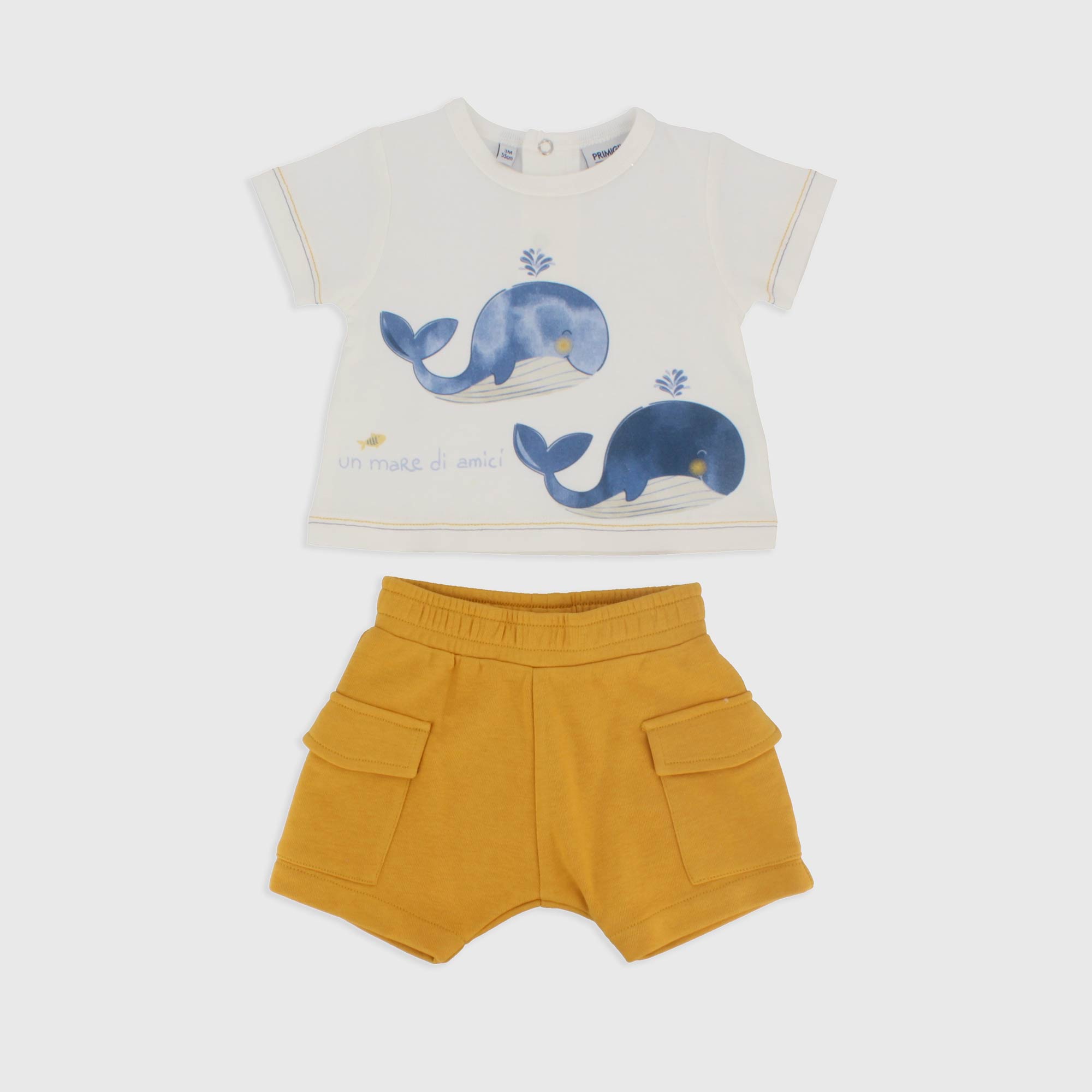 Completo composto da due pezzi. Maglietta in jersey girocollo, a maniche corte. Chiusura posteriore con bottoni automatici. Stampa frontale. Pantaloncino in felpa con vita elasticizzata e tasche a toppa con pattina.