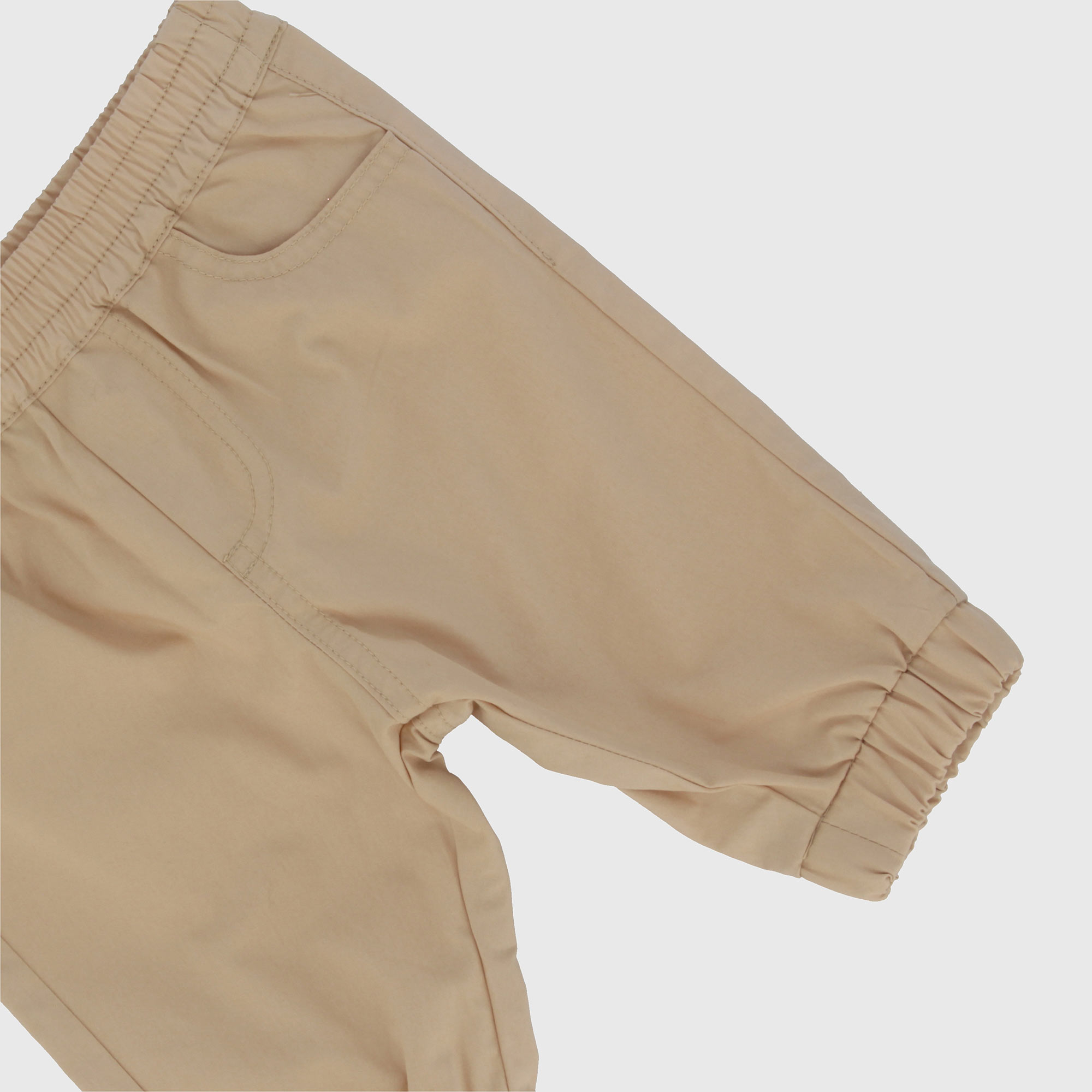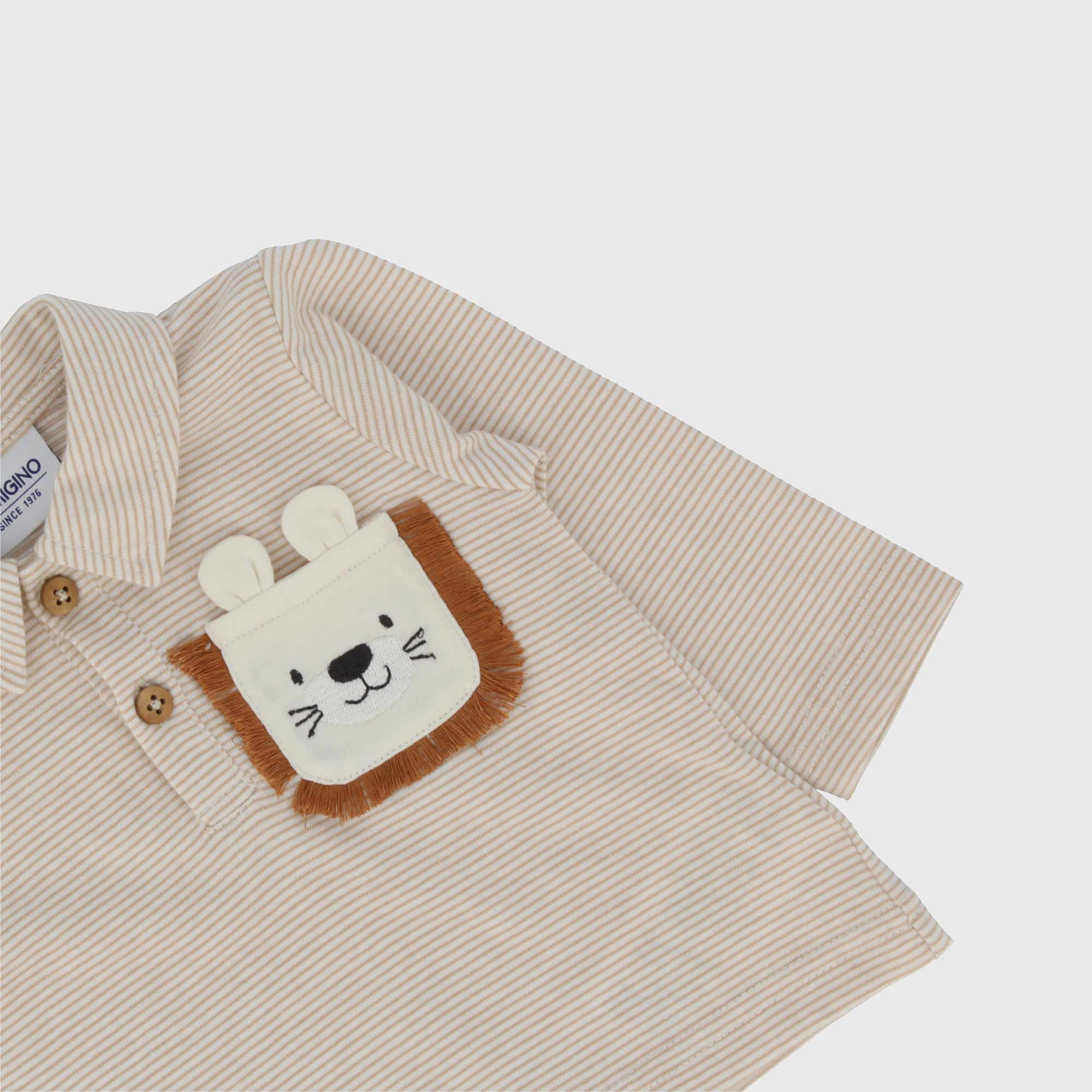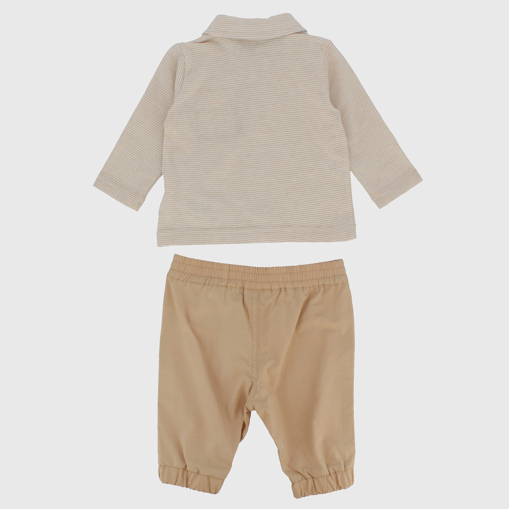 Completo composto da due pezzi. Polo in jersey riga tinto filo, a maniche lunghe. Applicazione a Leoncino sul davanti. Pantalone in cotone con vita elasticizzata, finte tasche sul davanti e fondi elasticati.