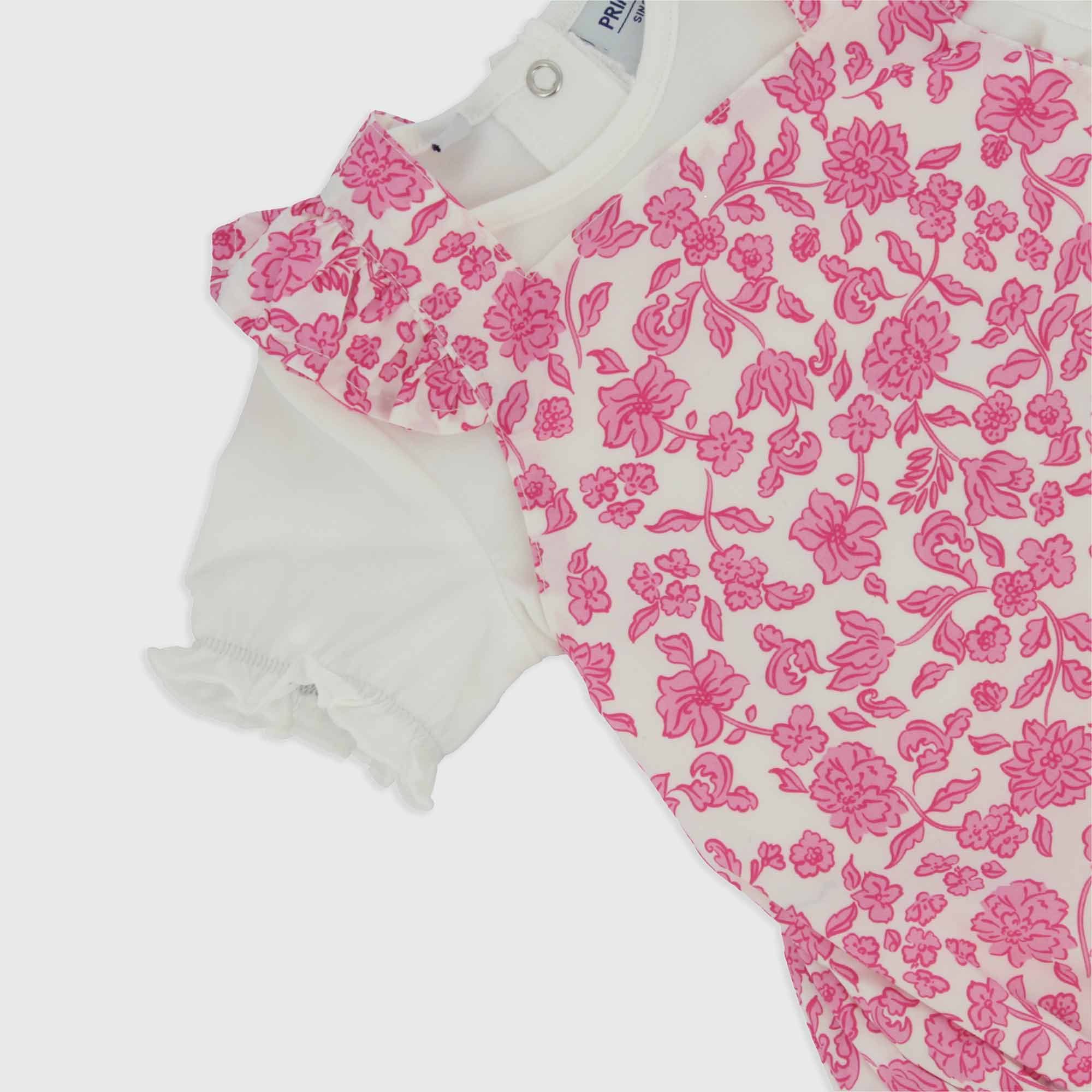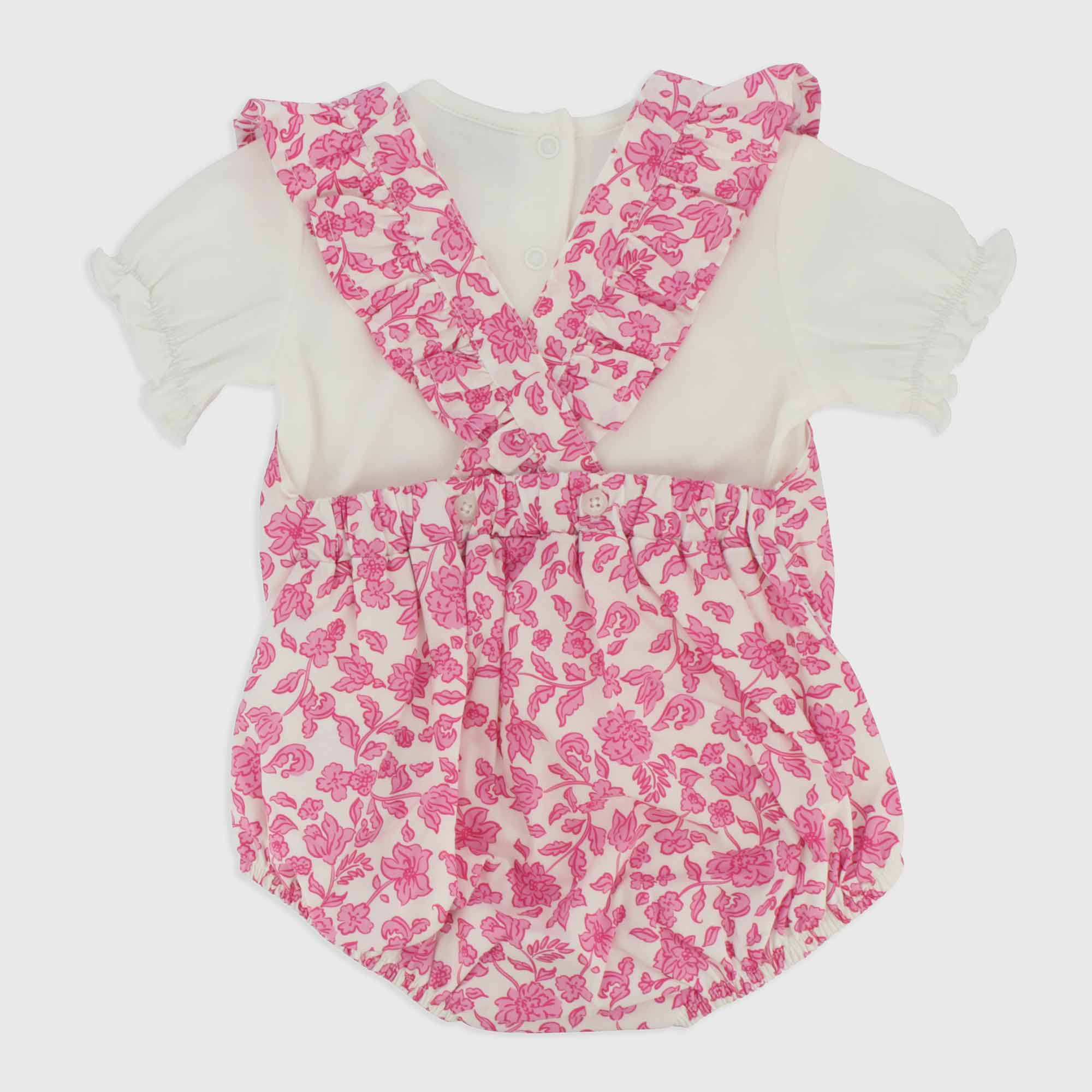 Completo composto da due pezzi. Maglietta in jersey a maniche corte con elastico. Chiusura con bottoncini automatici sul retro. Pagliaccetto in cotone stampato con abbottonatura sul retro e sul cavallo.