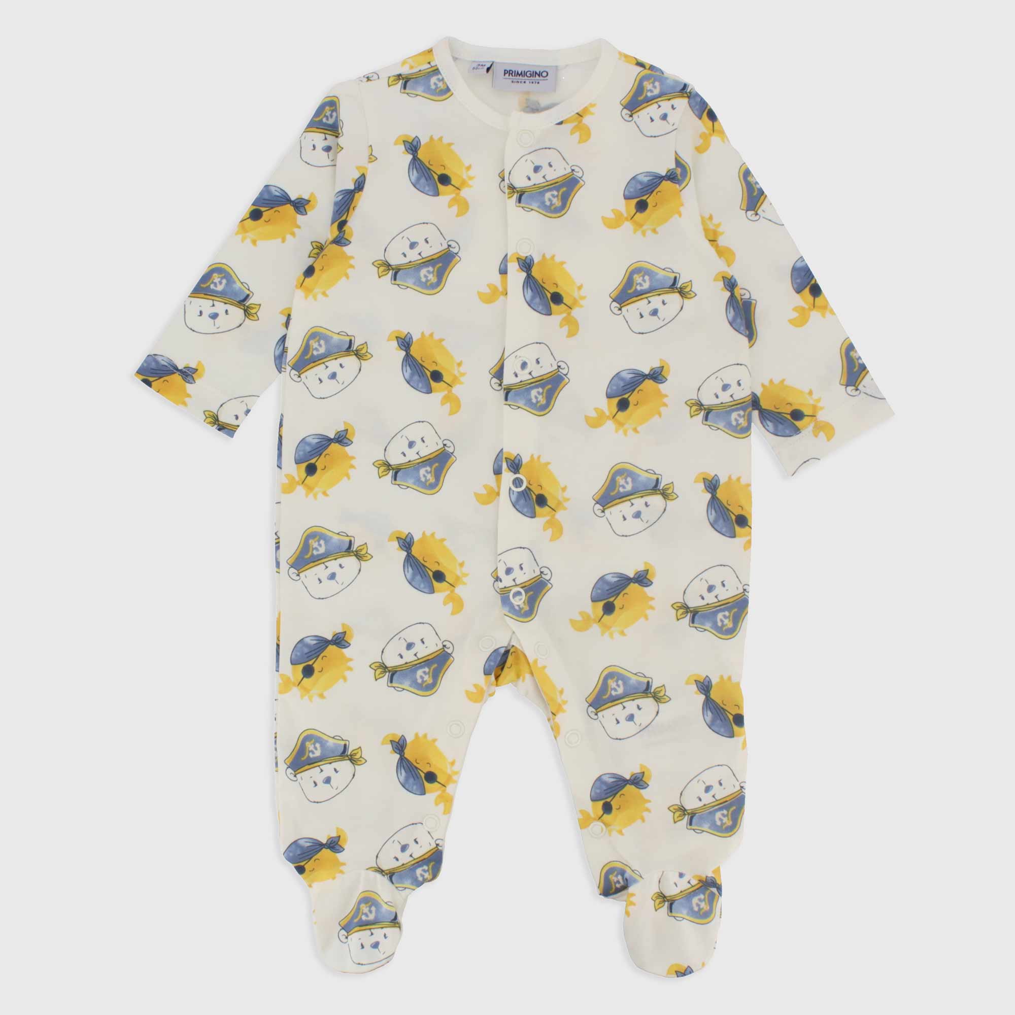 Tutina in jersey con collo rotondo, a maniche lunghe. Chiusura frontale con bottoni automatici. Stampa all-over.