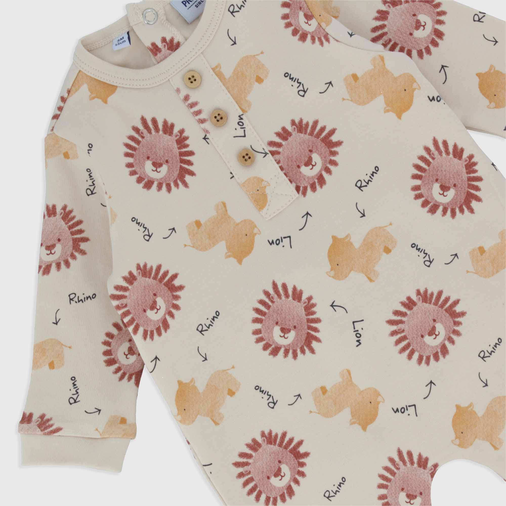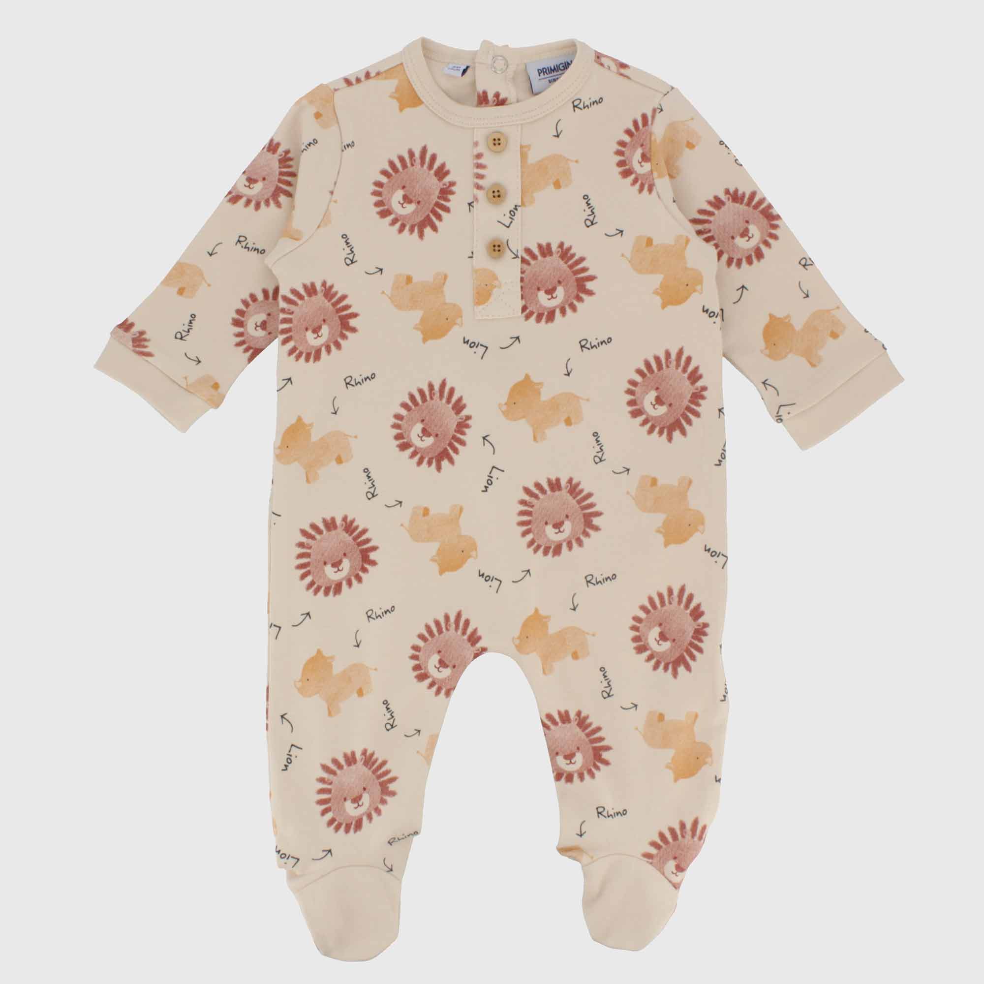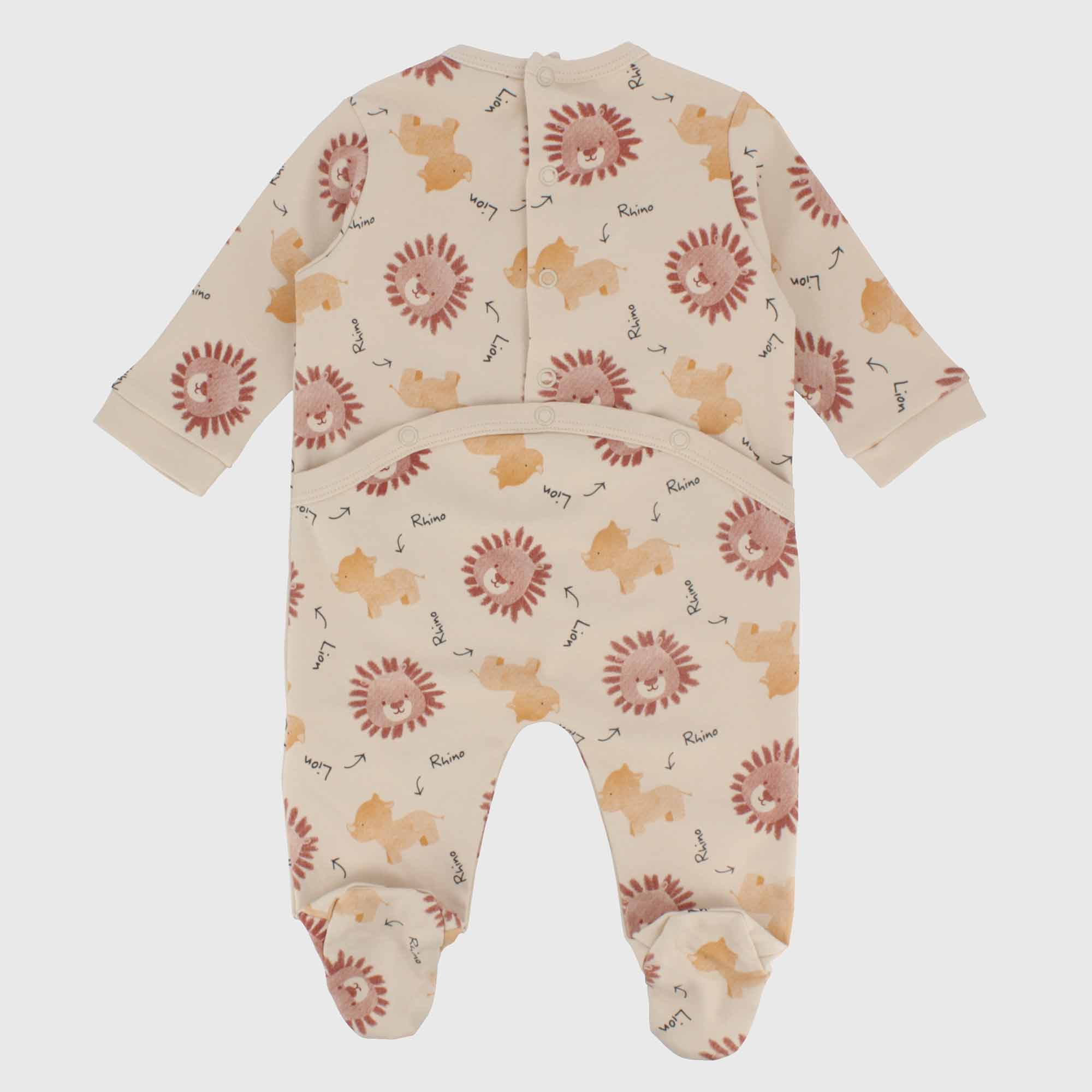 Tutina in interlock con collo rotondo, a maniche lunghe. Chiusura con bottoni automatici sul retro. Stampa all-over e bottoncini sullo scollo.