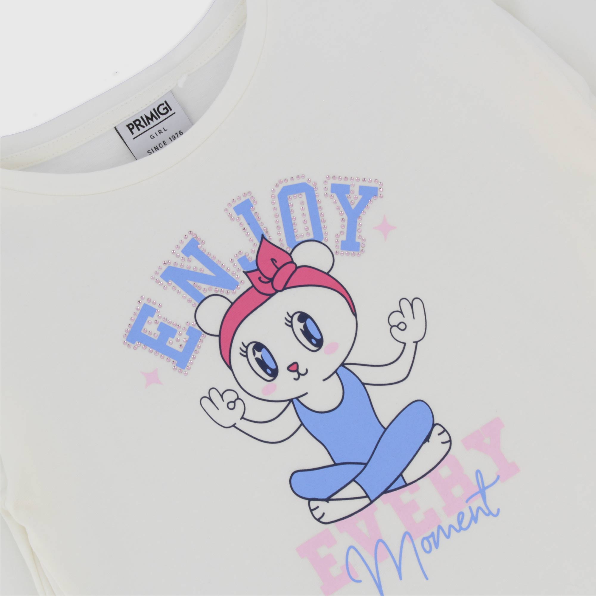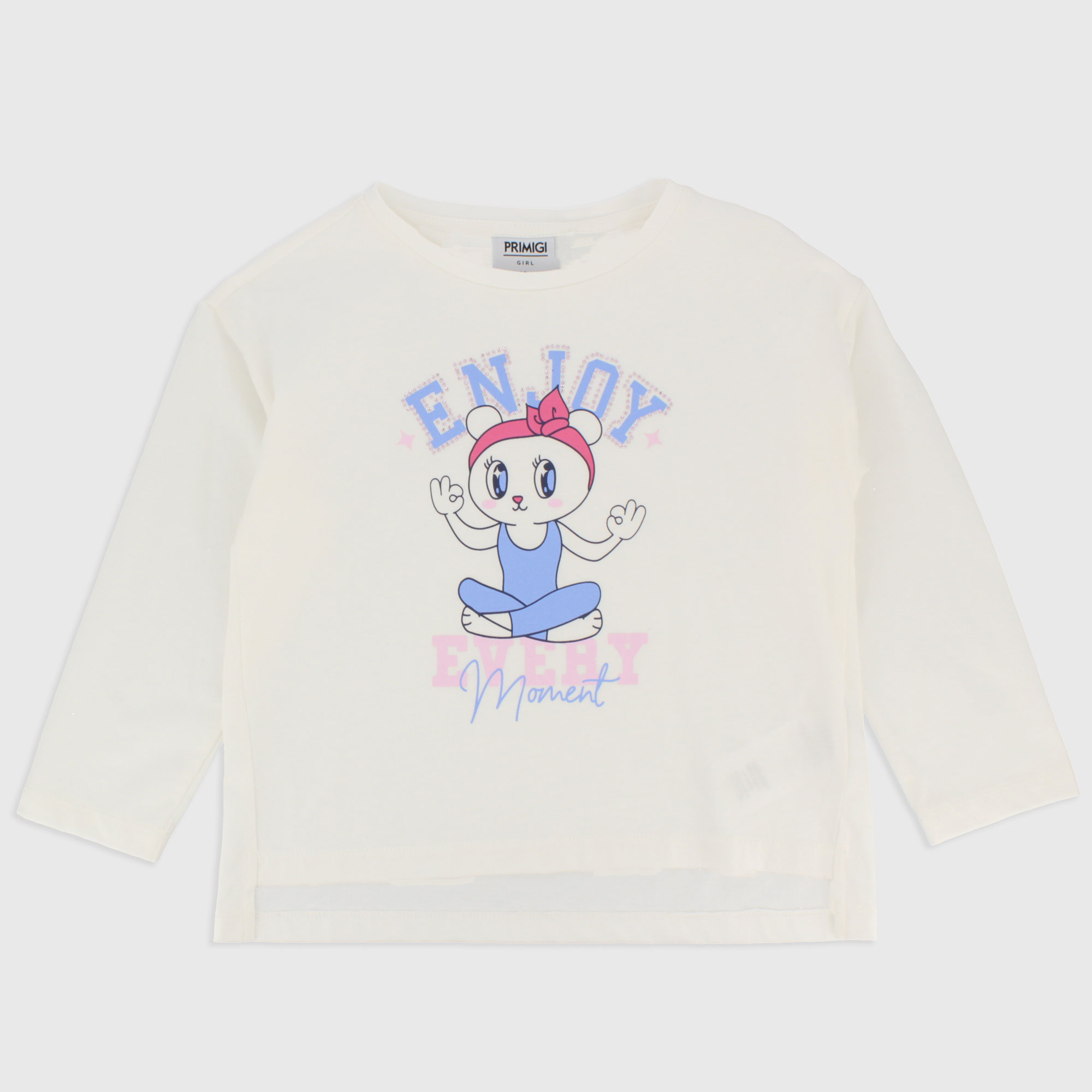Maglietta in jersey, girocollo, a maniche lunghe. Stampa con strass sul davanti.
