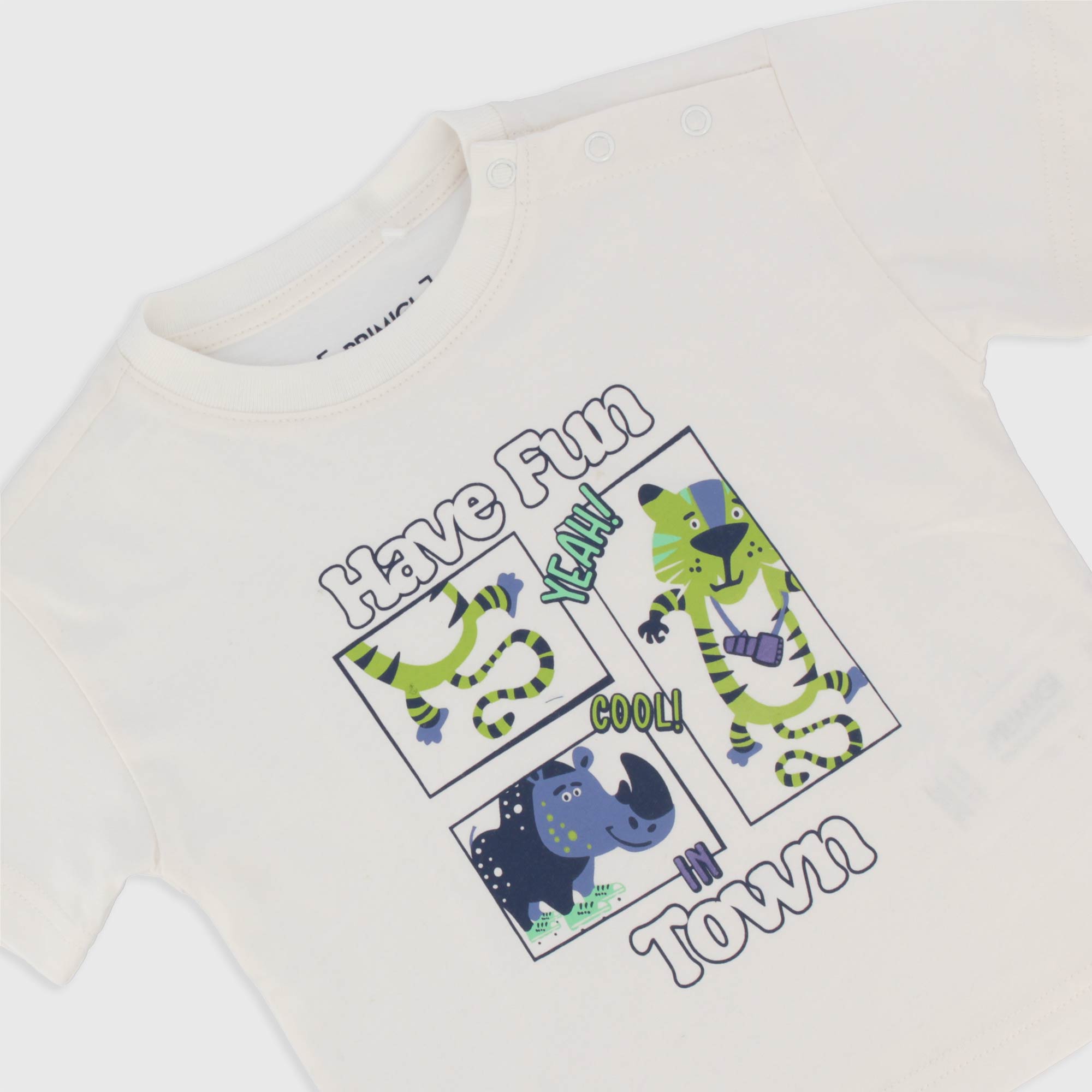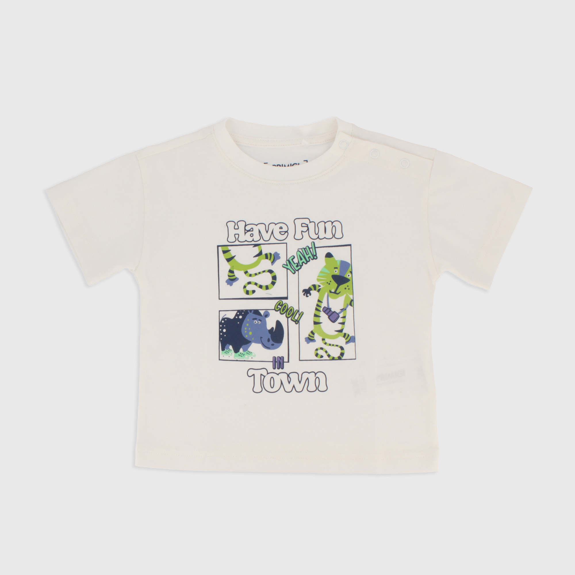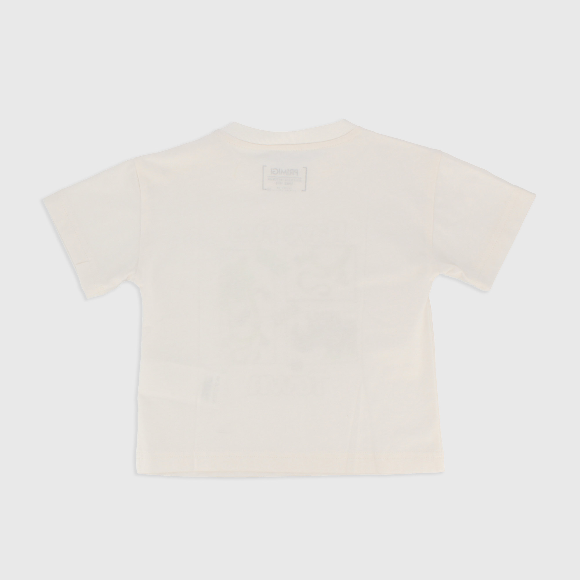 Maglietta oversize in jersey, girocollo, a maniche corte. Chiusura con bottoni automatici sulla spalla. Stampa frontale.