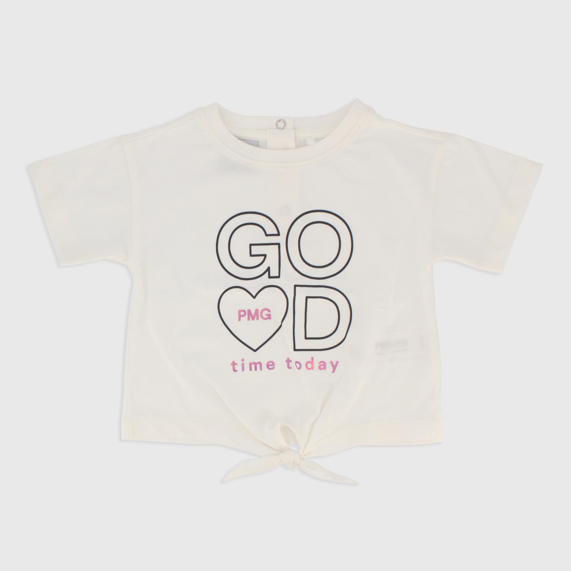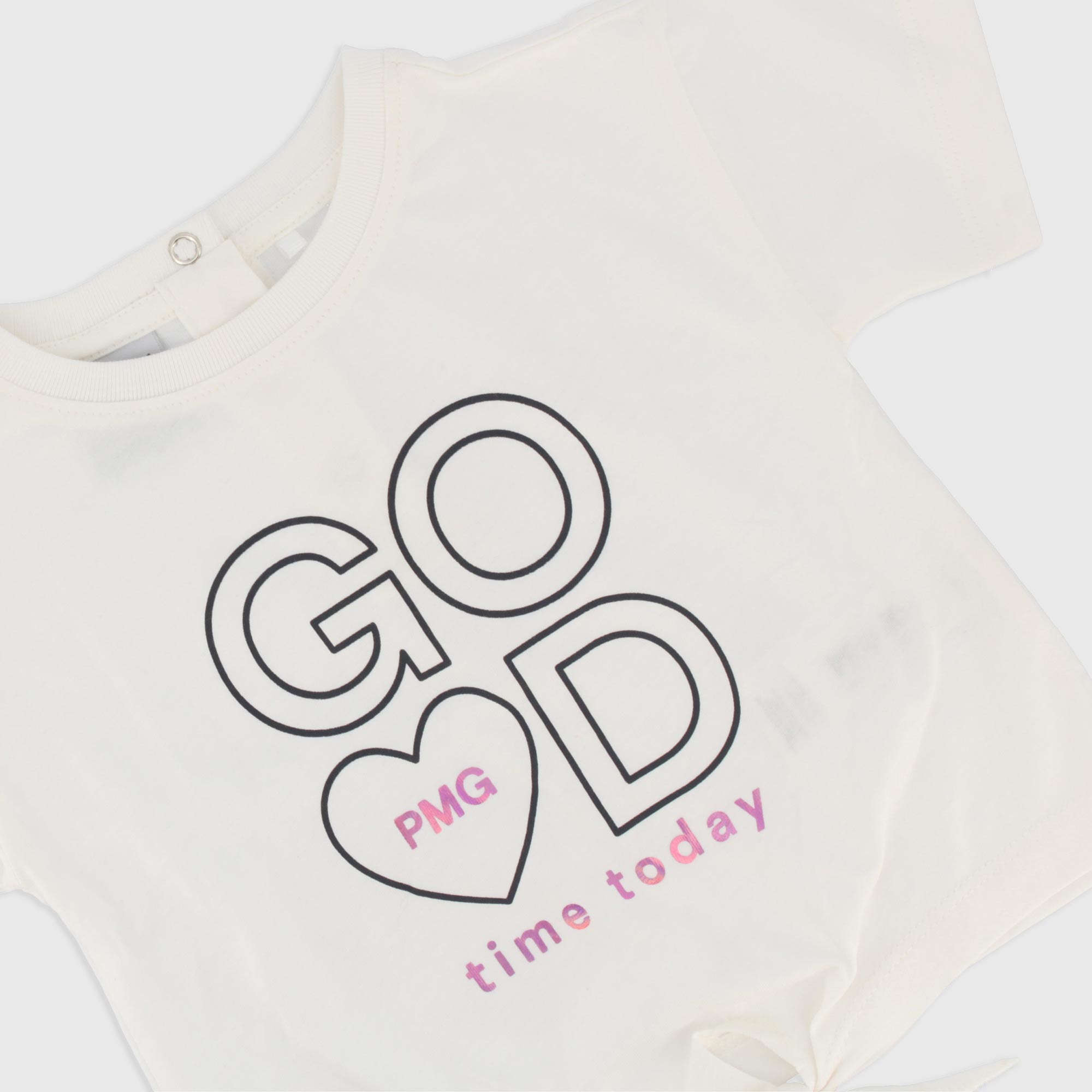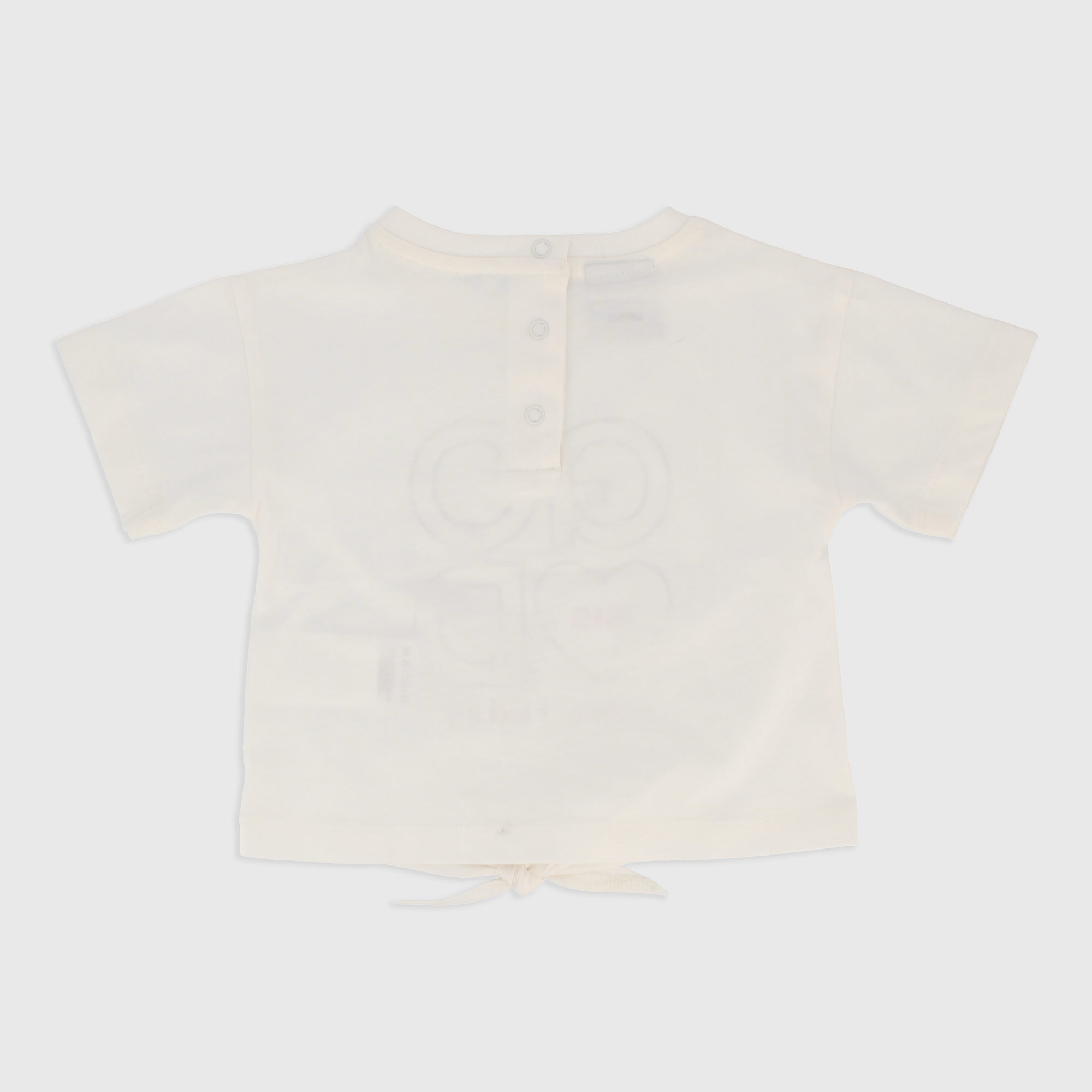 Maglietta in jersey, girocollo, a maniche corte. Chiusura posteriore con bottoni automatici. Stampa con dettagli metallizzati e nodo sul davanti.