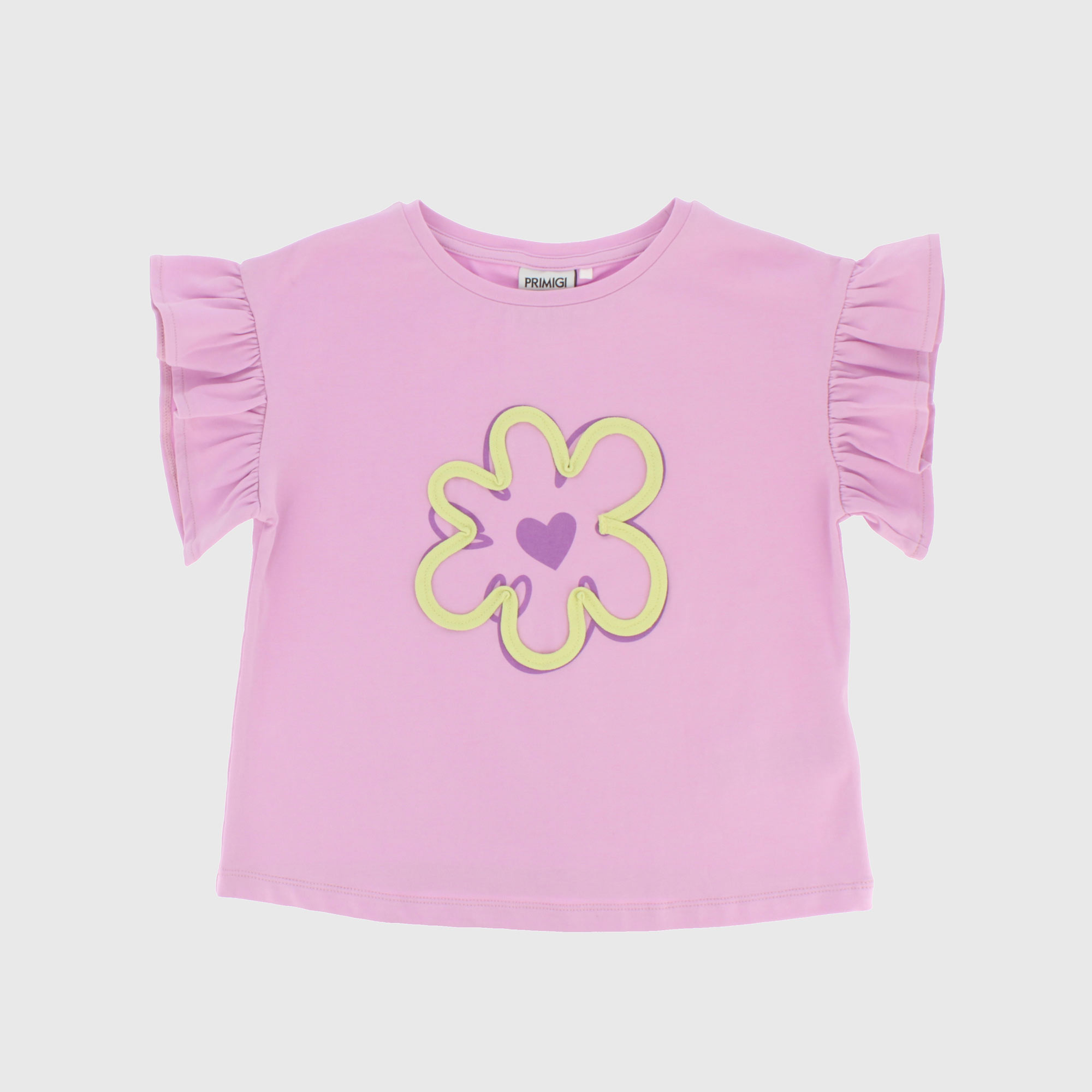 Maglietta in jersey, girocollo, a maniche corte con volants. Stampa con applicazione a forma di fiore sul davanti.