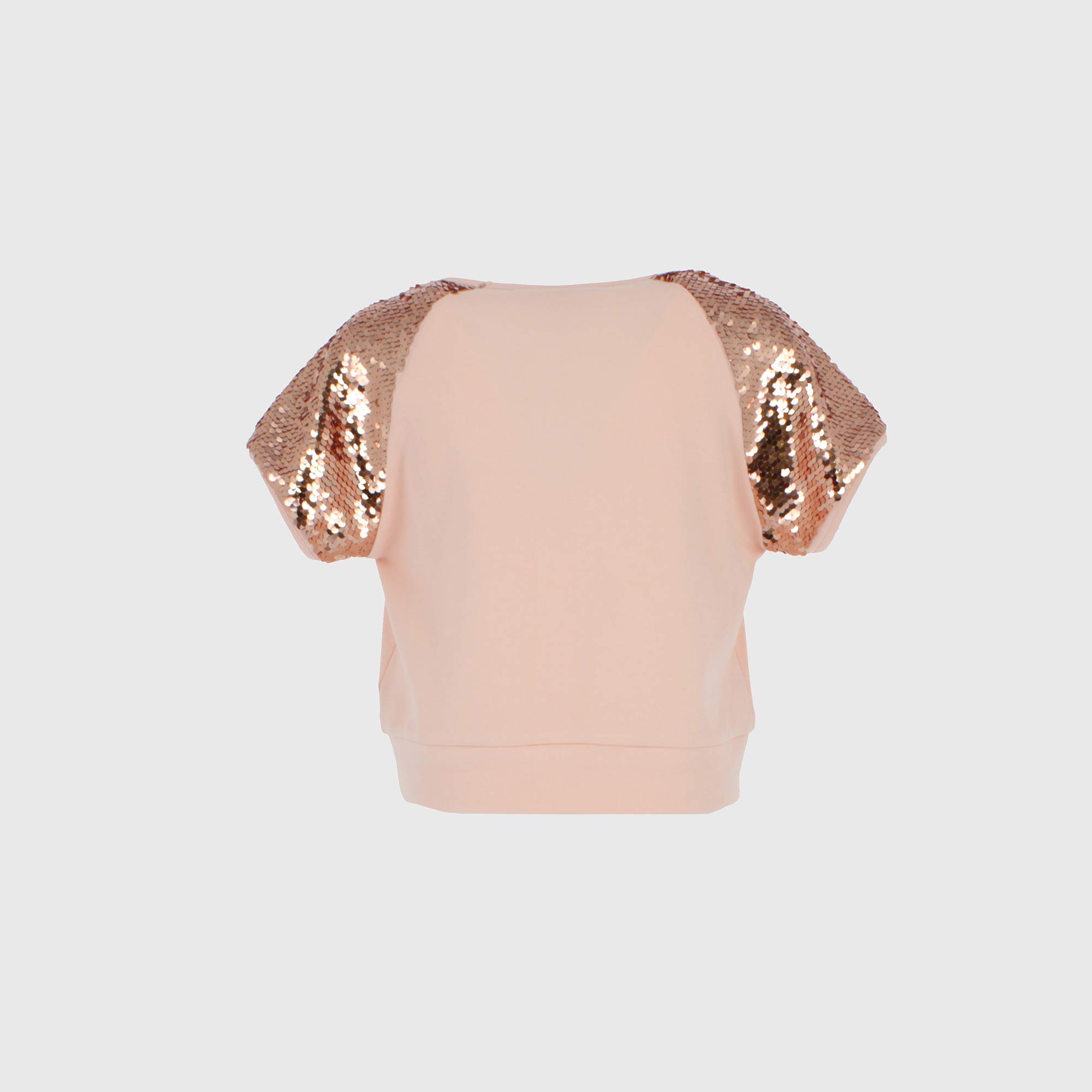 Maglietta in interlock, girocollo, con maniche corte di paillettes.