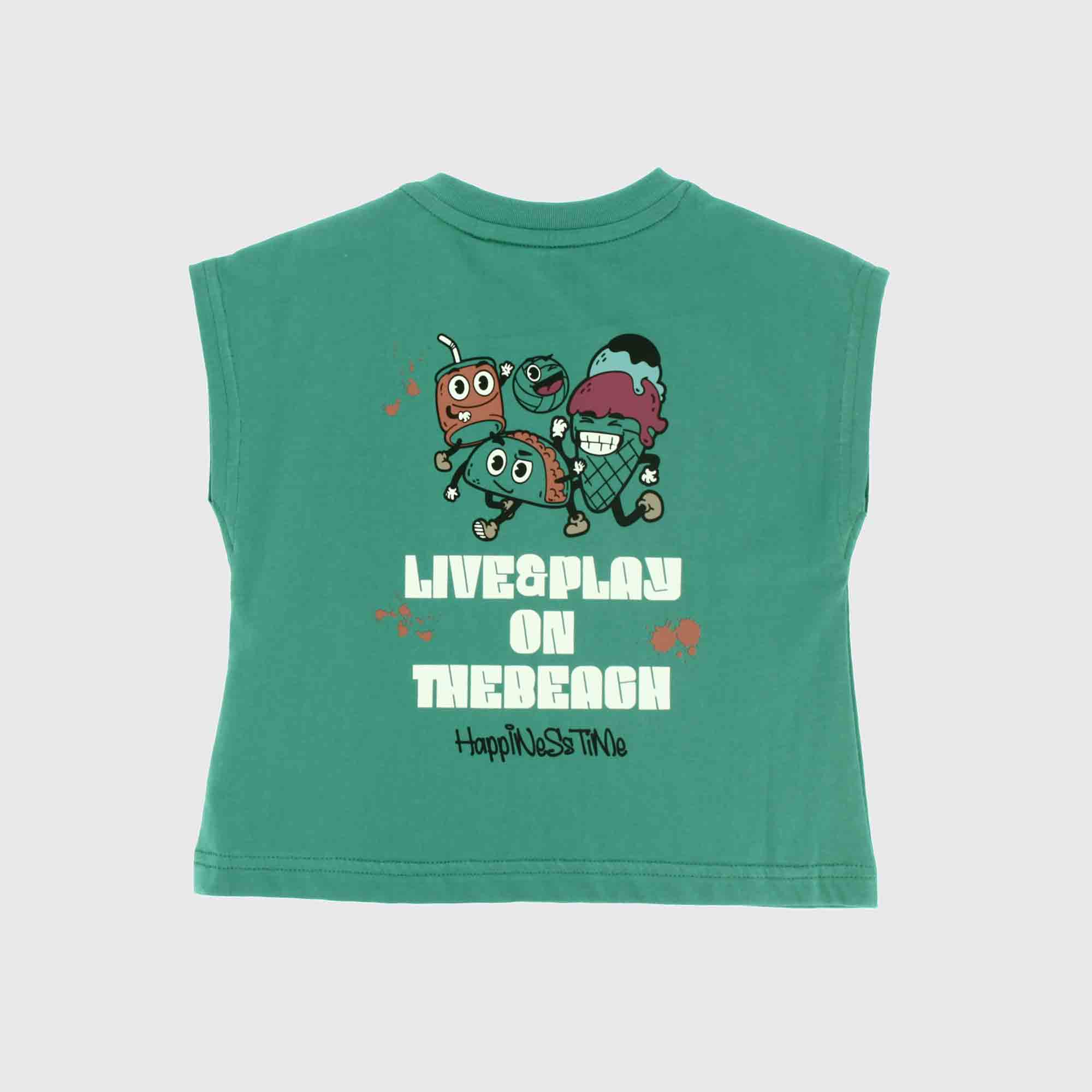 Canotta oversize in jersey, girocollo. Chiusura con bottoncini automatici sulla spalla. Taschina sul petto e stampa sul fronte e sul retro.