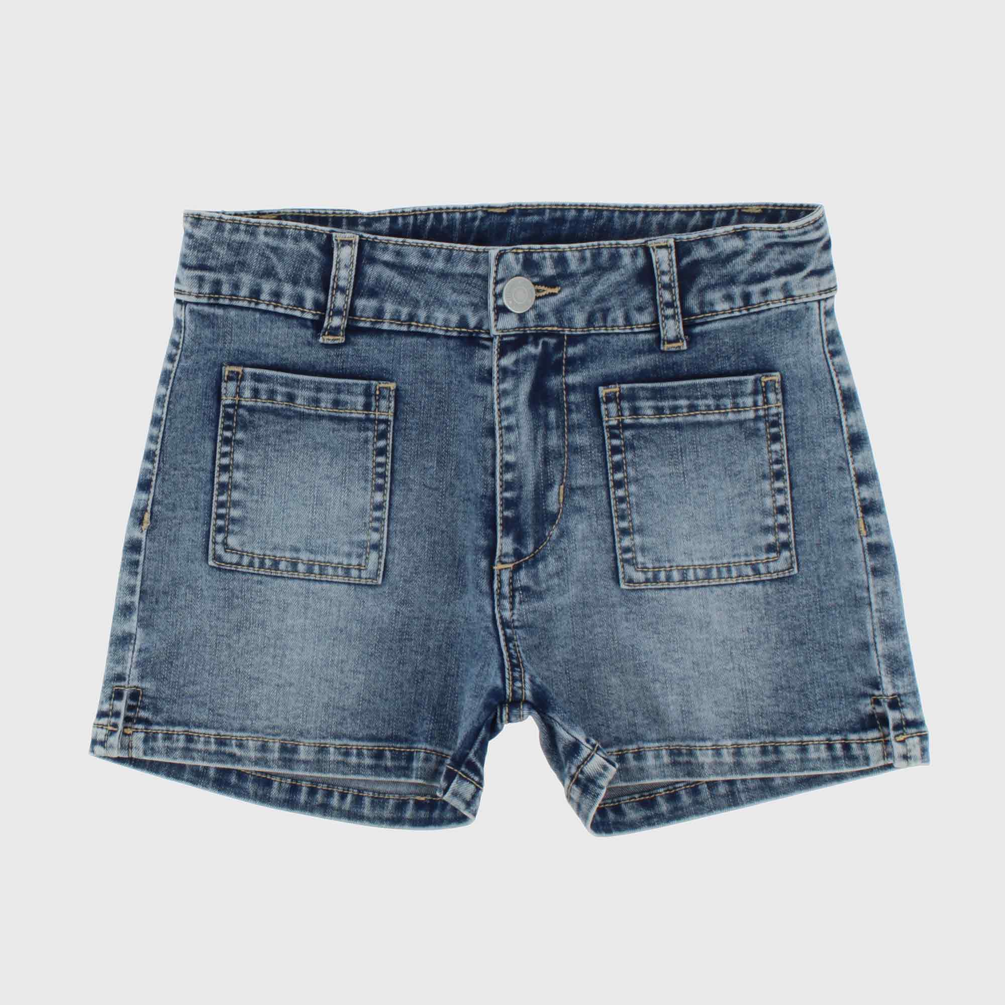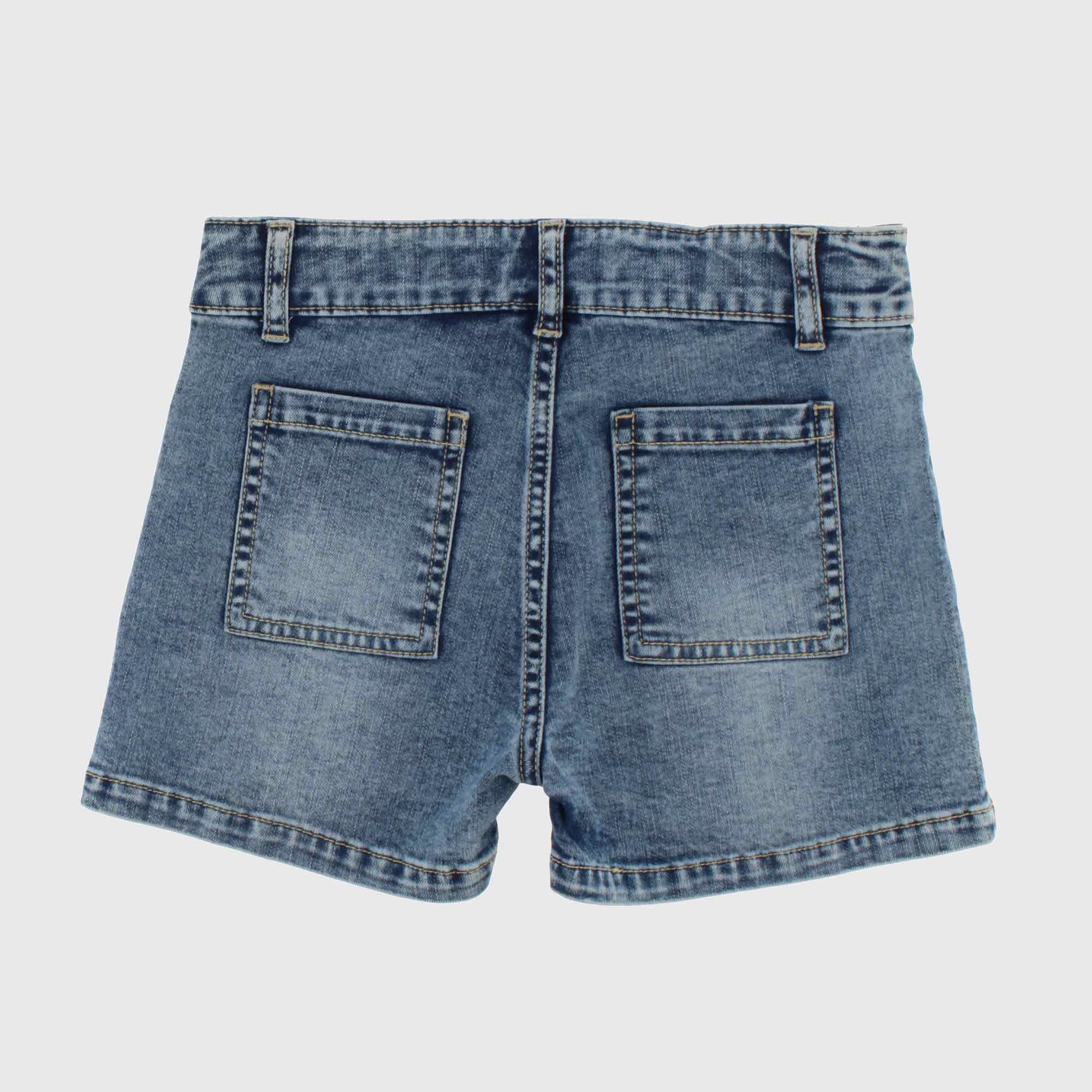 Shorts in jeans con vita regolabile all'interno. Chiusura con bottone e zip. Tasche a toppa sul davanti e sul retro. Spacchetti ai lati sul fondo.