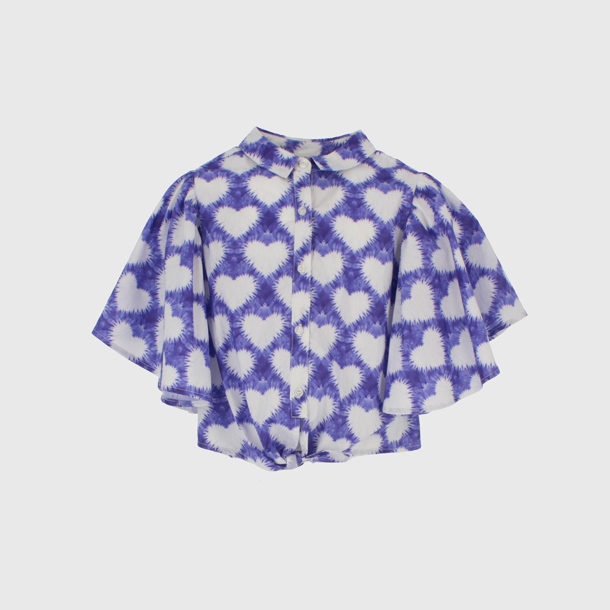 Camicia in cotone stampato, con maniche corte a farfalla. Chiusura con bottoni sul davanti. Nodo frontale.
