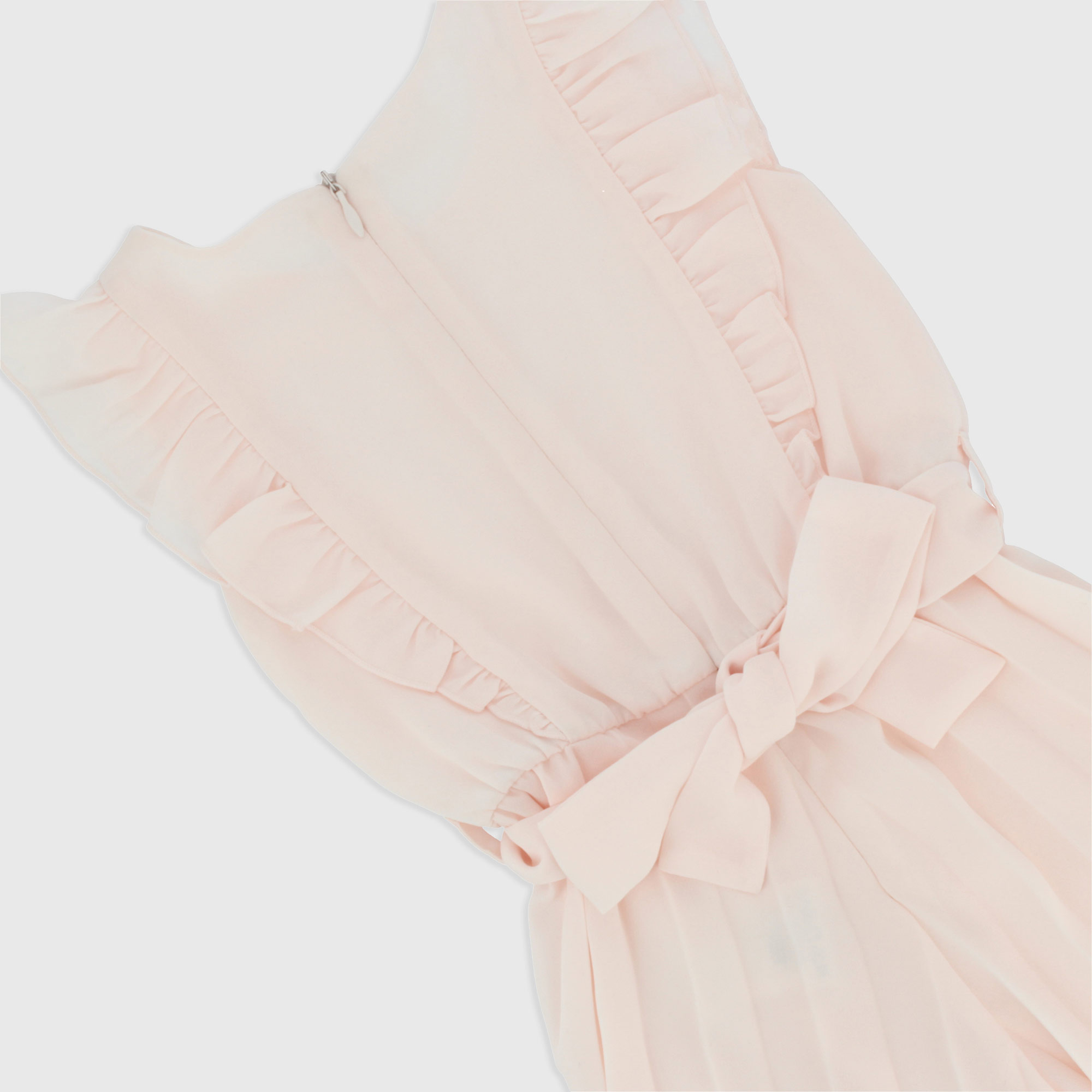 Tuta con scollo rotondo, giromanica, e pantalone plissettato. Volants applicati su corpetto. Elastico in vita e chiusura con zip invisibile sul retro. Fodera a pantaloncino. Cinta staccabile.