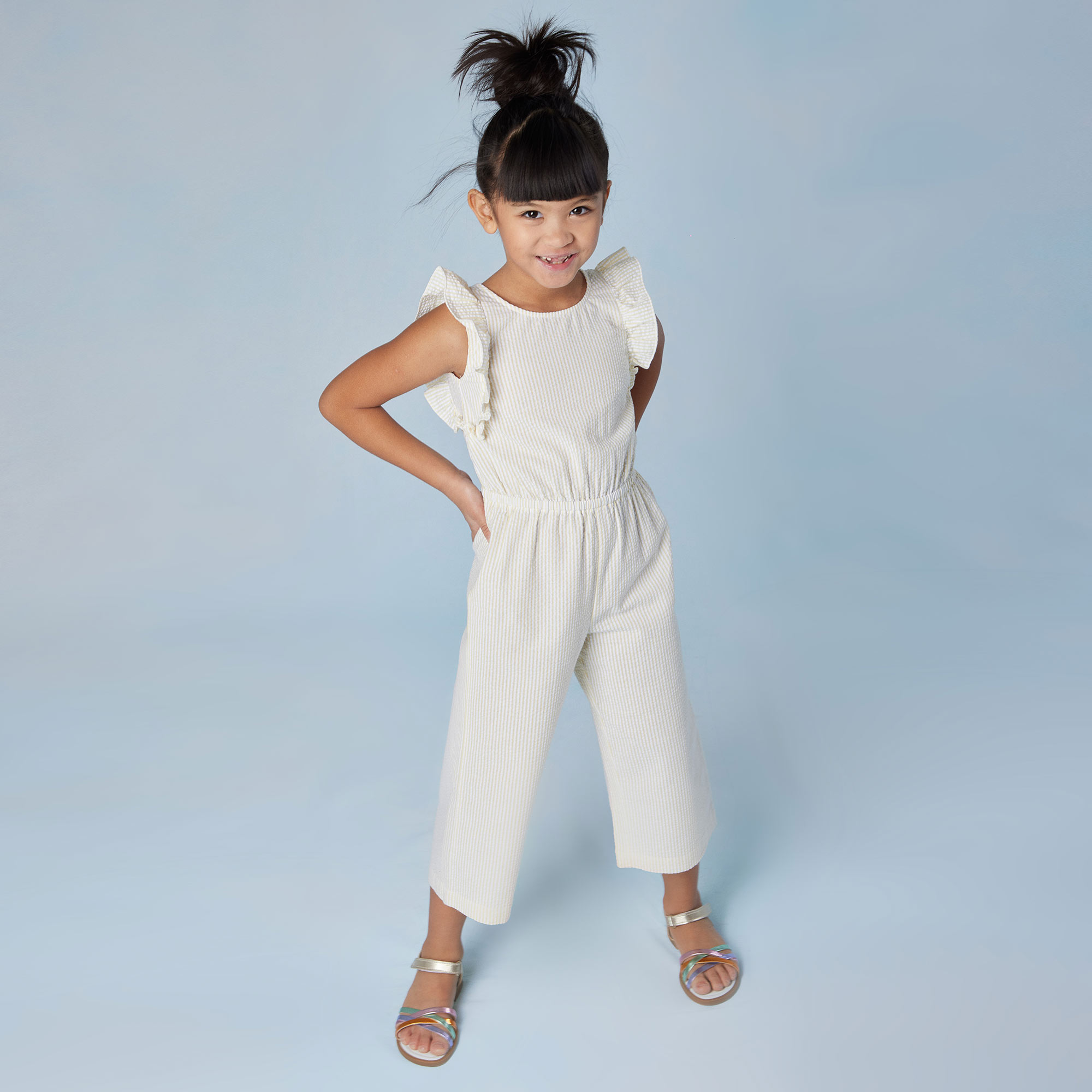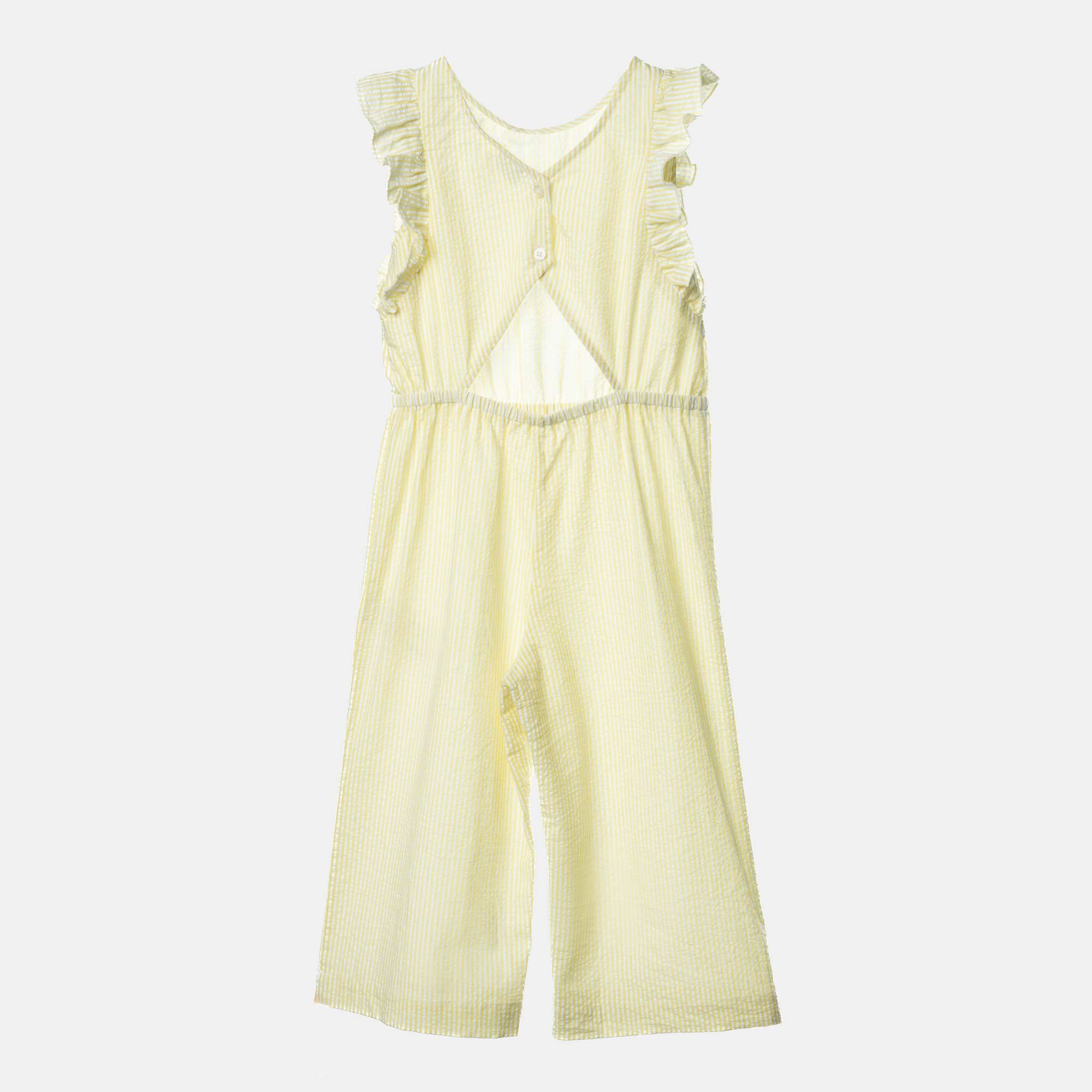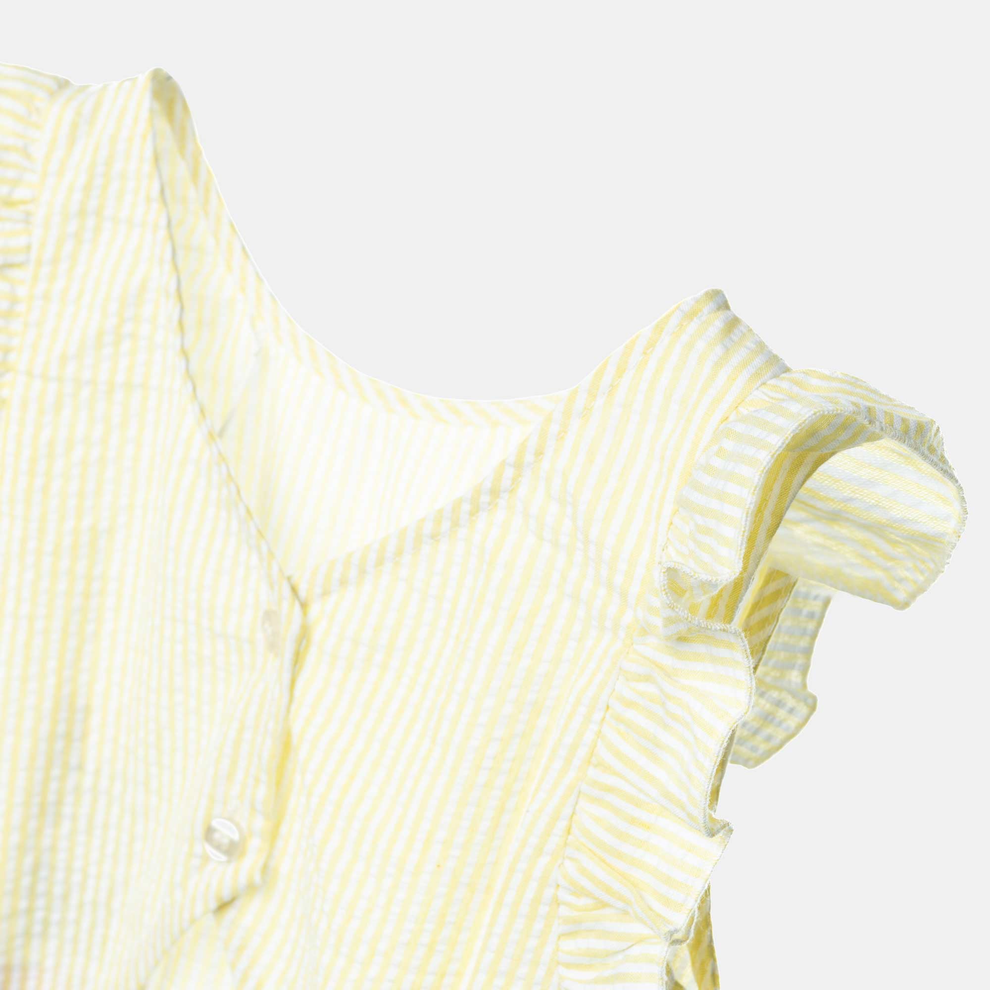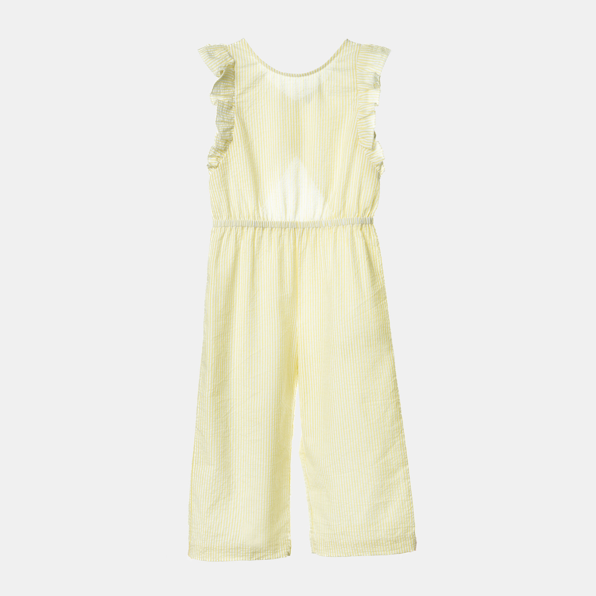 Tuta riga tinto filo, scollo rotondo, giromanica. Volants applicati sulle spalle. Chiusura posteriore con bottoncini . Elastico in vita.