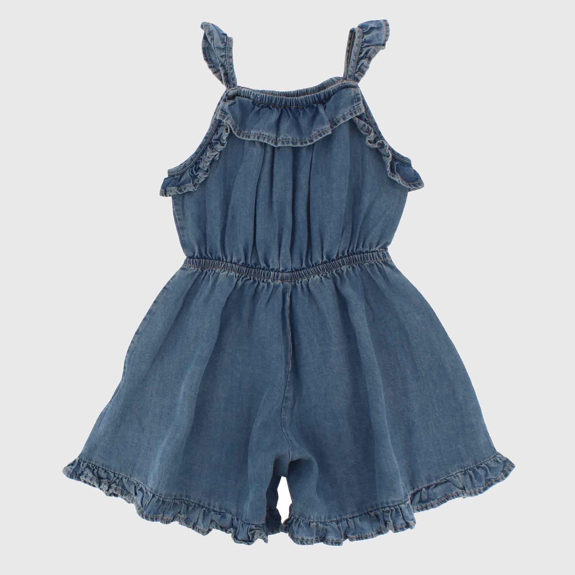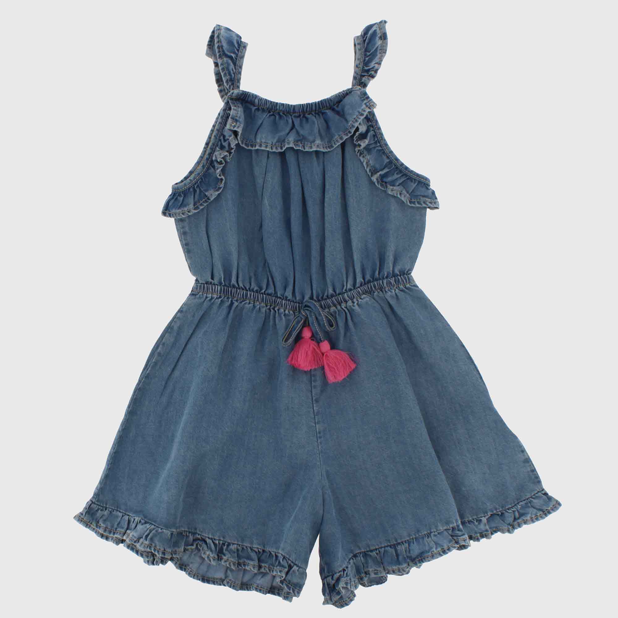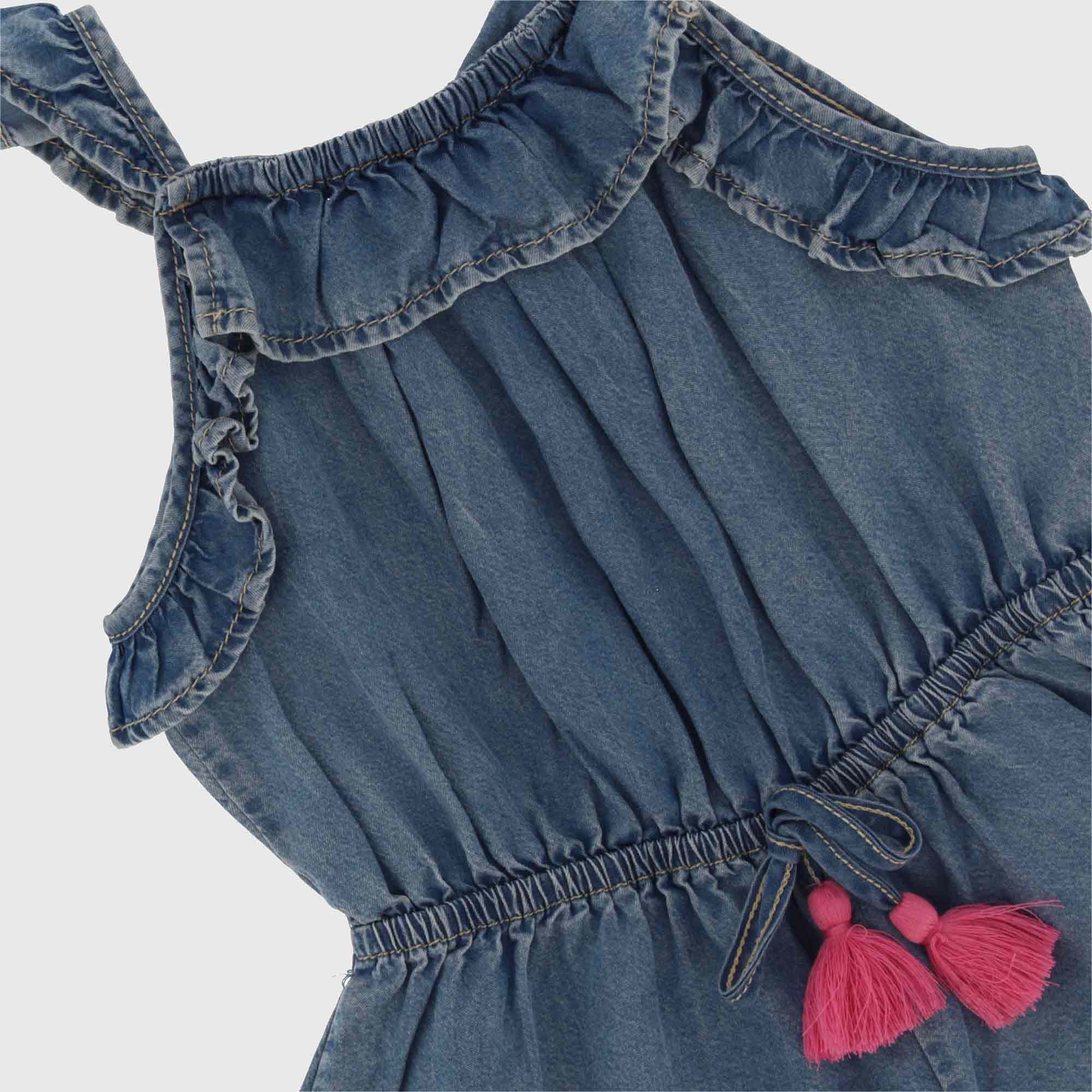 Salopette in jeans leggero. Volants applicati su bretelline e sul fondo. Elastico in vita con cordoncino e nappine a contrasto.
