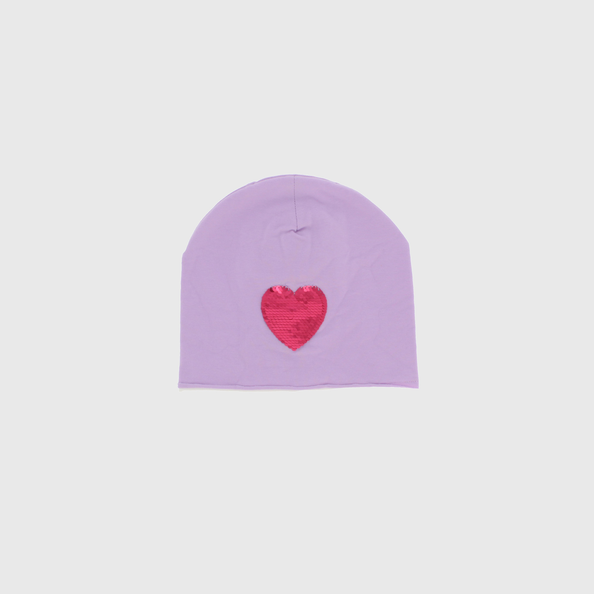 Berretto in jersey con fodera a contrasto e cuore in paillettes.