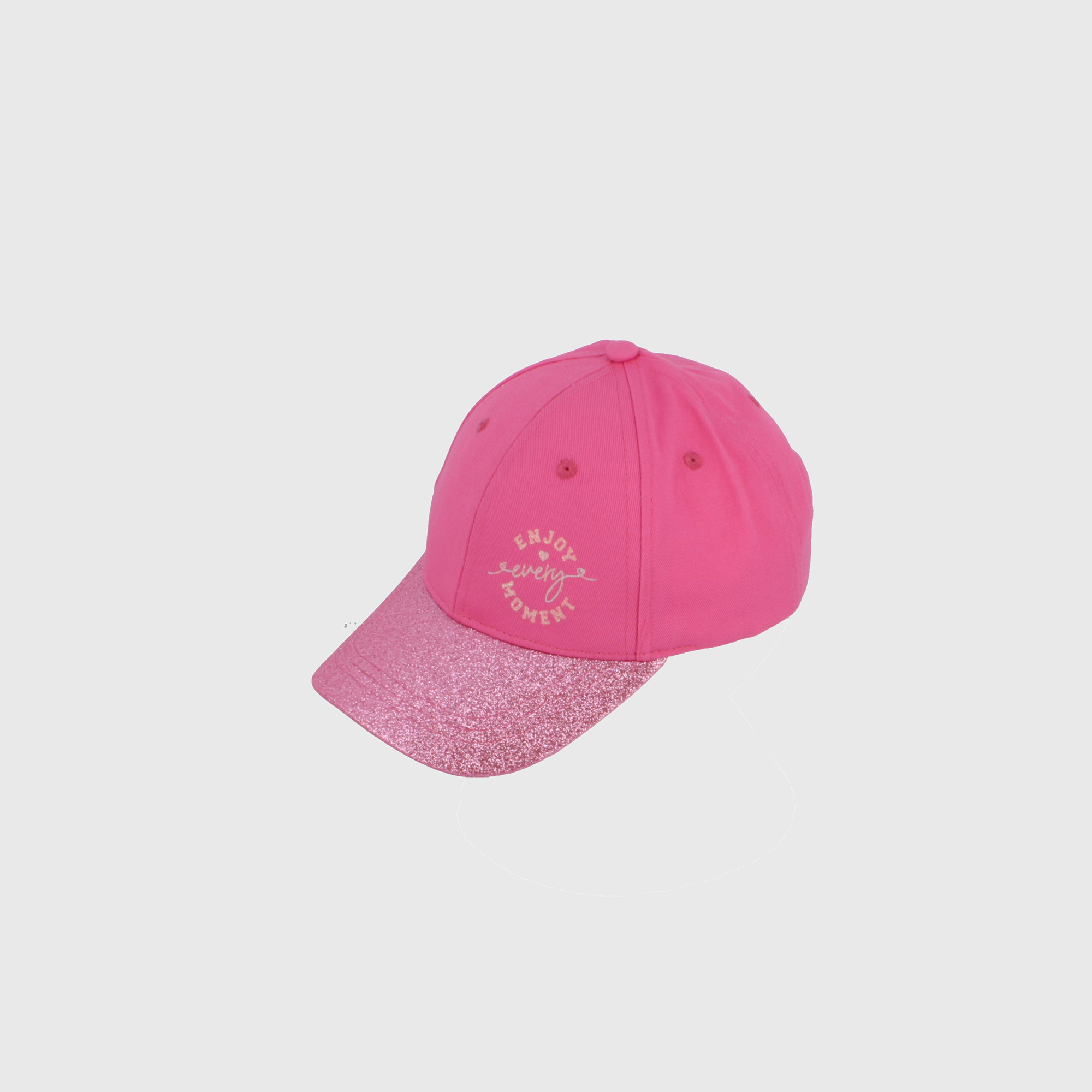 Cappello baseball con piccola stampa e visiera glitter. Nastro in velcro regolabile sul retro.