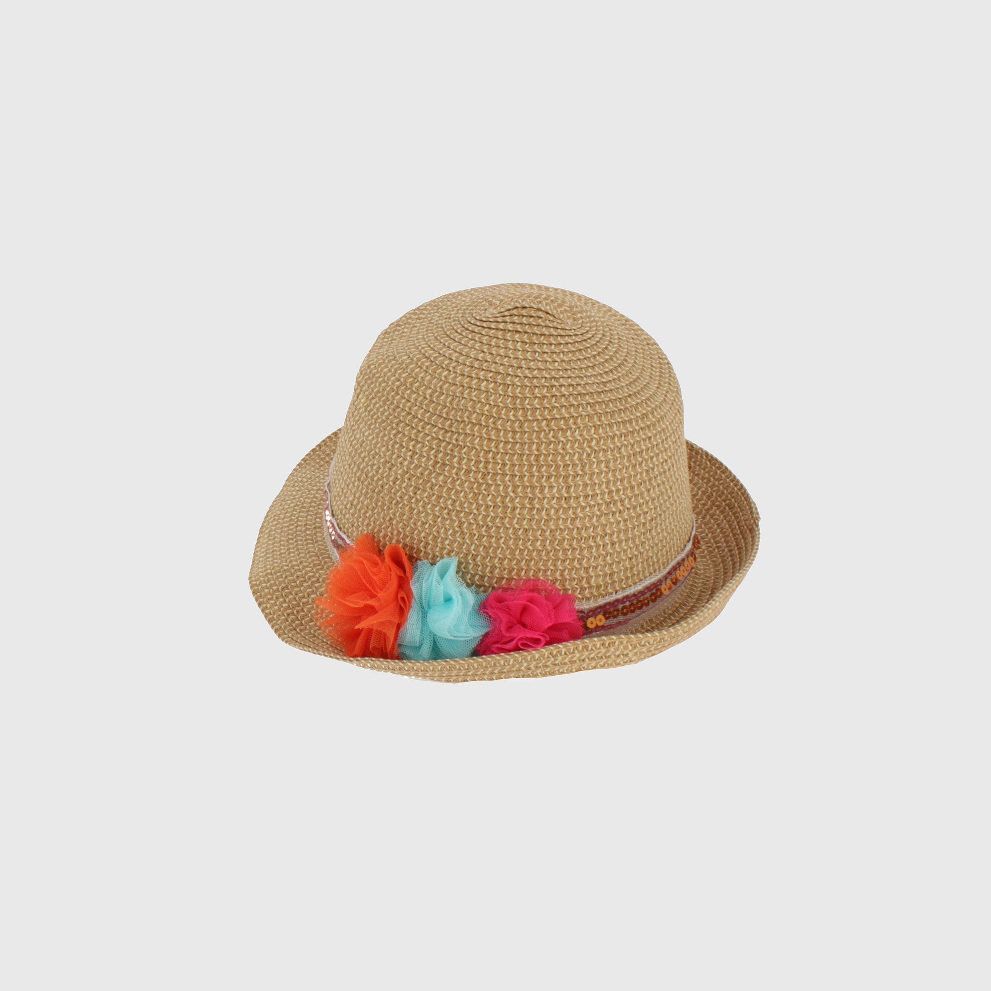 Cappello in paglia con nastro di paillettes e fiocchi in tulle.