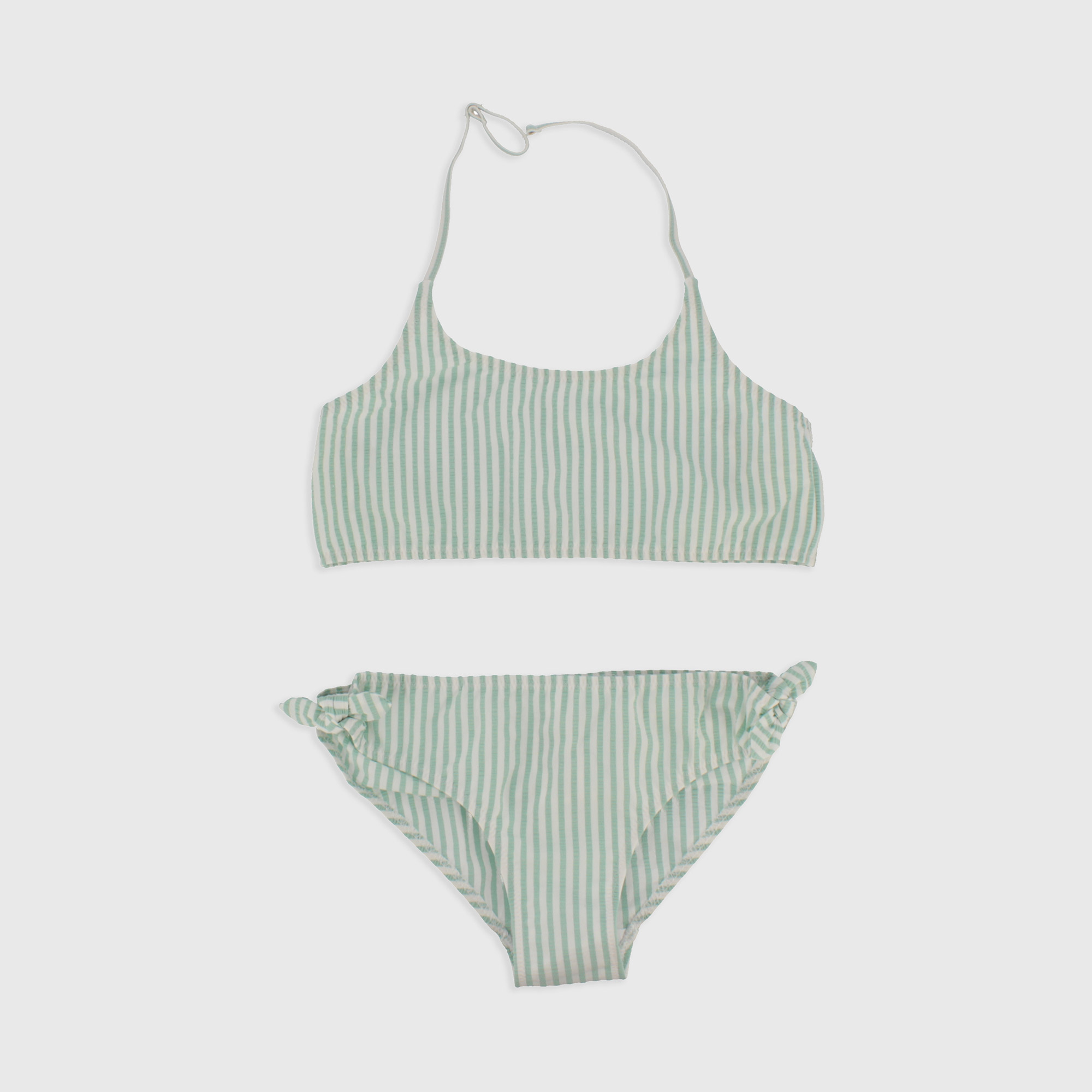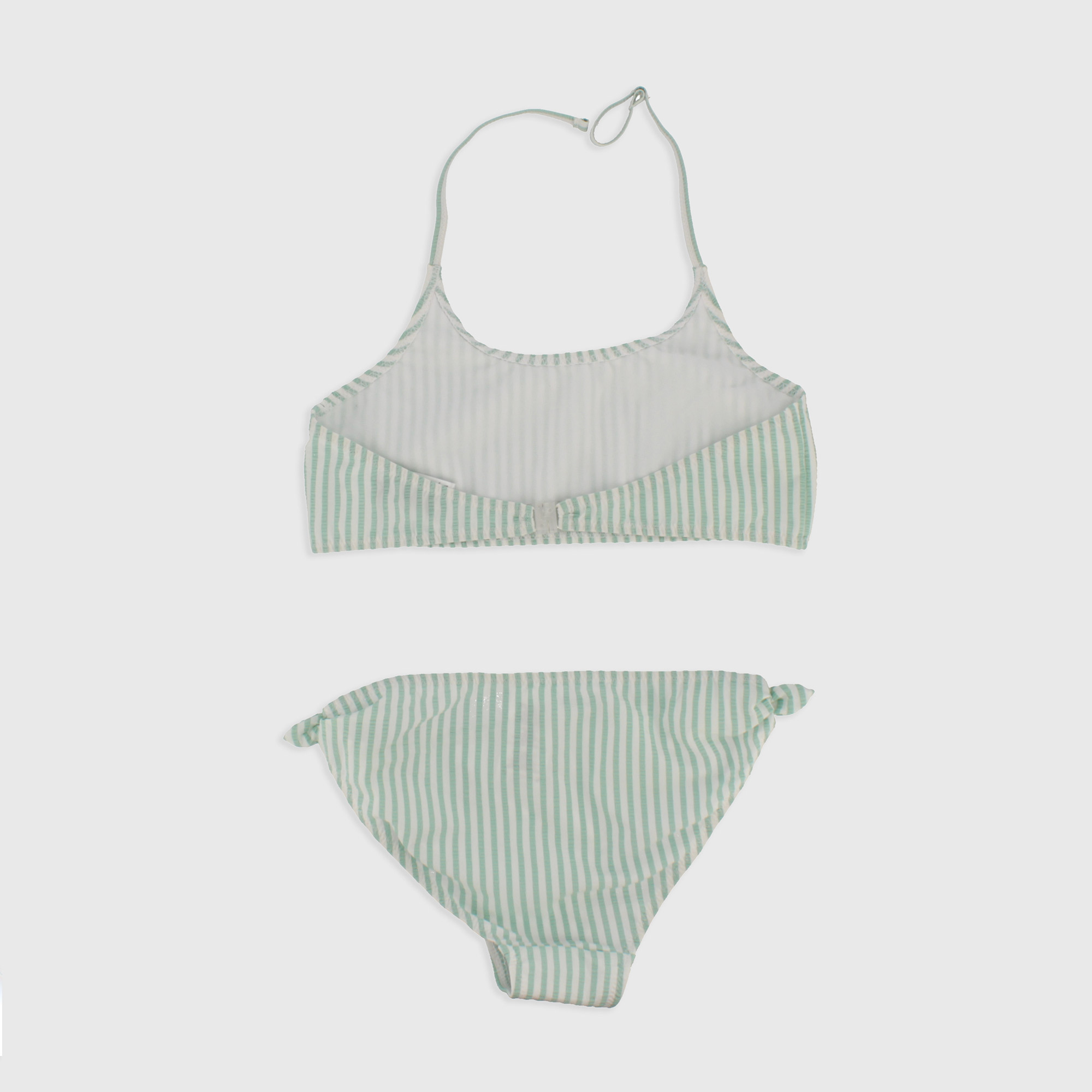 Bikini con top e slip coordinati. Top con spalline sottili. Slip con fiocchetti.