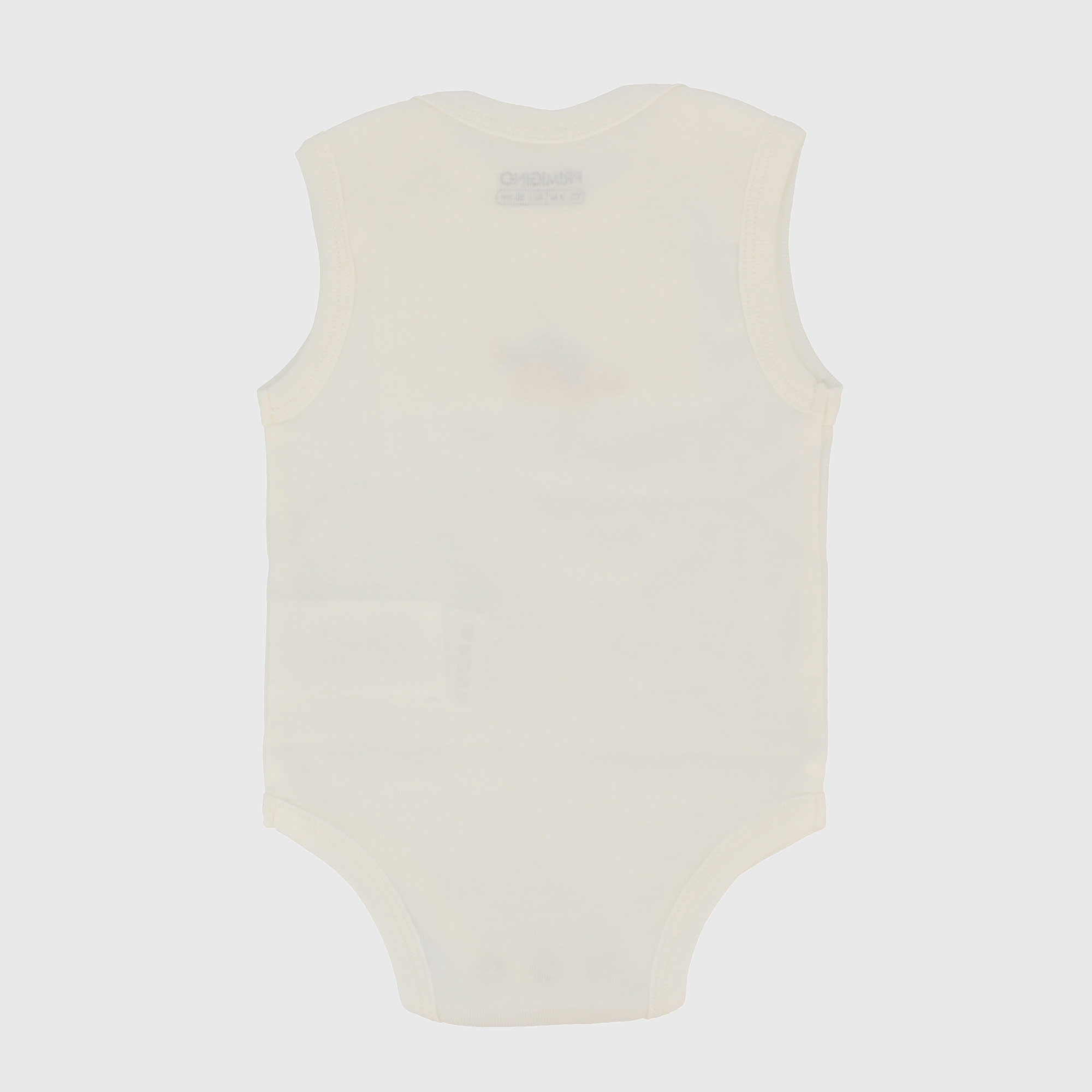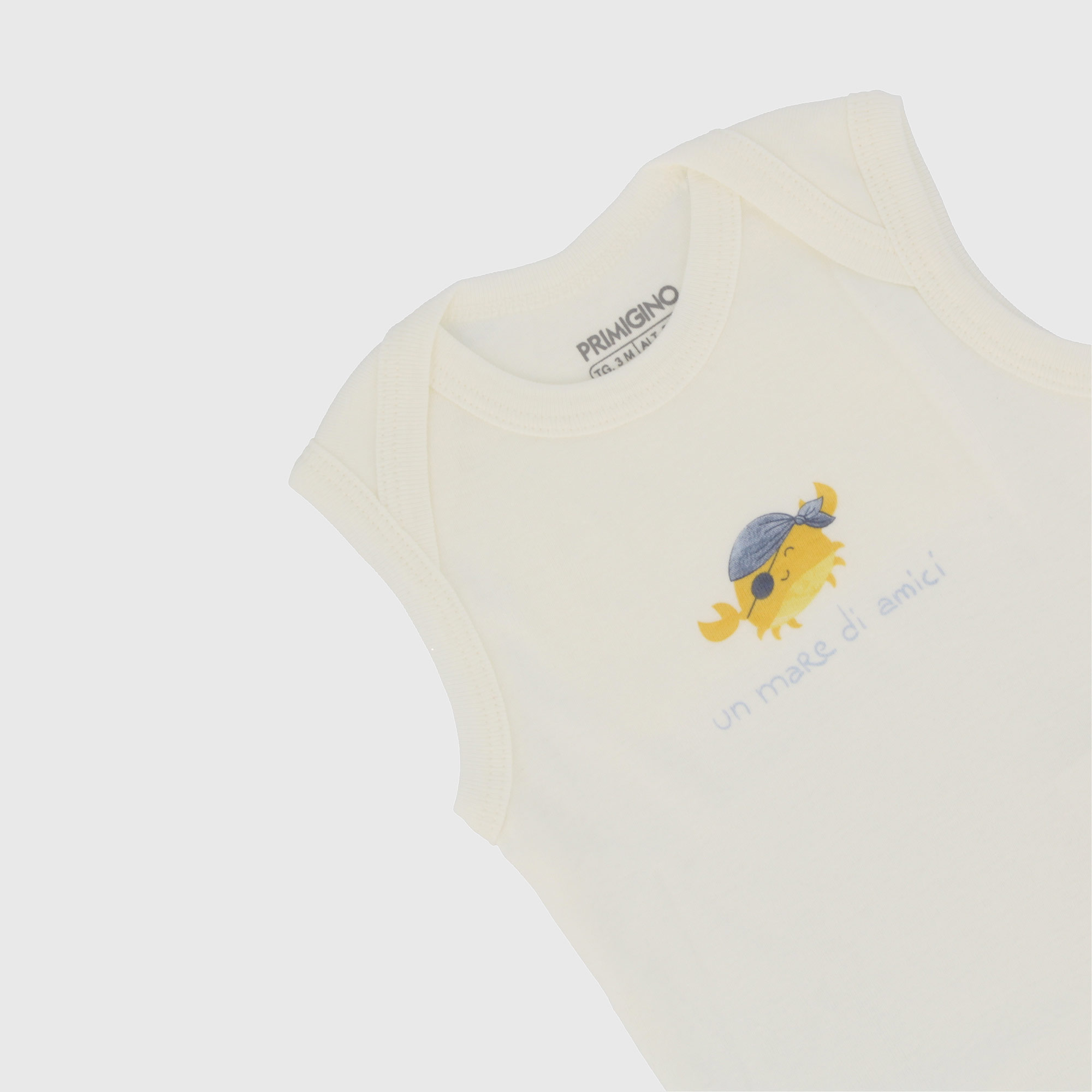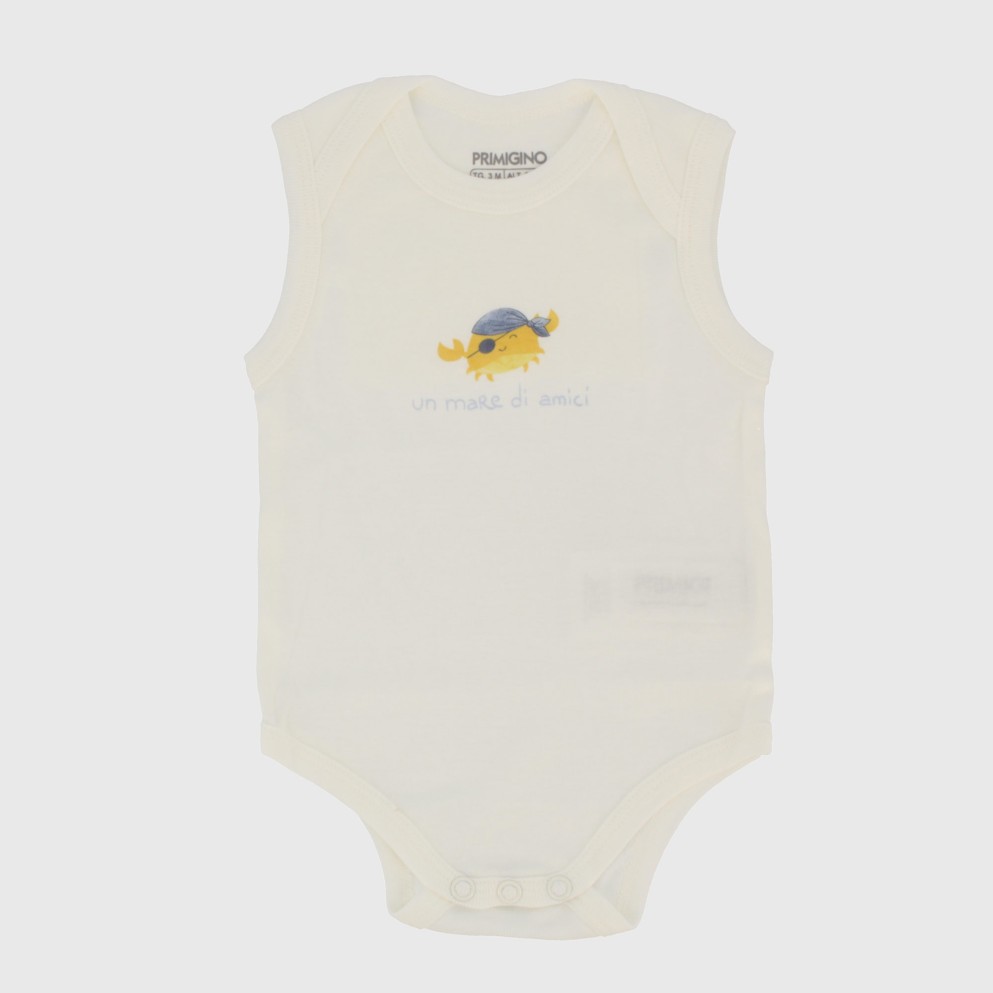 Body in costina girocollo, senza maniche. Chiusura con bottoni automatici sulla parte inferiore. Stampa sul davanti.