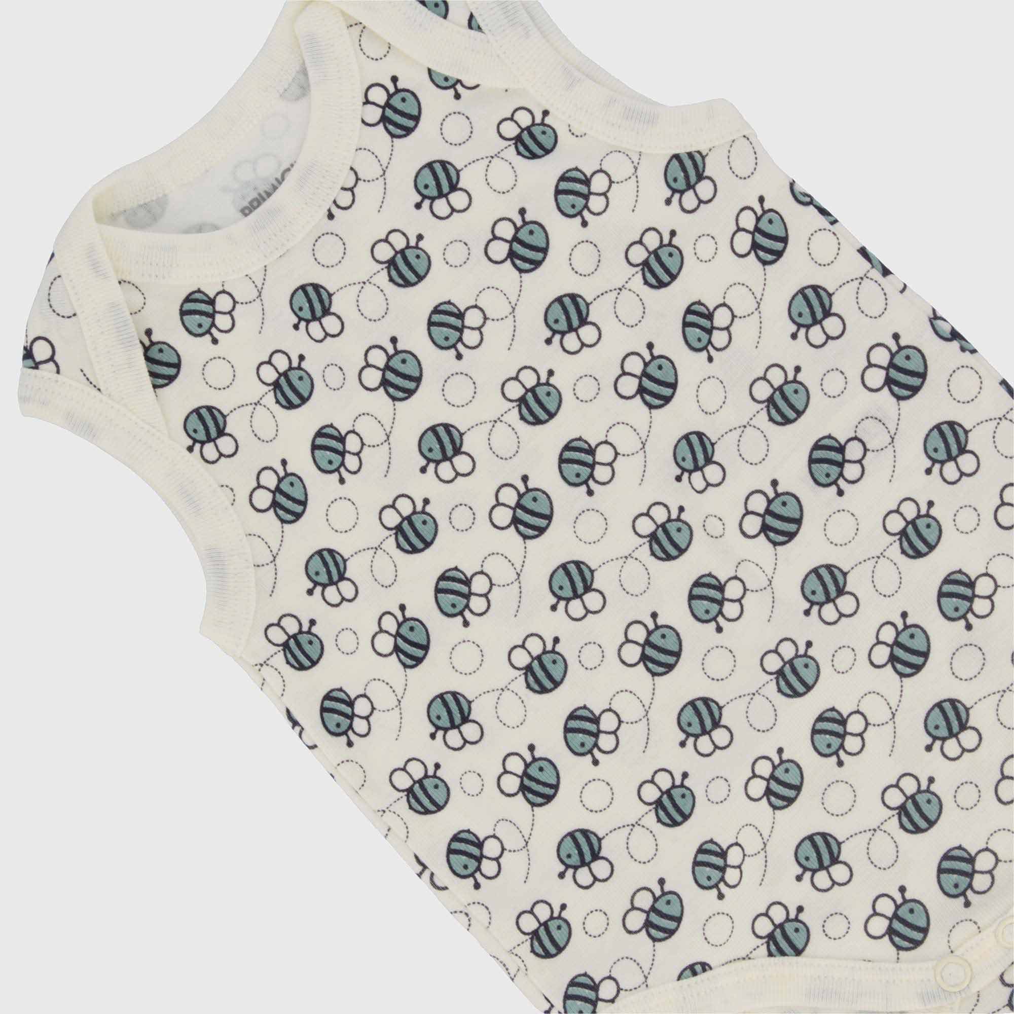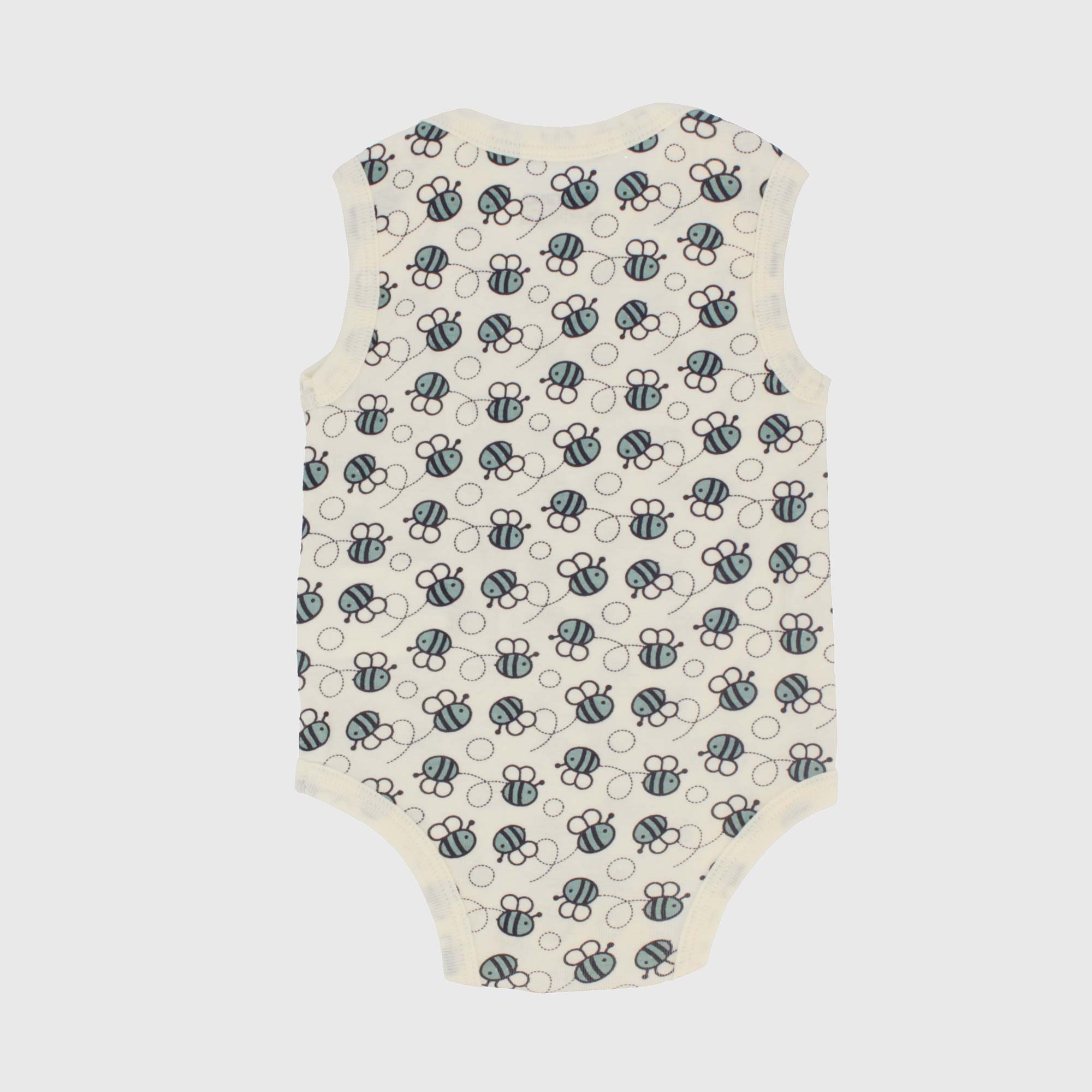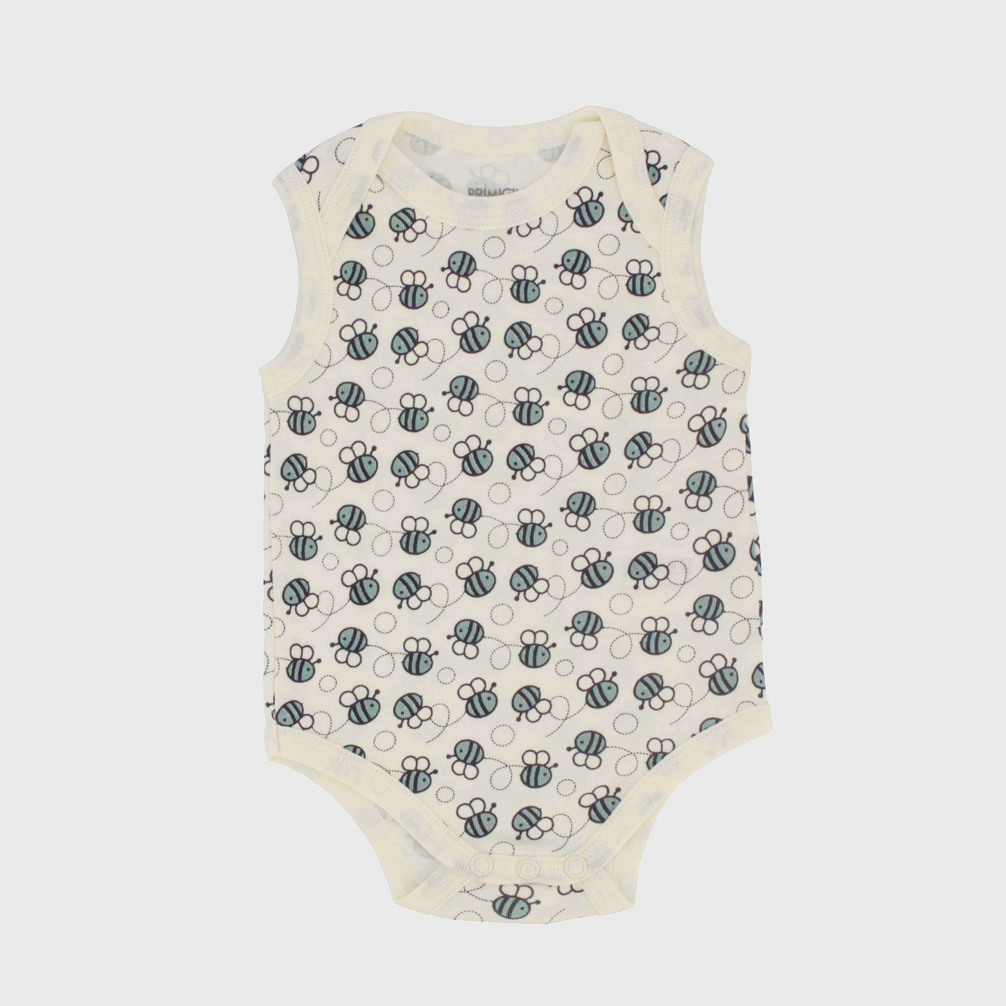 Body in costina girocollo, senza maniche. Chiusura con bottoni automatici sulla parte inferiore. Stampa all-over.