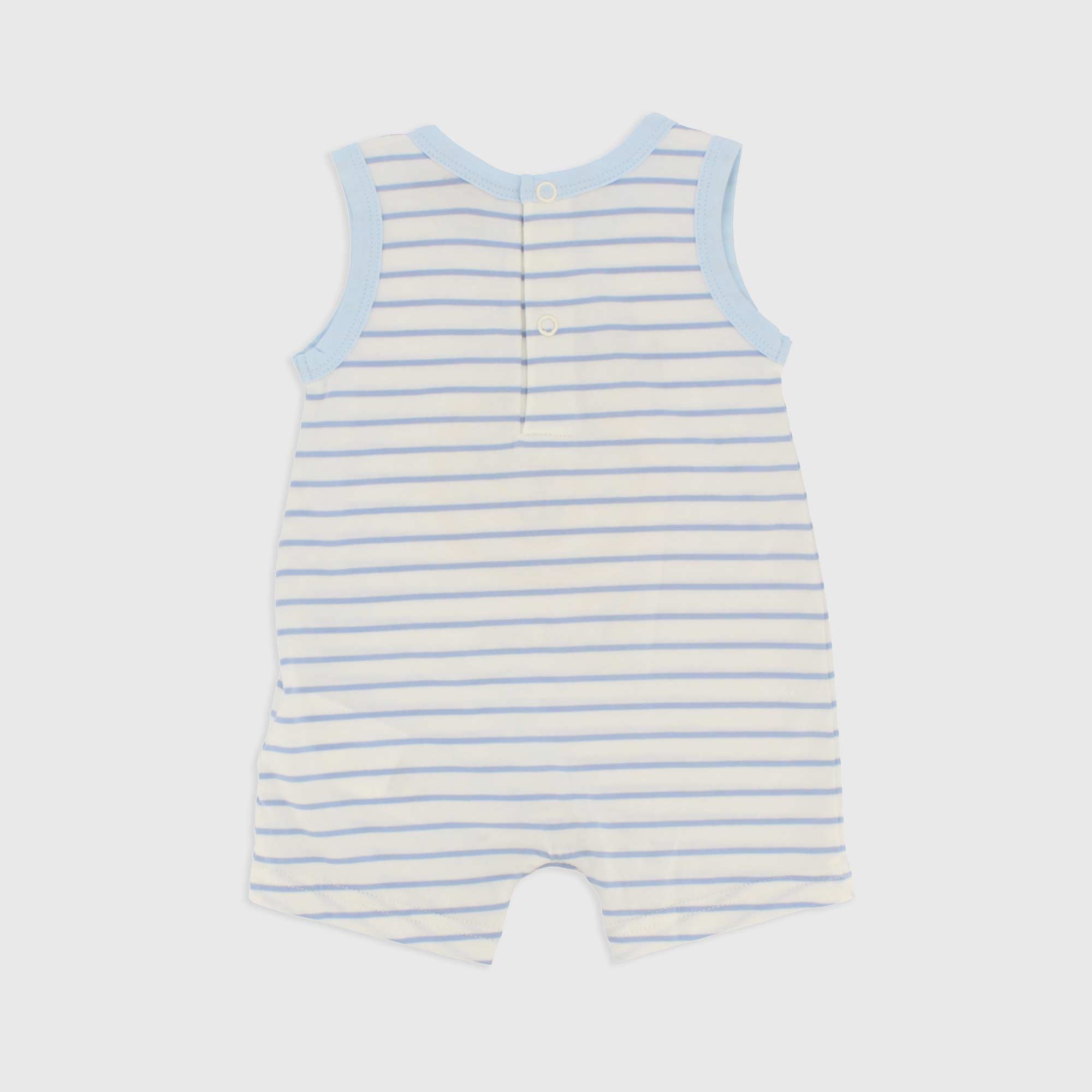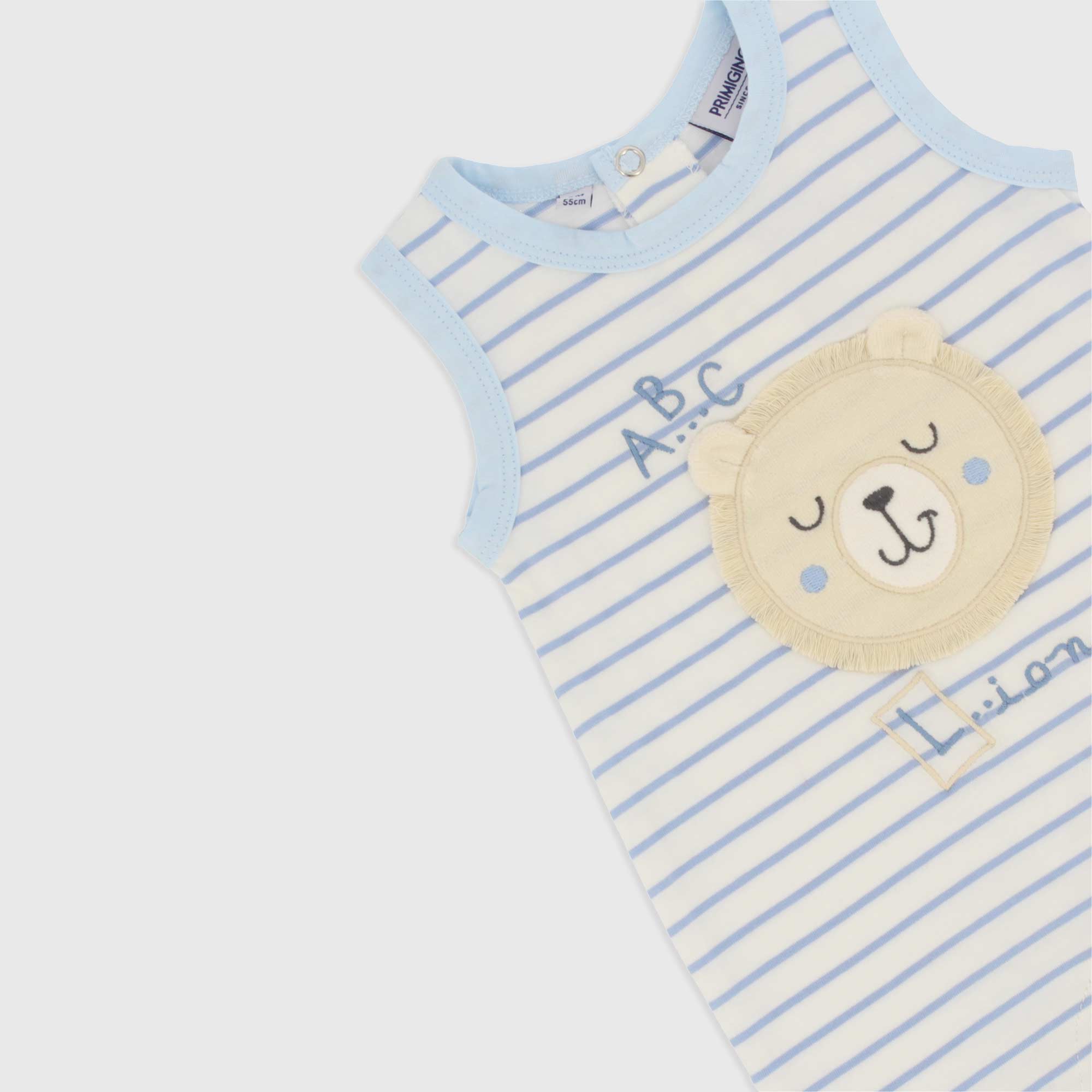 Pagliaccetto in jersey riga tinto filo, girocollo, senza maniche. Chiusura posteriore e sul cavallo con bottoni automatici. Profili a contrasto e patch con ricami sul davanti.