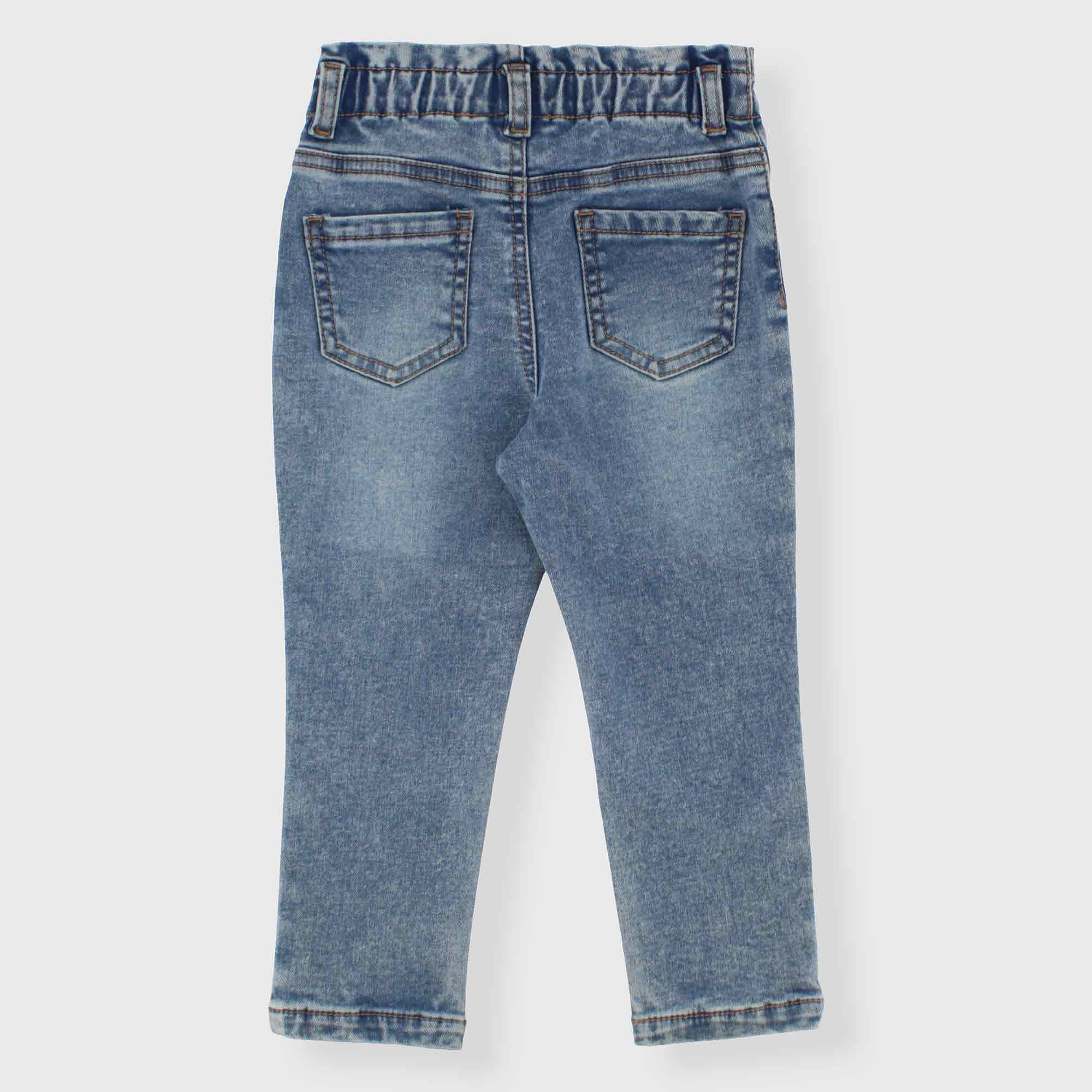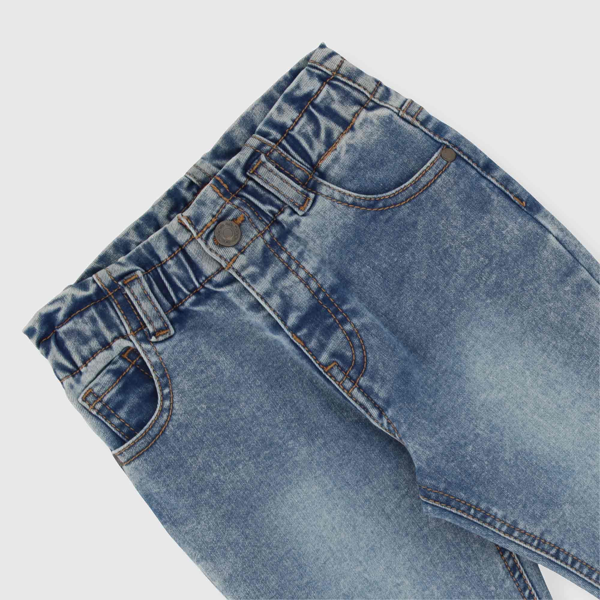 Pantalone in jeans con vita elasticizzata. Chiusura con gancio e zip. Cinque tasche.