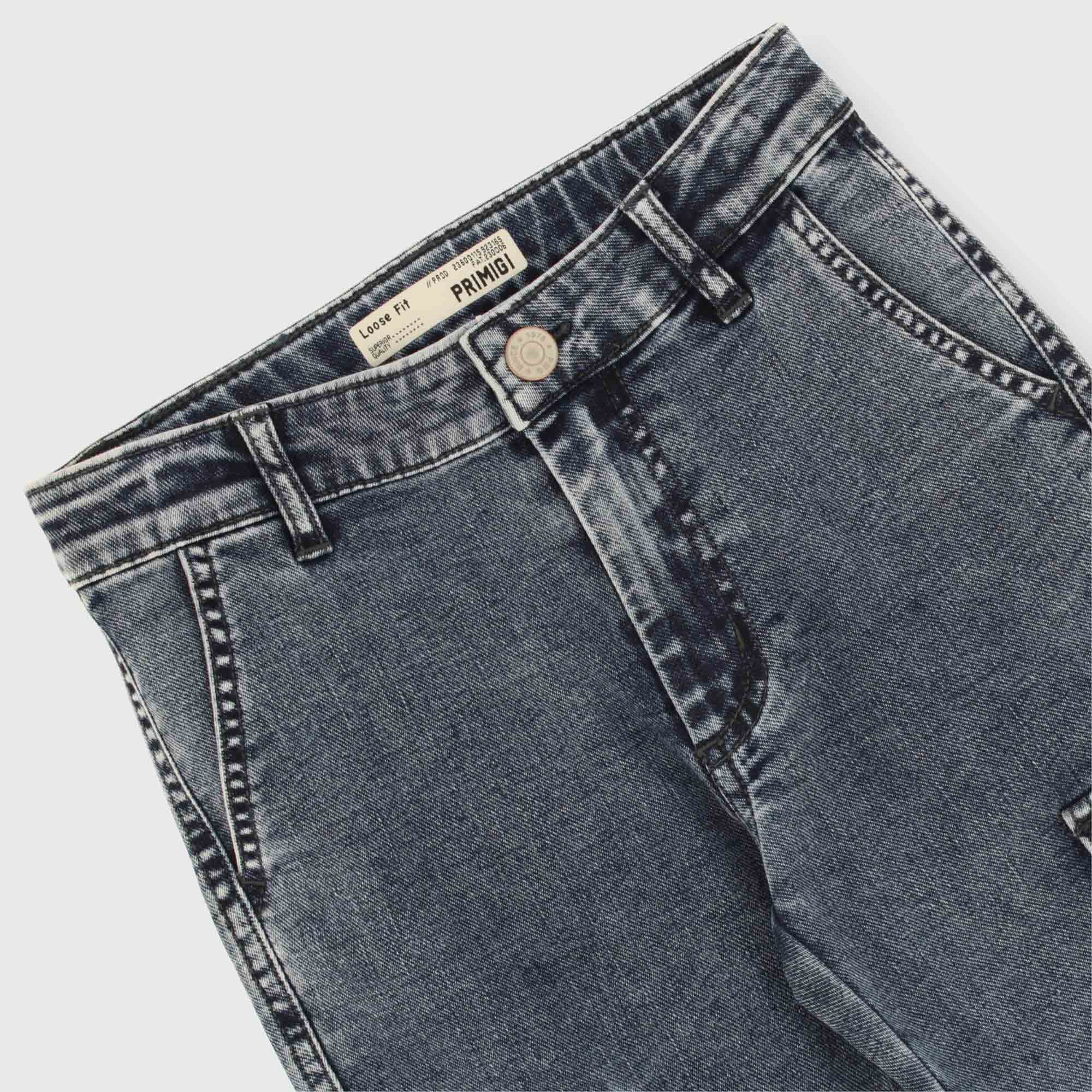 Pantalone in jeans con vita regolabile all'interno. Chiusura con gancio e zip. Tasche alla francese sul davanti, a toppa sul retro, e tasconi sui lati.
