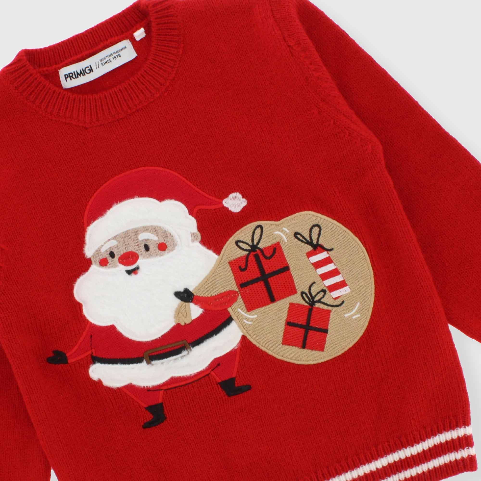 Pullover in morbida maglia, girocollo, maniche lunghe. Motivo natalizio sul davanti. Polsini e fono a righe.