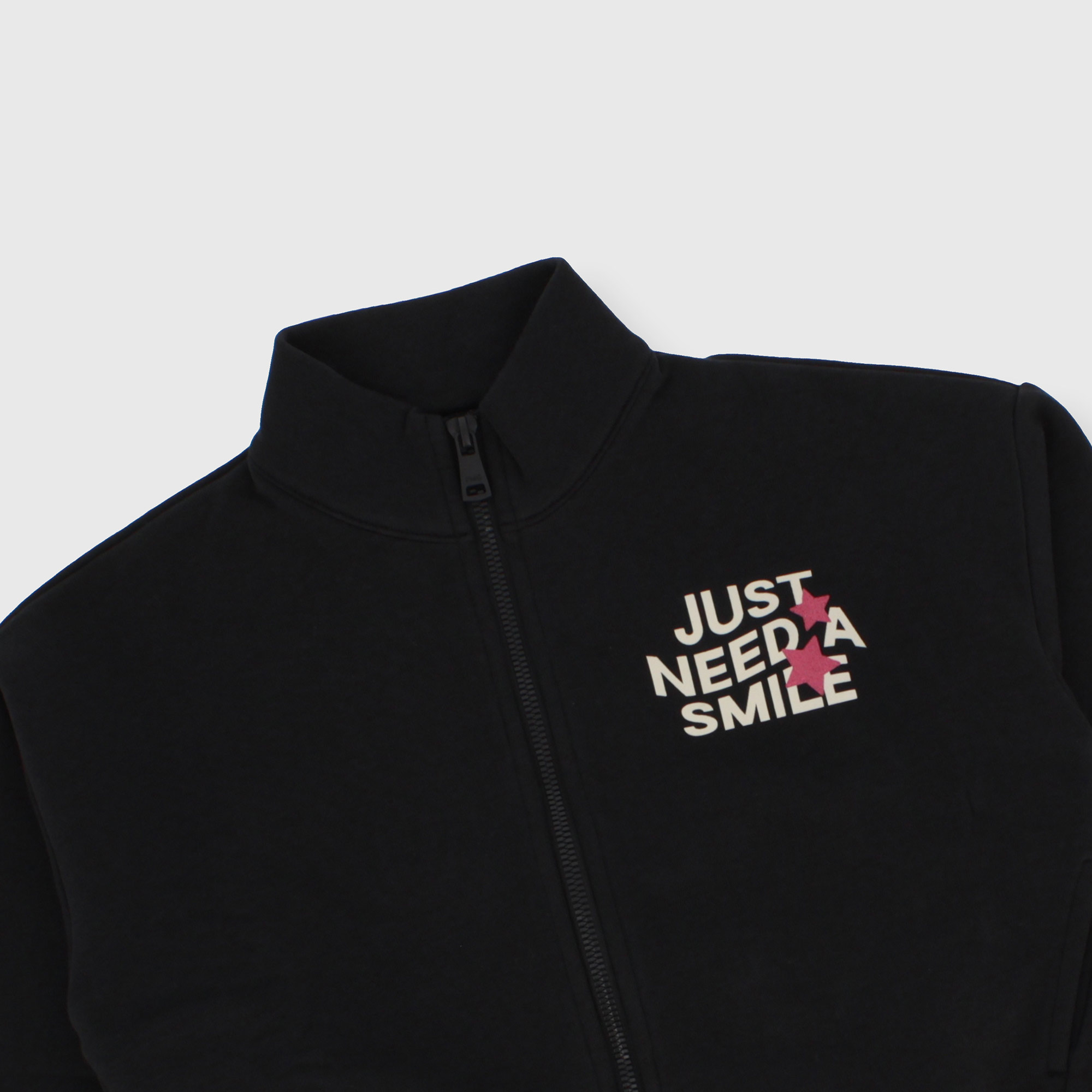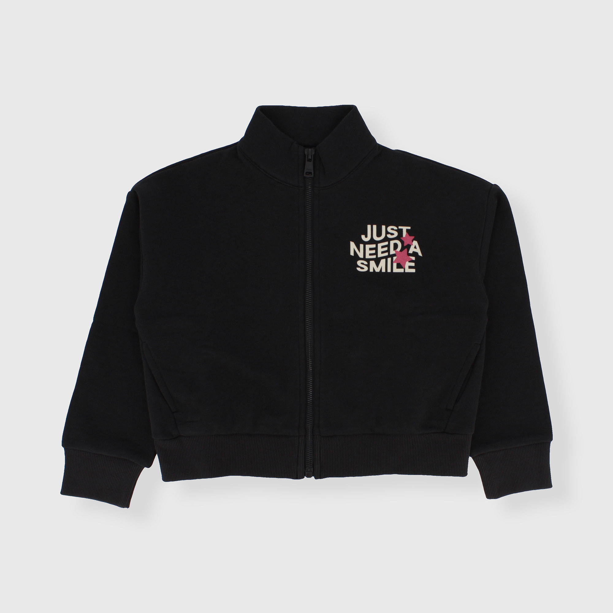 Felpa mezzo collo a maniche lunghe. Chiusura con zip sul davanti. Stampa con dettagli glitter sul davanti e tasche a filetto. Polsini e fondo in costina.