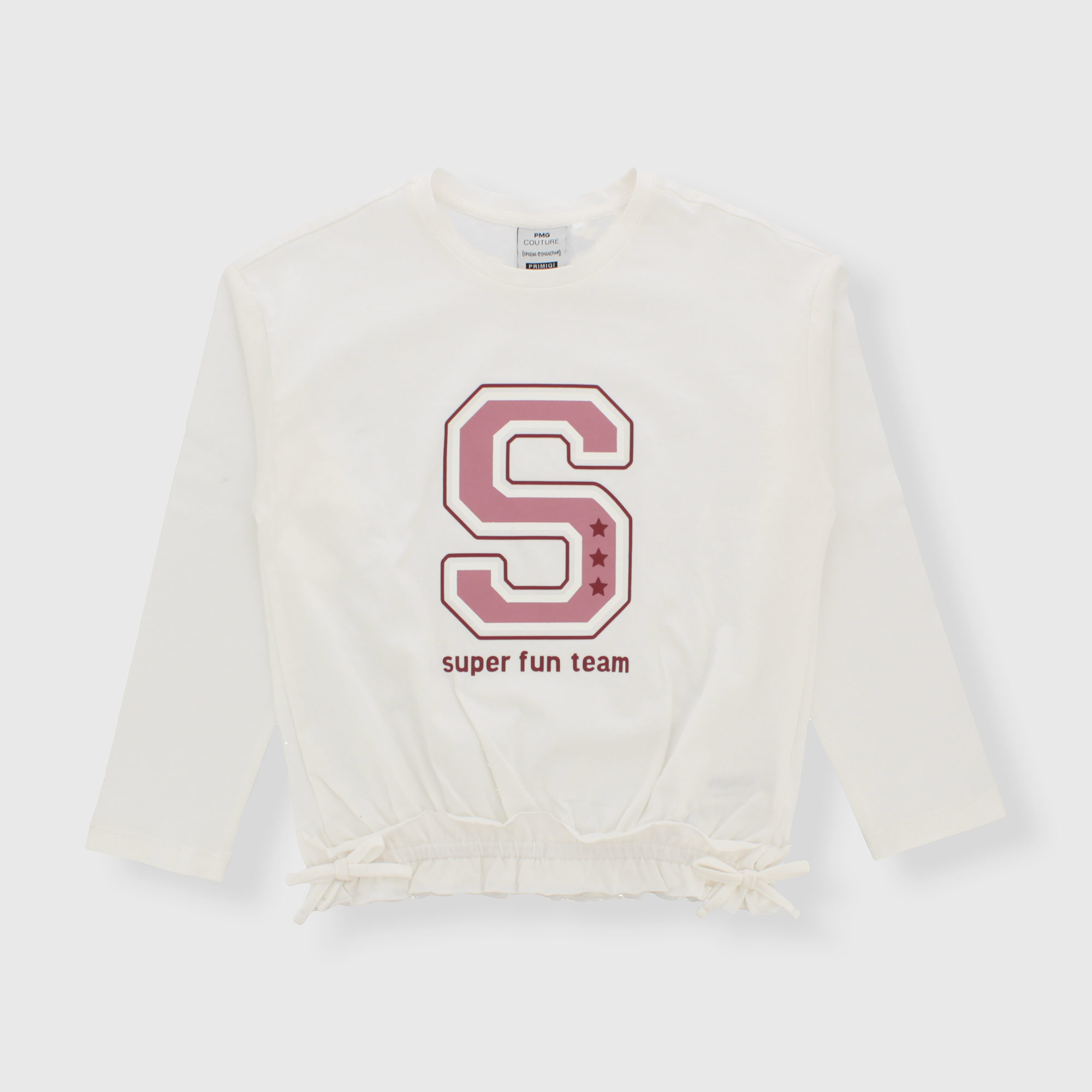 Maglietta in jersey, girocollo, a maniche lunghe. Stampa sul davanti. Fondo arricciato con volants e fiocchetti applicati.