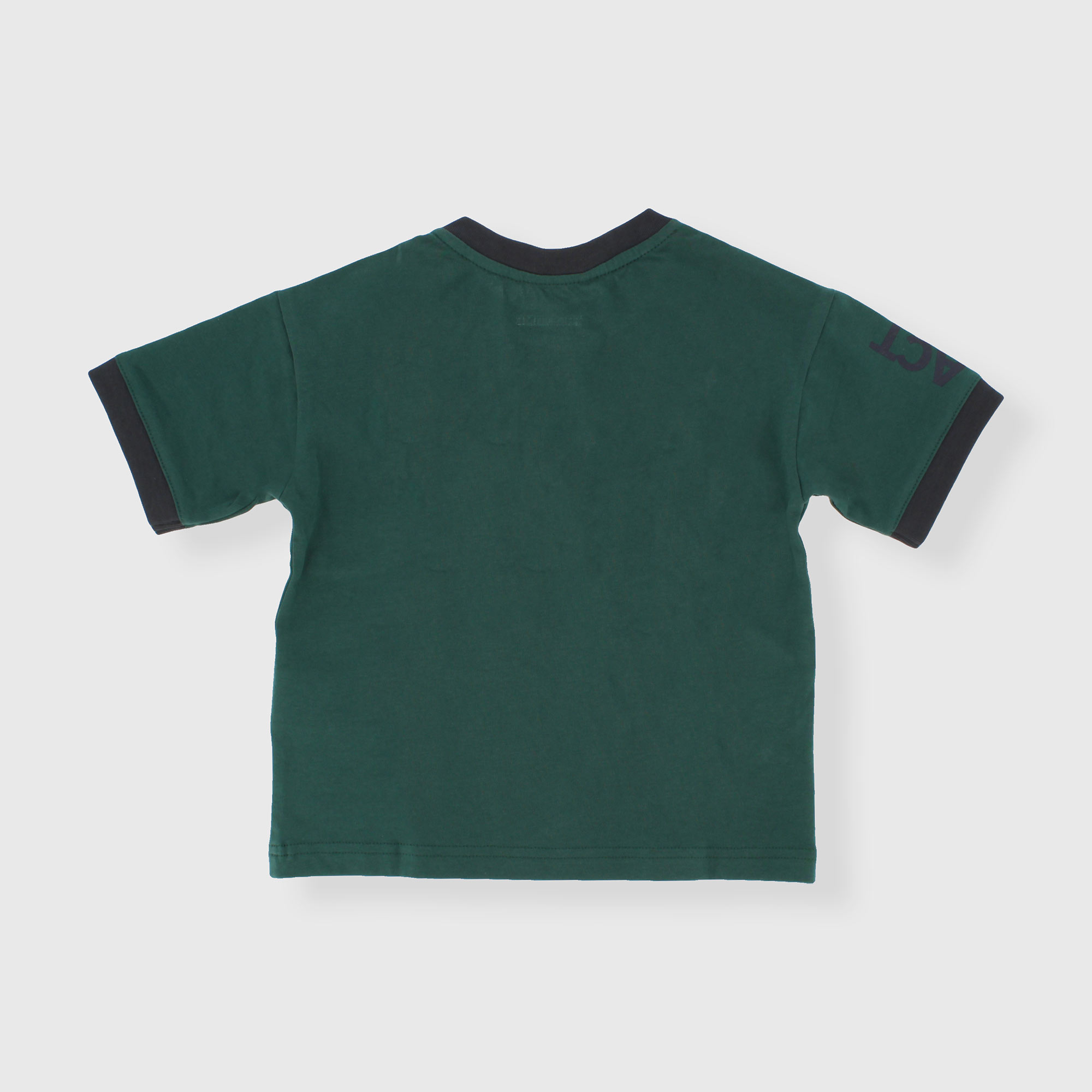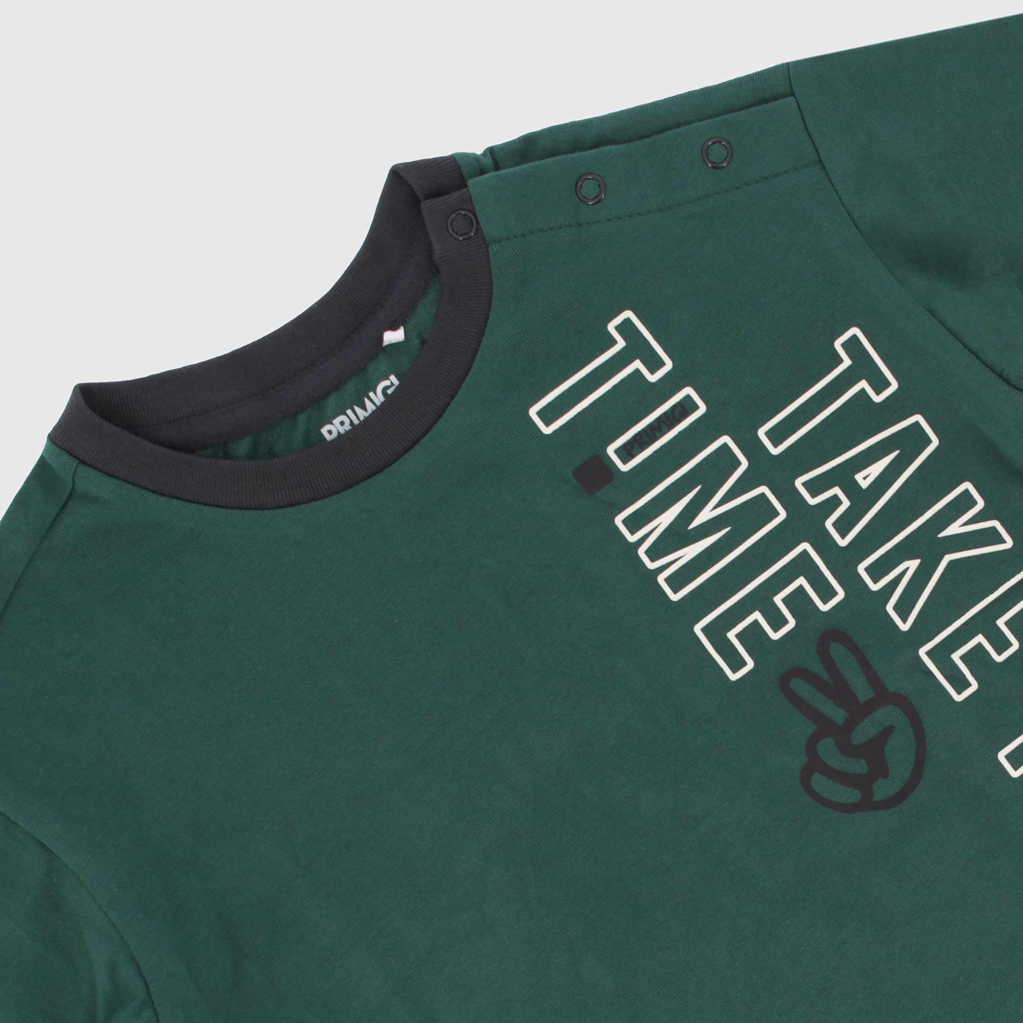 Maglietta in jersey, girocollo, a maniche corte. Chiusura con bottoncini automatici sulla spalla. Stampa sul davanti. Collo e fondo manica a contrasto.