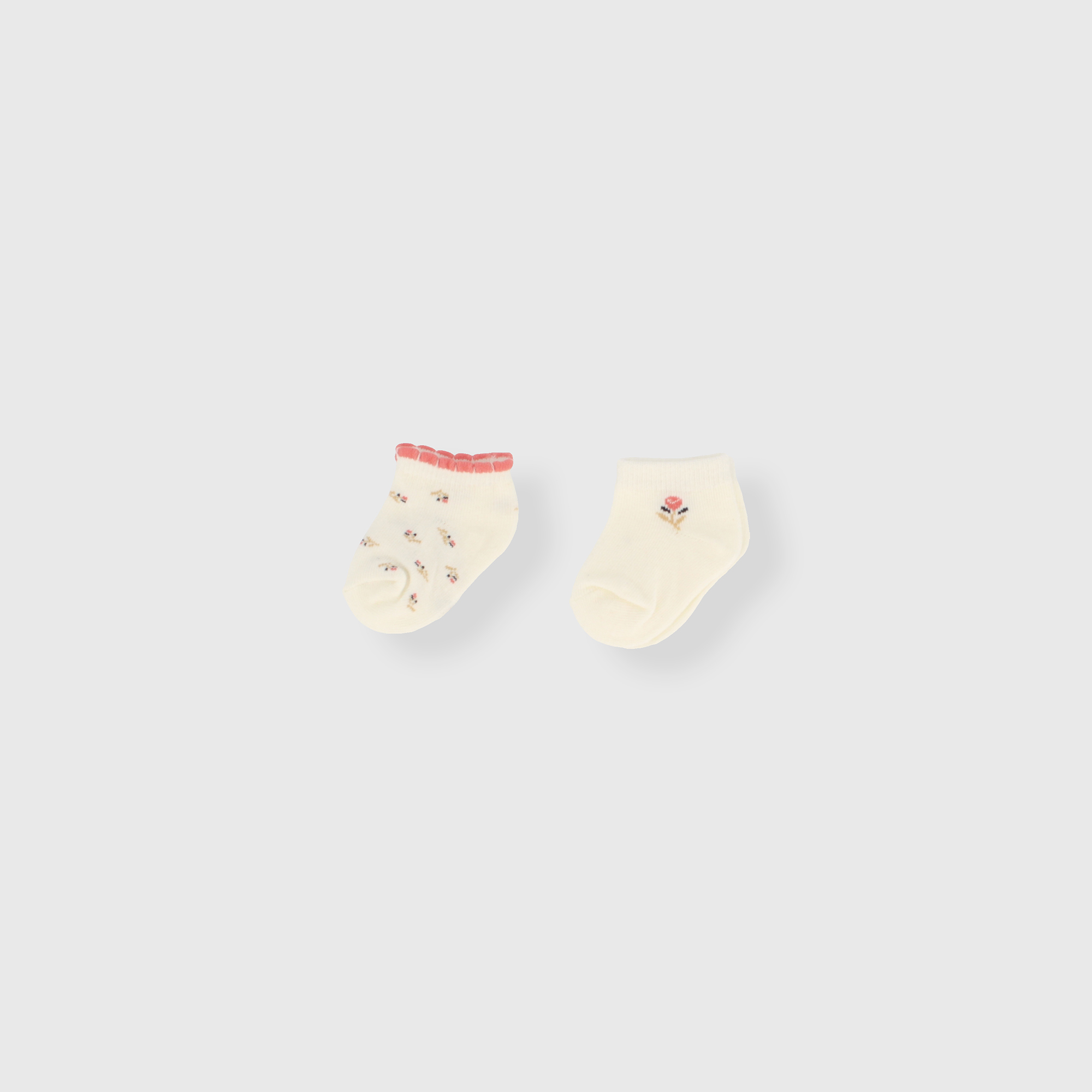 Confezione composta da due paia di calzini corti newborn con motivo fiori. Orli smerlati e bordi elasticizzati.