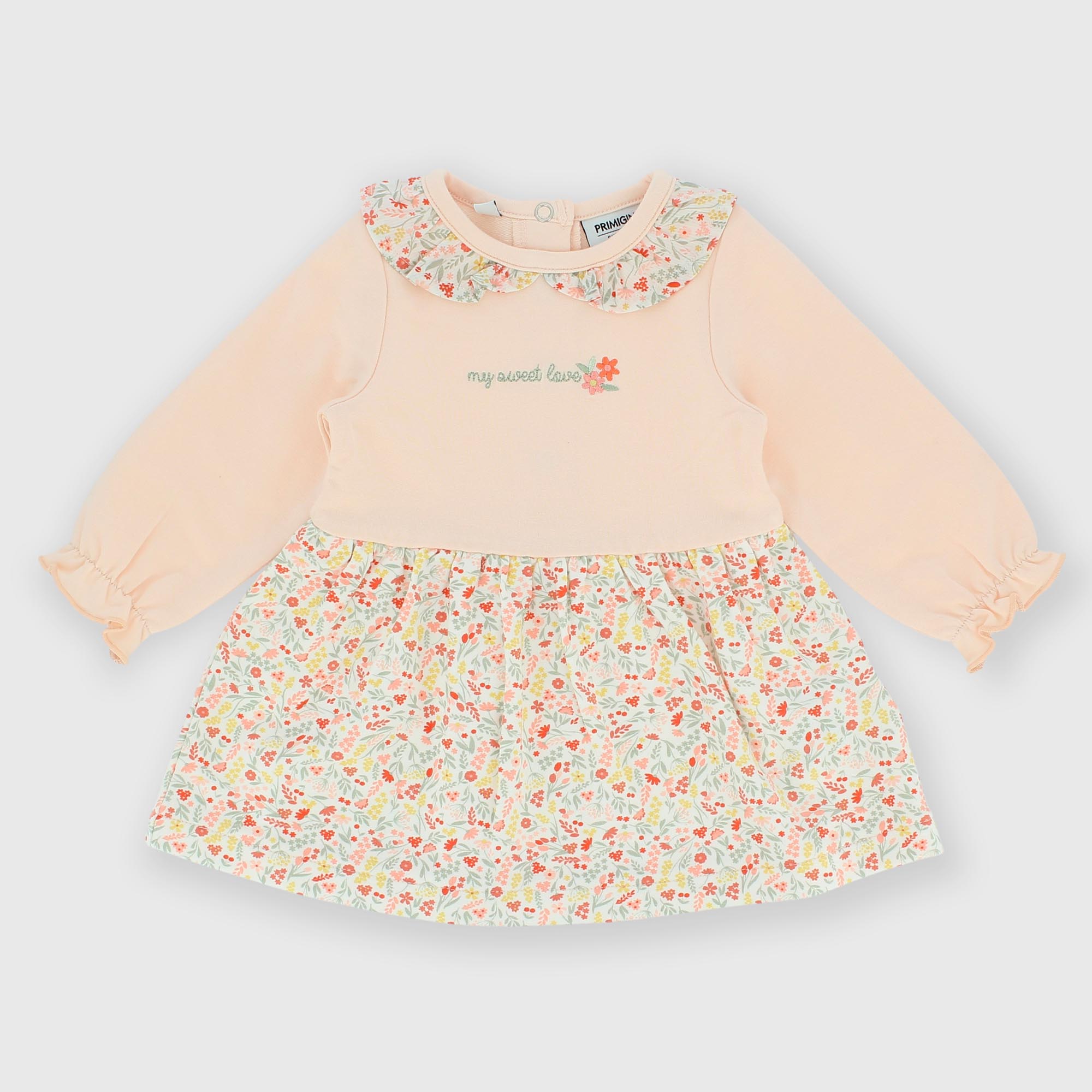 Vestito in felpa con colletto a fiorellini, a maniche lunghe. Chiusura posteriore con bottoni automatici. Ricamo sul davanti e gonna con stampa all-over fiori. Polsini elasticati.